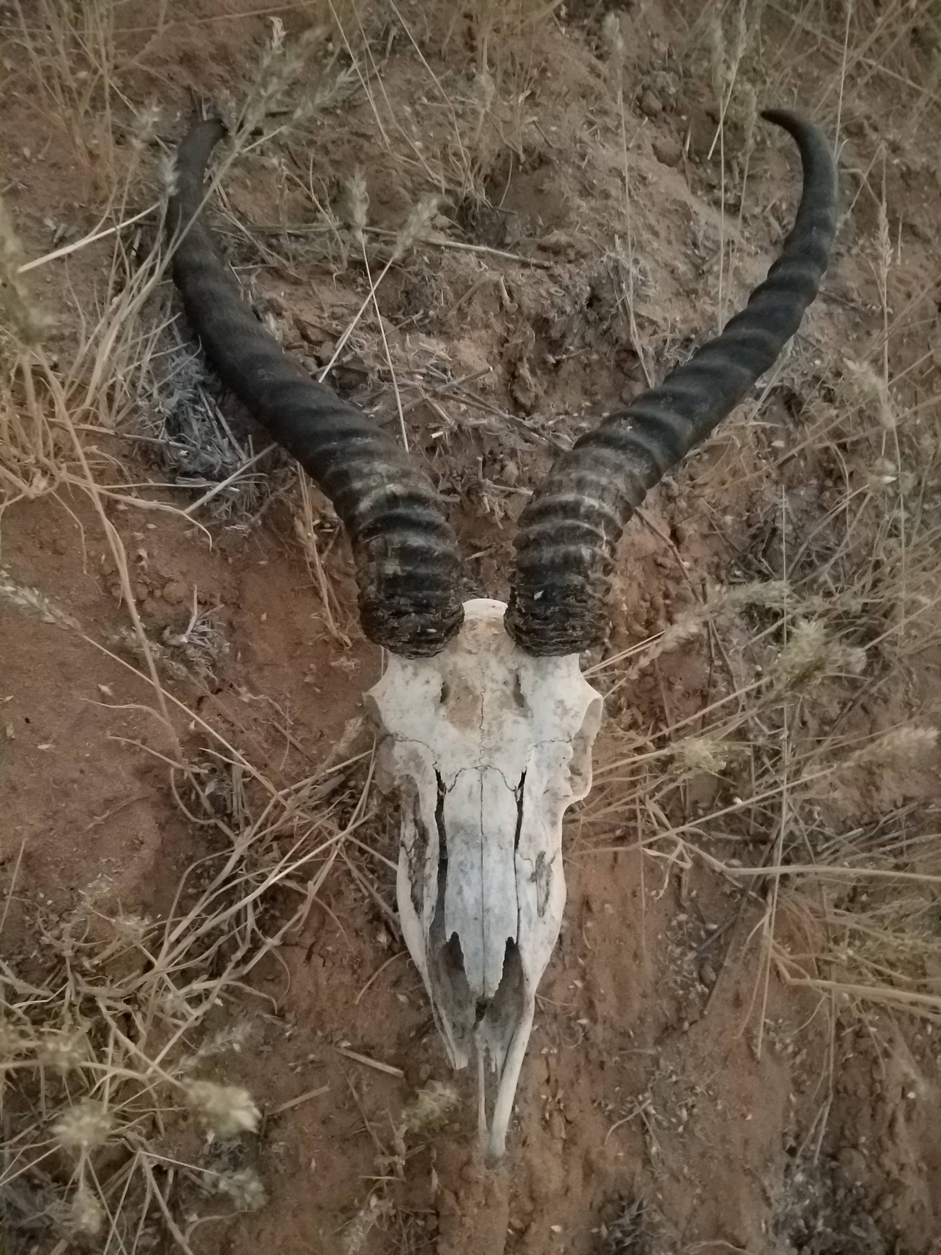 This past week I began exploring more of the reserve. The project has a couple of battery assisted fat tire bikes to take out on the dunes. On an afternoon off, I took a bike out with one of the mole-rat lab volunteers. Our first stop was a watering tank that they call dams here. It’s about 5 feet tall with a diameter of maybe 15 feet. It was full of water and in the middle of it, a dead bird floating face down. We decided to bury it next to the dam and dig it up in a month for the skeleton. I offered the suggestion that we do “bone patrol” every week on the bikes to check dams and trails for dead things, so we’re doing that. I’m not sure if I’ll be the best influence on this kid… but we’ll learn about dead birds and probably get to put together some pretty cool skeletons. Later on in the bike ride we found an ostrich nest. We climbed the fence to have a look and it felt like stepping into Jurassic Park. I half expected to hear the running footsteps of a dinosaur bird charging us as we crouched around the nest. The eggs were still warm. We also spooked a herd of wildebeest, saw a gemsbok majestically silhouetted against a sunset sky, and found a springbok skeleton. I have the springbok skull with horns and vertebrae in my room. So far I think gemsbok are my favorite ungulate here. They’re large and solitary, have a cool black and white face, and crazy long horns (average length is 85 cm).