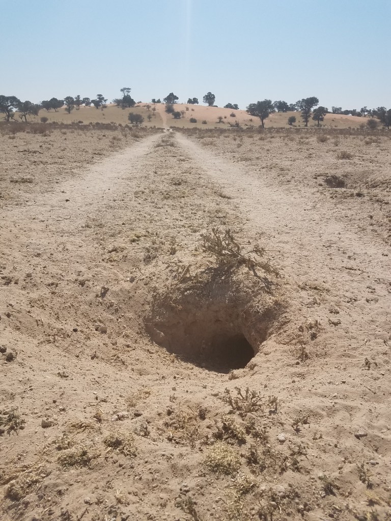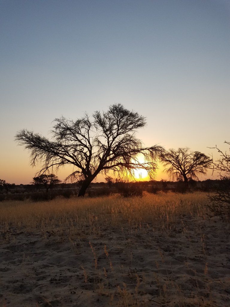 On a recent exploratory hike around the reserve, with my pal who I wrote about losing the lug nuts in the last post, we noticed this burst in life out of the desert. And death. We were looping around the back of Dune to Nowhere (popular place to gather to watch the sunset) and found a huge dead eland. Elands are the largest species of antelope on the reserve, I remember seeing one on my first day here and not having a clue what it was. They have a hump behind their head and a large flabby neck and horns. This one must have died a long time ago – the hide was dried out and as tight as a drum around its skeleton. We found it at the base of a small bush, curled up like it had just laid down to sleep and never woke up. It was strange that nothing had scavenged it – I’m still trying to figure out why it would have been left alone for so long. Curious how the inside of the animal had remained I flipped over the body by the horns –it was crazy how light it was! Maybe 30 lbs for an animal that weighs 1000 – 1500 lbs! Underneath was rich soil and in the middle, an angry scorpion. Pincers out and stinger curled above it’s back, it was not amused we intruded on his home. We gently replaced the carcass back over it. Finn considered his footwear choice (barefoot), shrugged, and we continued to follow game trails to avoid acacia thorns. A few hundred feet from the eland, we breached another dune and were crossing some flat shrubby land when the Earth broke under my feet. It felt like breaking through ice and my reaction was to spread out my arms to catch myself. Once everything stilled, I had plunged into the ground up to my hip and my foot was still dangling. Not knowing who lived in the burrow I had just busted through the roof of, I scrambled out quickly. It was probably a porcupine burrow, though even after further inspection we couldn’t determine for sure. Sorry dude!