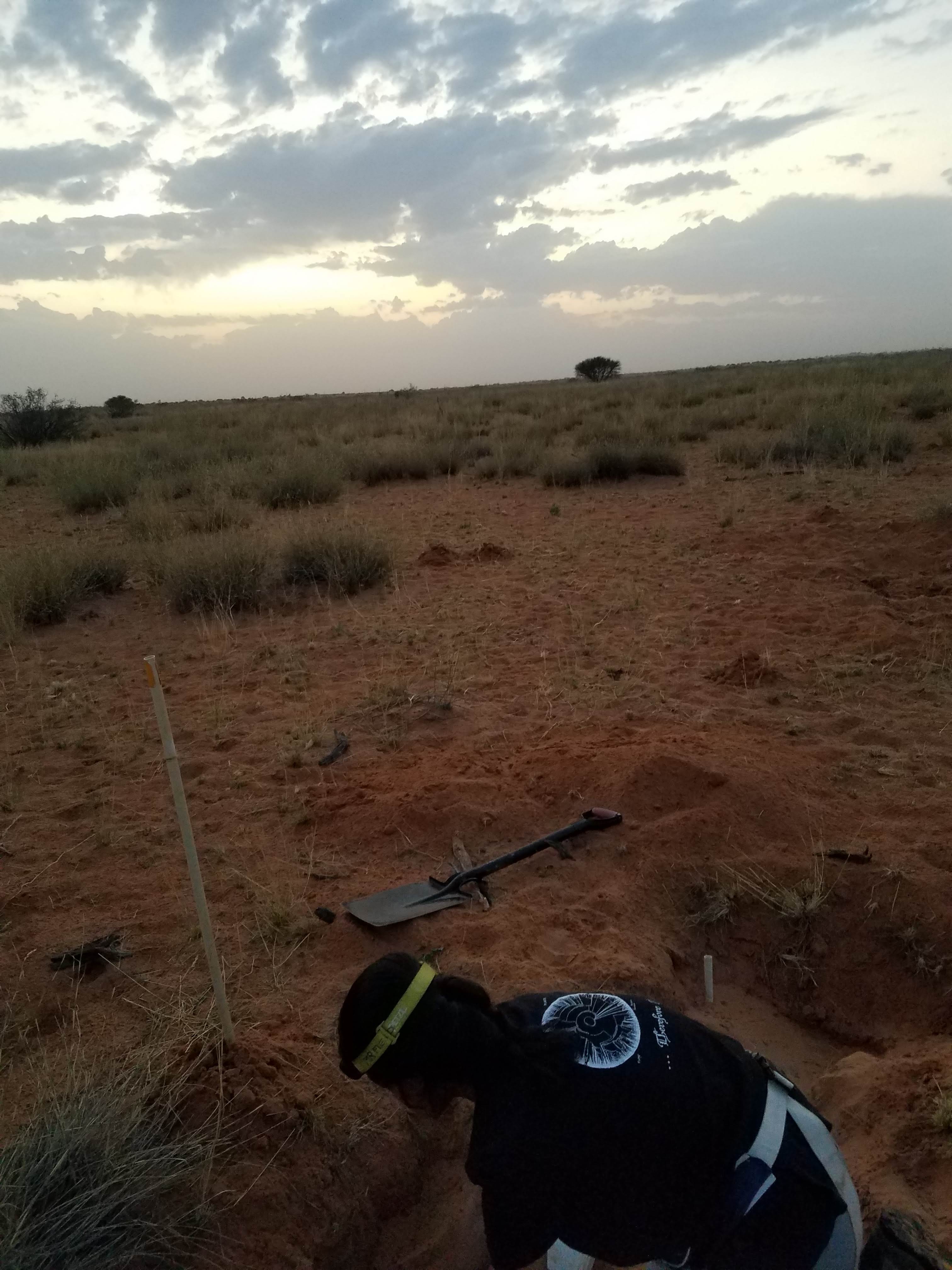A 4 AM wake up alarm drowned out those thoughts though and I found myself with a shovel in hand digging sand before the sun came up. I offered to help out the wild molerat team in digging, finding tunnels, and laying traps. Molerat colonies are found by the mounds of perpetually wet looking sand that they push up to the surface in mounds as they dig their tunnel systems and “sweep” the sand out of the way. We found a series of mounds and tried to play connect the dots to determine where the highest probability would be to find a tunnel. The two of us worked on our own predictions and fortunately both struck tunnel systems at the same time. It was sort of like digging for treasure but instead of a THUNK of hitting something solid like a treasure chest, your shovel hits an air pocket and collapses the sand. They had been working on this colony for the last week trying to find tunnels so we were pretty excited to be successful. We got the live traps laid just after taking a break to watch a stunning sunrise and before the heat of the day hit (lately 100+F). This morning I was told the traps were successful and they had already caught 5 animals from the colony for sampling and measurements. They said I was good luck and that I should go out with them more often though I think they really would just take any extra hands to dig – it’s tough work.
