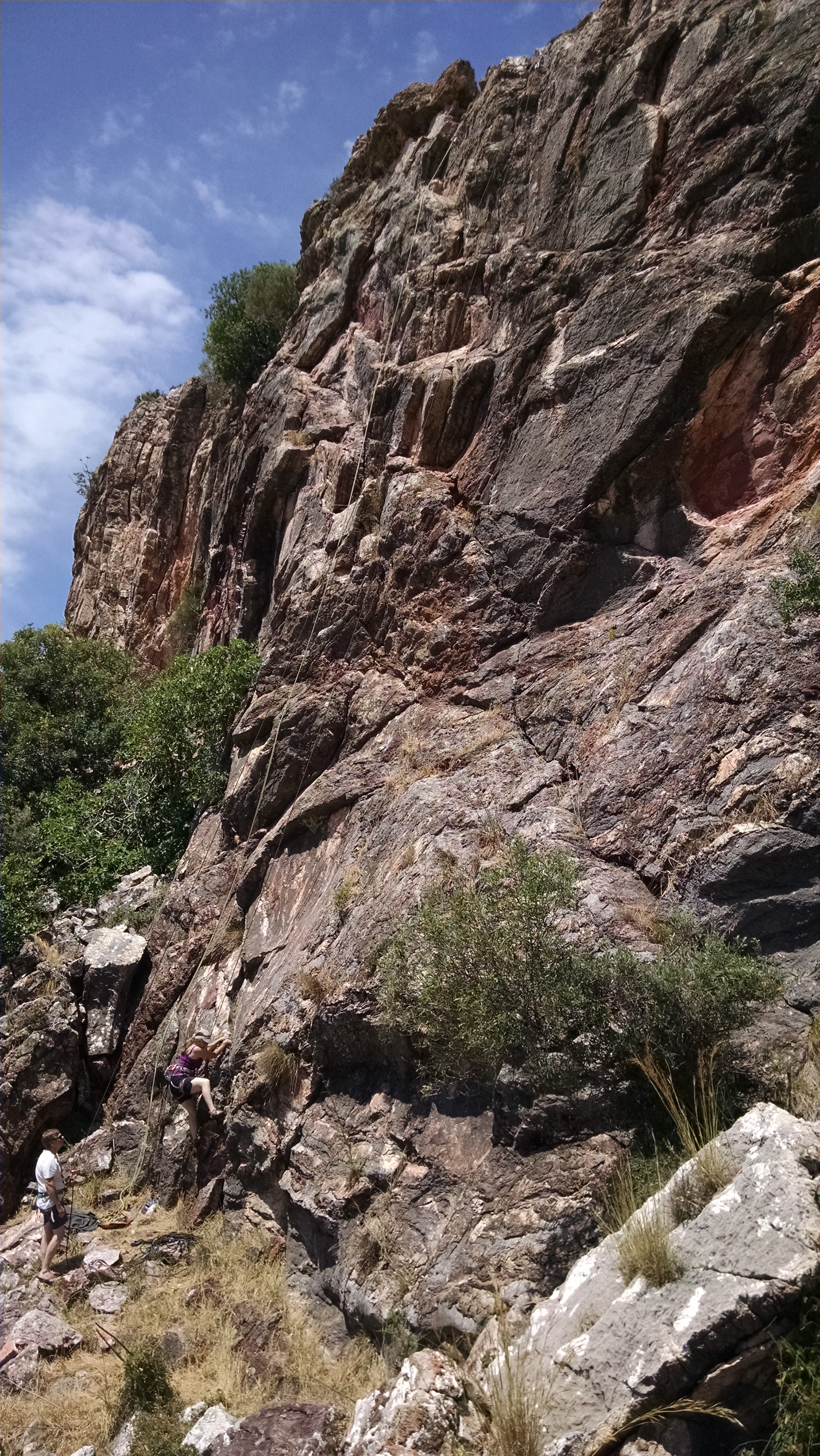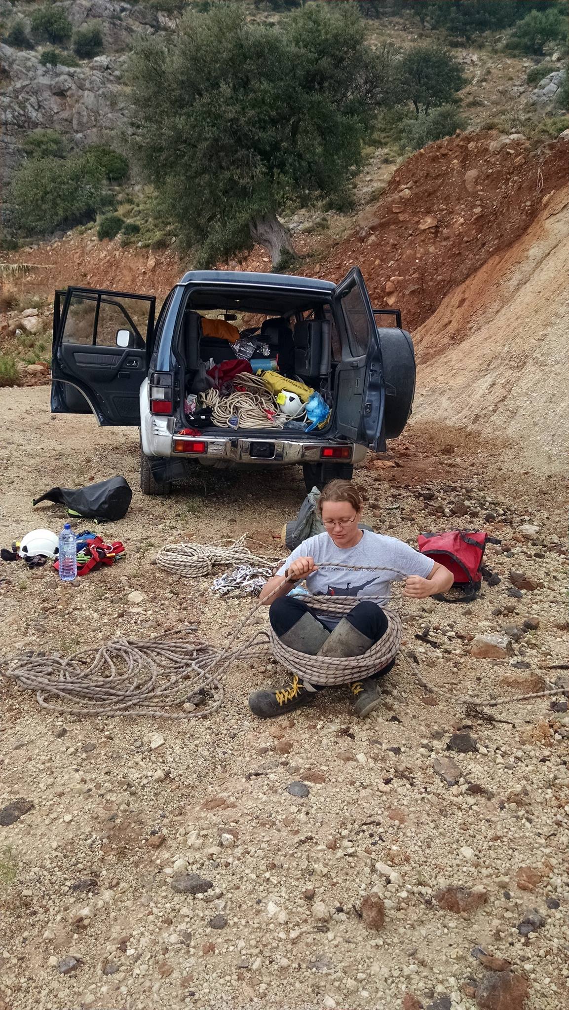 I had crammed my climbing shoes and harness into that tiny day pack hoping we would get a chance to climb somewhere on the island. We woke up early – as the week progressed with late nights and early mornings, at times I would feel the fatigue making me melt into the floor. We had limited time together here though and were determined to fill it as much as we could, even if it meant burning the torch at both ends. Or as we called it, red lining. We drove the Xeros Valley in the rain to meet up with some of Lauren’s friends – older from England, to climb. Andrew and Janet drove an old white jeep that was really really cool. We met them at a little shop where we put a bandaid on being tired with some coffee. At this point, the car locks were stripped and broken. To unlock the car, we would manually unlock the trunk, crawl across our shit ton of gear in the back, flop over the back seat, stretch and flip up the back door lock, then retreat back without knocking everything over or getting stuck among our ropes. We were becoming experts in this routine but it required more effort than we had energy to expend on. It was my turn so I asked Lauren to hold my coffee while I threw myself like a beached whale across the back seat. We hauled ourselves back into the car and headed out following the white jeep.