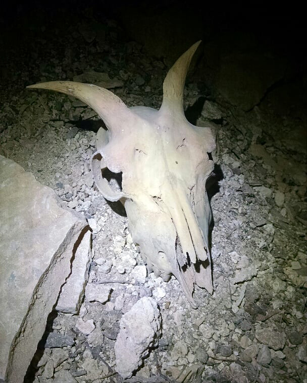 Salih was Lauren’s academic correspondence in Cyprus. They had met in Atlanta, Georgia near her home, after he learned of her caving experience and graduate studies. Salih was older now and Cyan joked that he moved at turtle-speed. After finding the entrance of the cave, we descended into the cold exhales. We checked Salih’s spider traps which looked sort of like jars of anti-freeze to entice the insects. Exploring the cave, we found old bulbs, flares, and batteries from the original exploration. Debris now gathered in the cave, we debated about what the significance of the artifacts were. Should they be a part of a museum or discarded as trash since it was left behind garbage after all? We saw natural formations in the cave like soda straws and helectophiles formed by pressure within the cave. I took a photo of a goat skull as we exited.
