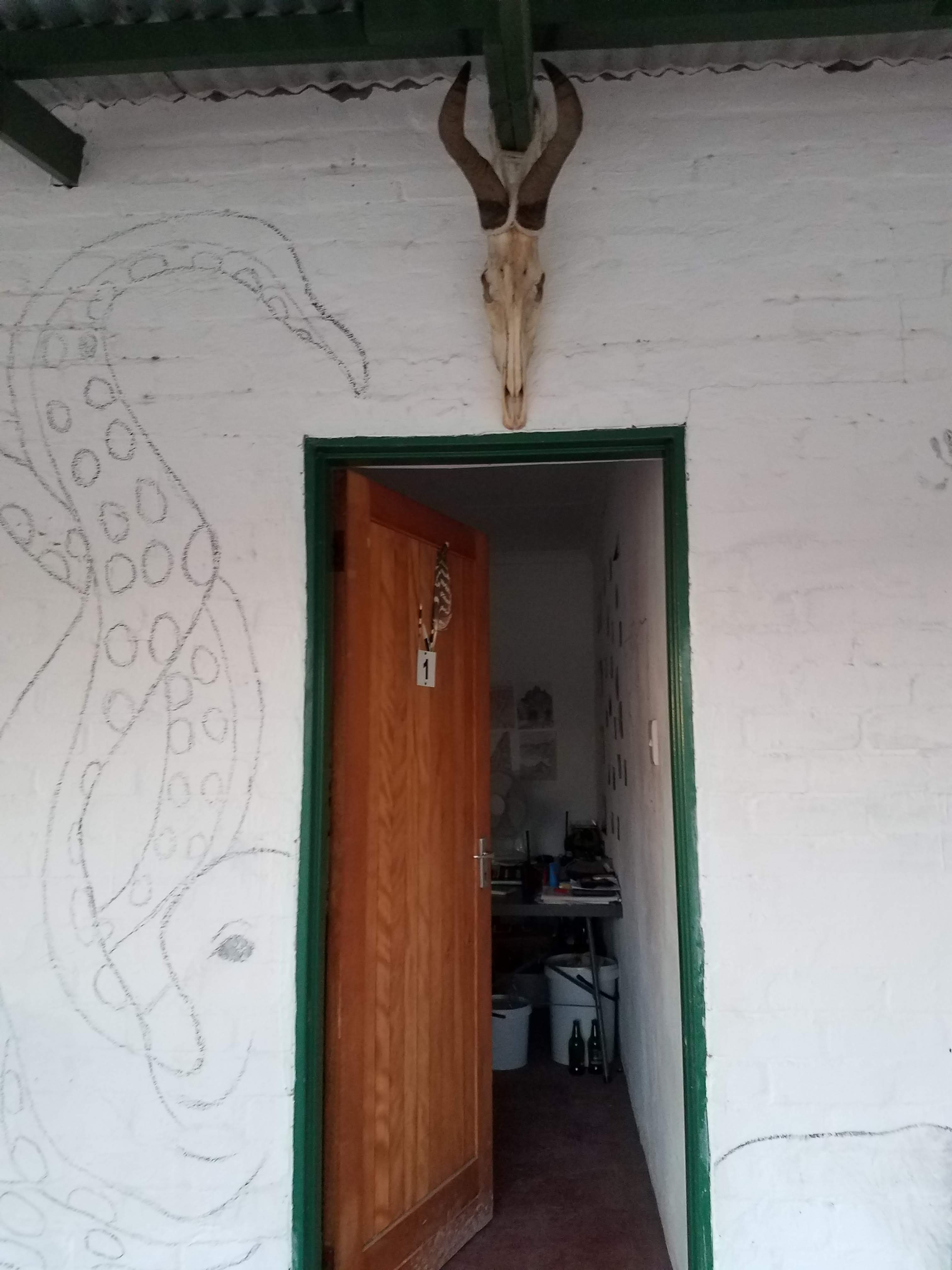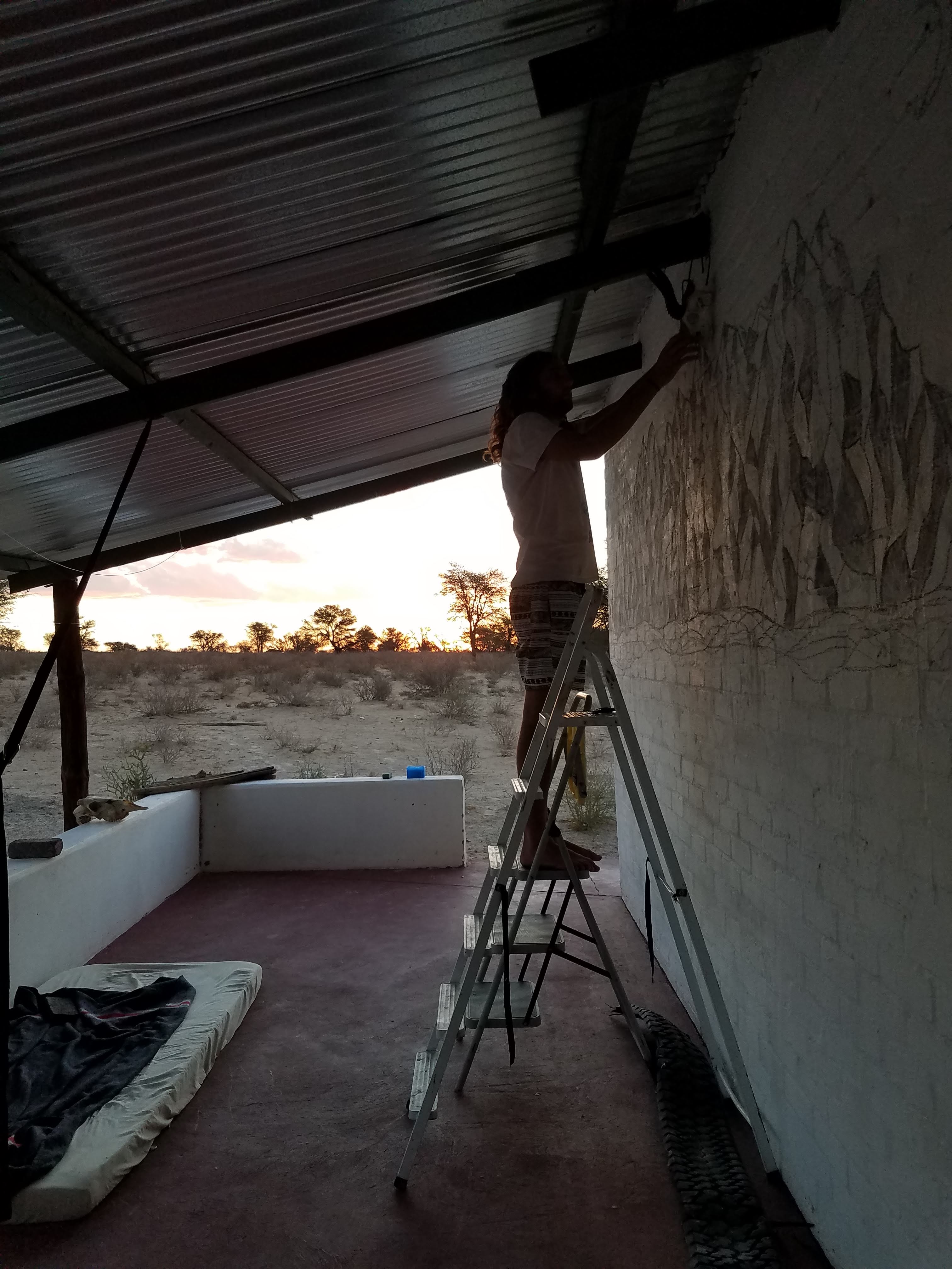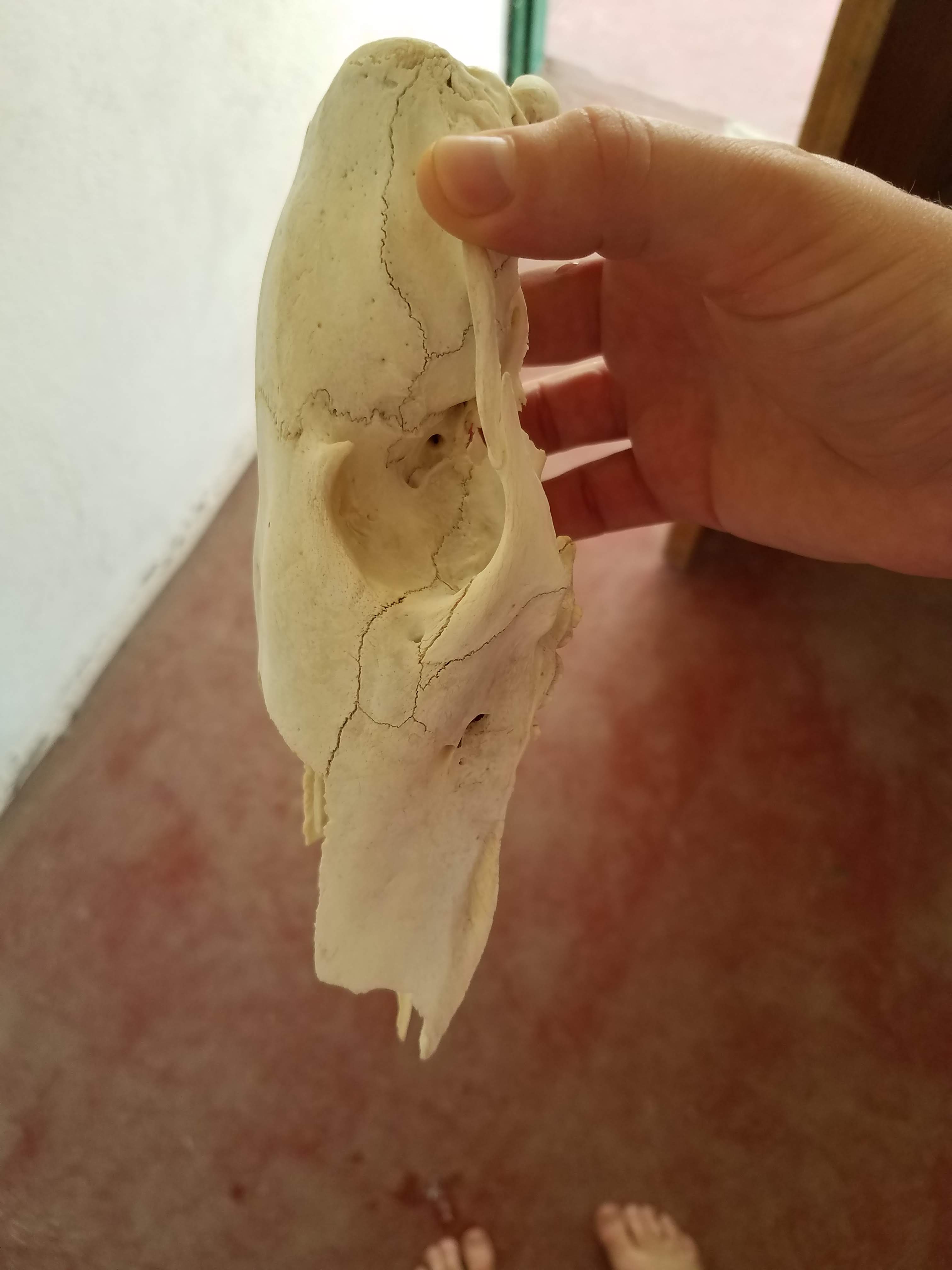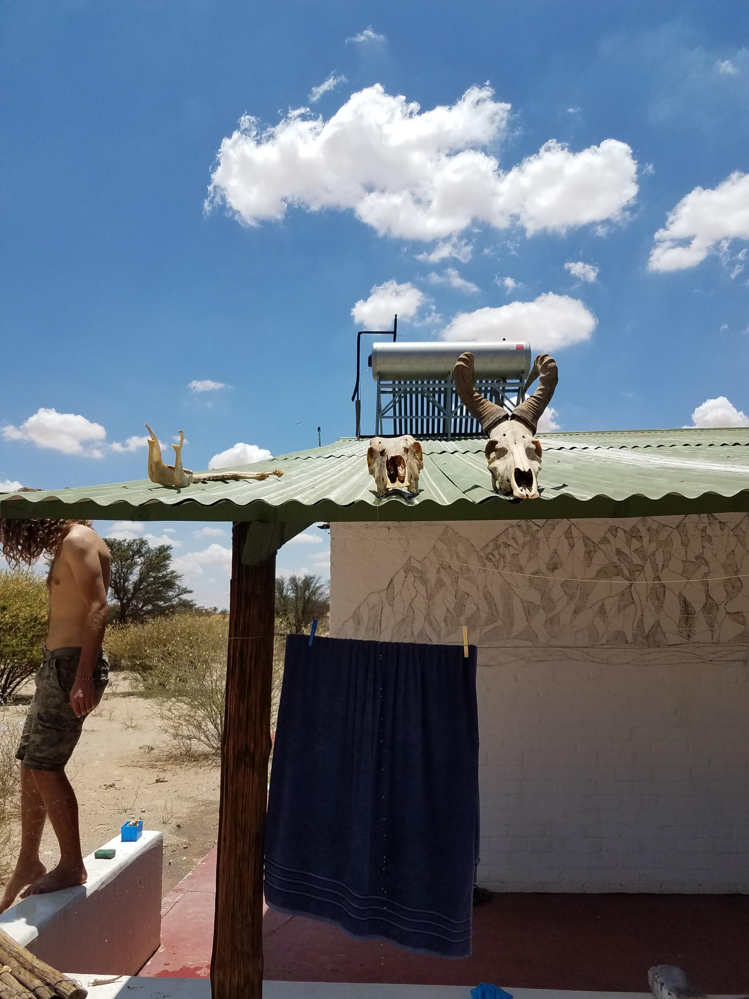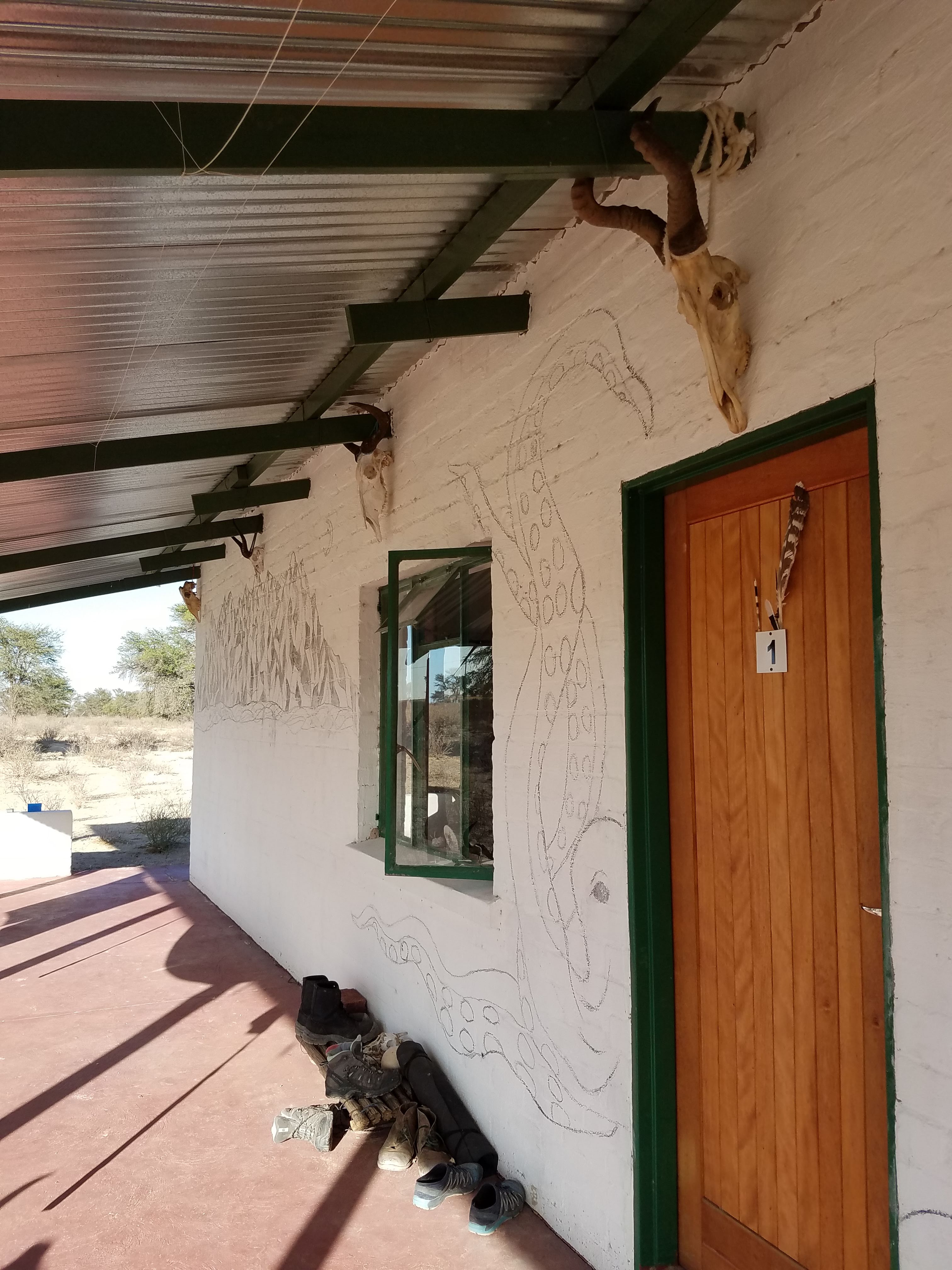 We harvested the skulls from the garden! After collecting heads of carcasses with various degrees of decomposition, we buried them under the leak off my roof leaving nature to do her thing – microbes and bugs break down the flesh still attached to the bone. We were pleased to dig them up yesterday and find clean, white bone with even the small bony protrusions and knobs intact. Even the teeth! We unearthed the hartebeest and oryx head buried under the leak and the two cat skulls were removed from the empty pipette tip box I had them soaking with bleach in. The cat skulls are quite delicate and the mandibles are detached under the incisor teeth, so that will have to be glued. I’m not sure yet what to do with the cat skulls but the antelope skulls were planned ahead of time to be hung on the rafters above my room. Hartebeest over the door, wildebeest over the window, springbok hung between the mountain peaks drawn on the wall, and the partial oryx skull at the very end (hoping to replace this with a better one). The hartebeest skull in particular looks demonic and with all of the skulls lined up, it looks like I’m calling on all of the horned spirits of the Kalahari to haunt my room. I think everyone here appreciates bones, but I’ve been told my obsession with them is a little strange.