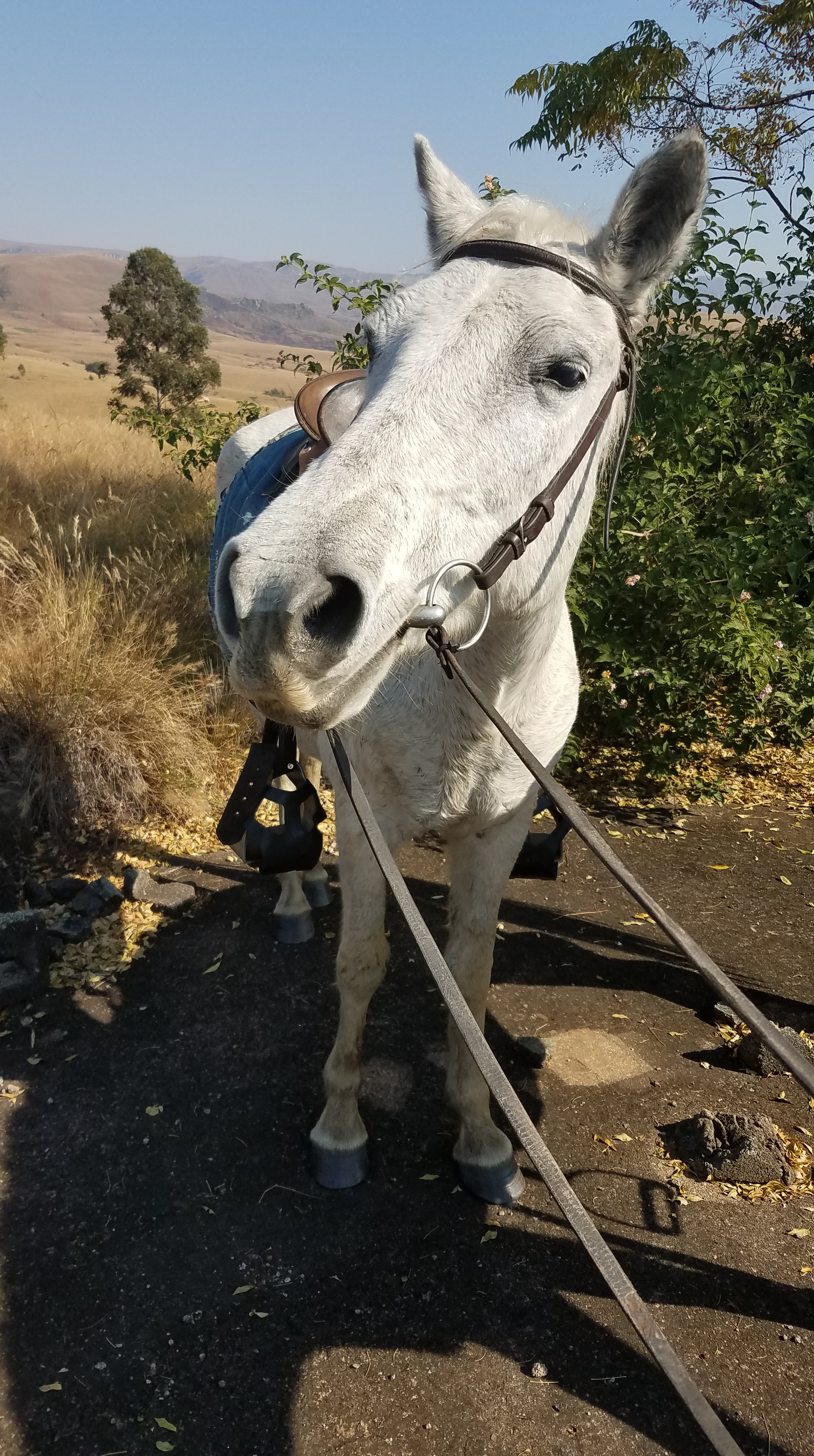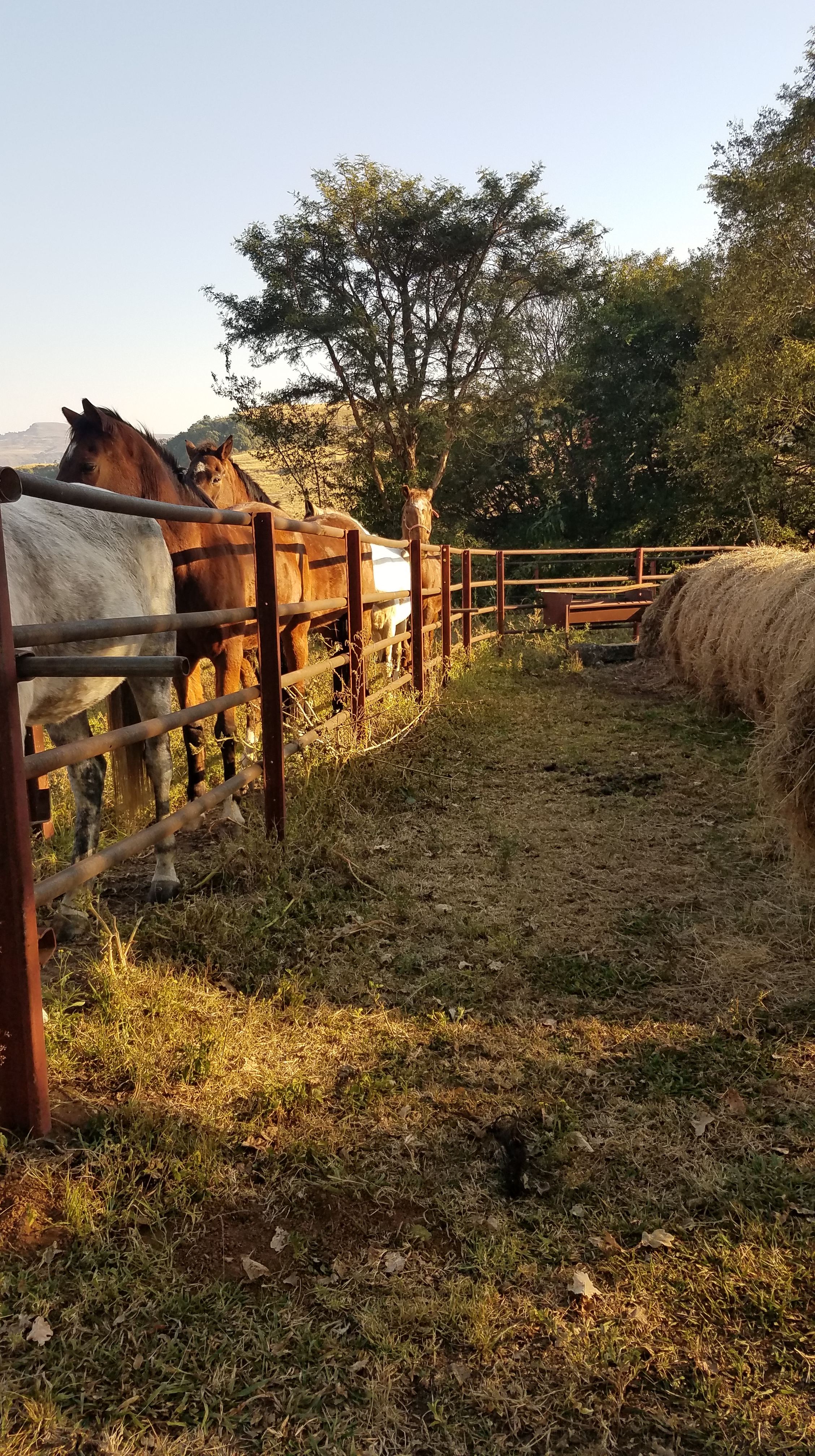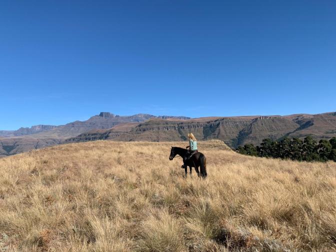 I wake up around 6:30 AM every morning and dress in farm or riding clothes. If I’m riding, I’ll wear my Kuhl hiking pants, a light flannel shirt, since it gets hot during the day but I’m trying to somewhat protect my skin from the sun, and my hiking boots. If I’m working: Carhart pants, a trashed tshirt, and waders. I join my Workaway host, Karl, in his house for breakfast, which is usually strawberry yogurt, granola, and a banana. We talk about the plan for the day and have about 3 cups of instant coffee, then catch up with the staff when they arrive around 7:30 AM. Nathi is a local in the valley and has worked on the farm for the last 10 years. He works every weekday as a horse groom, rider, guide, and all around farm hand. Spha and Robert have only recently started work after the lockdown. Spha helps with the riding and training, and Robert manages the gardens. Some days we all work together, like today when we burned some of the fields to make fire-breaks. We let the horses out at 8 AM; Nathi and I feed all the horses with their own feedbag. Recently, we’ve been administering routine antiparasitic medicine – this involves paste to be decanted in their mouth and an injection of about 15 mL of Dectomax into the muscle of their neck. I was a little intimidated doing the injections at first, but now it feels natural (and I only hit a vein once). Then we catch the two we’ll ride. We groom them, trim their hooves, check for ticks, and saddle up. The tack is stored in an old transport container – about 20 saddles and bridles. I use an Australian style saddle and Nathi uses a minimalist English style saddle. Tea time is from 9 – 9:30 AM, coffee for me. Then we head off for a two hour ride either lapping the 1 hour trail twice, or branching off in different directions from the farm to roam the hills for a couple of hours. Each trail is named for the tour that tourists would use, though I only know them for exercising the horses. When we get to the fields, Nathi always asks to race the horses. I know whether he knows if he has the faster horse, but I always say yes anyway. Then we fly.