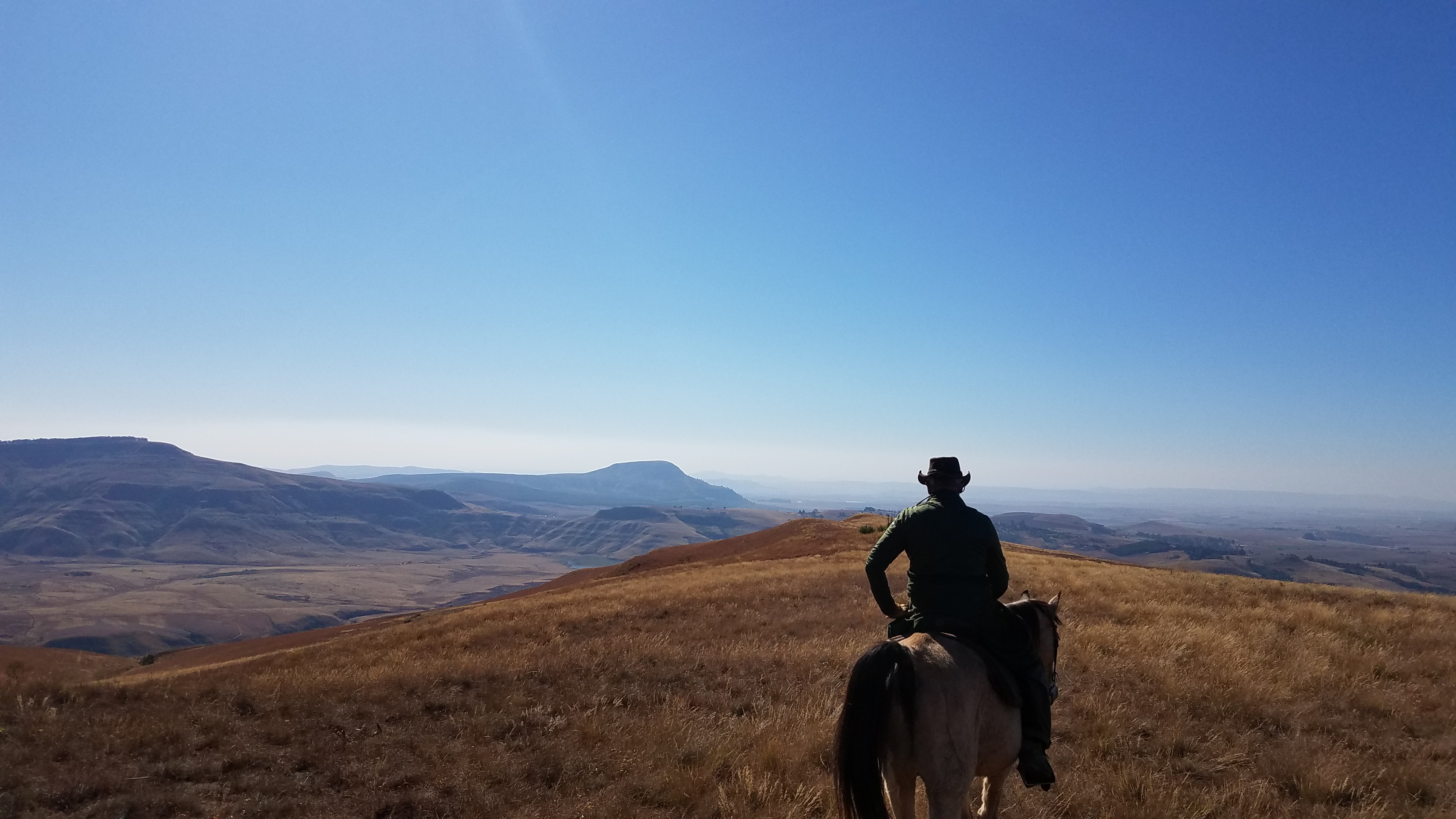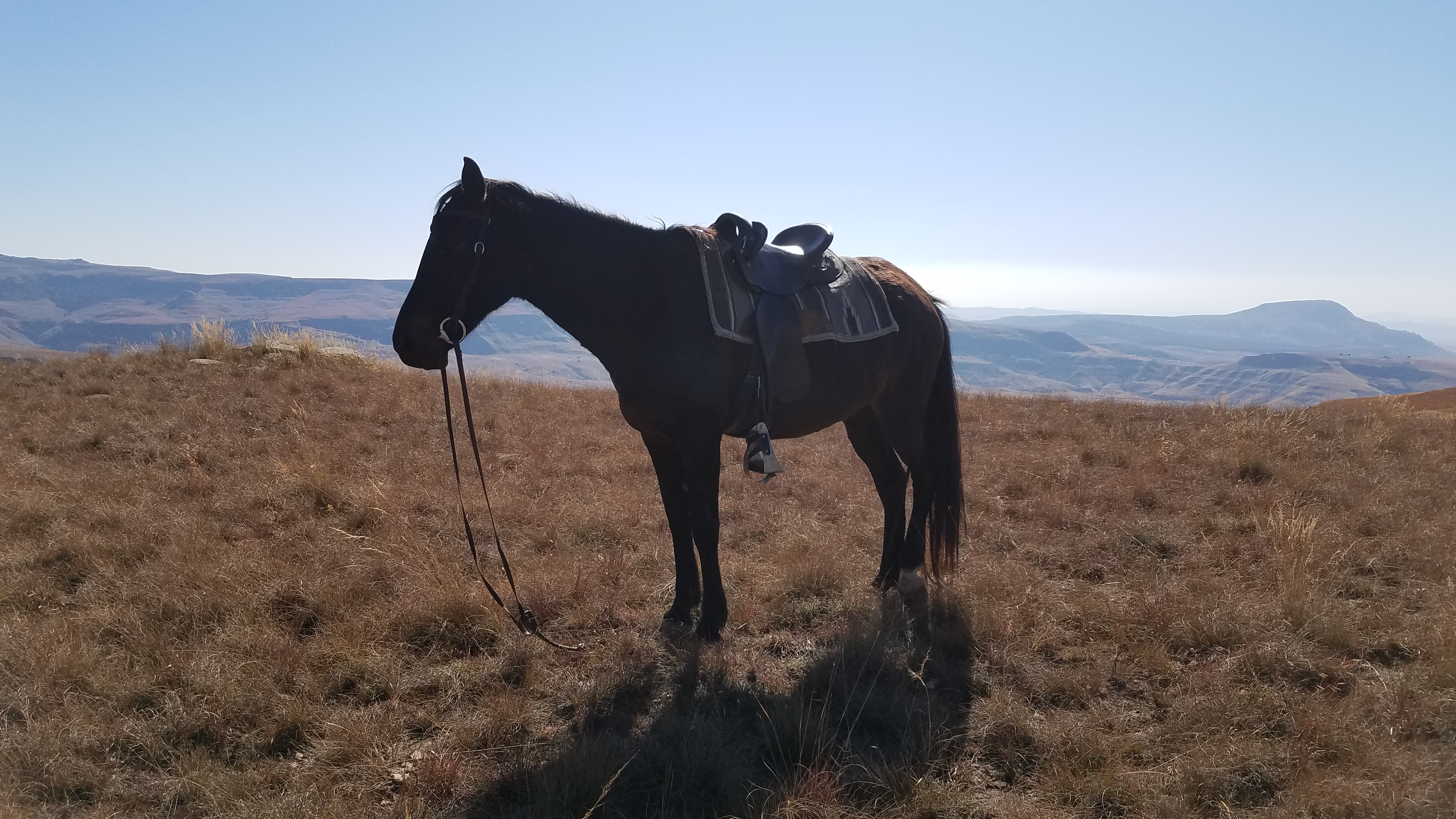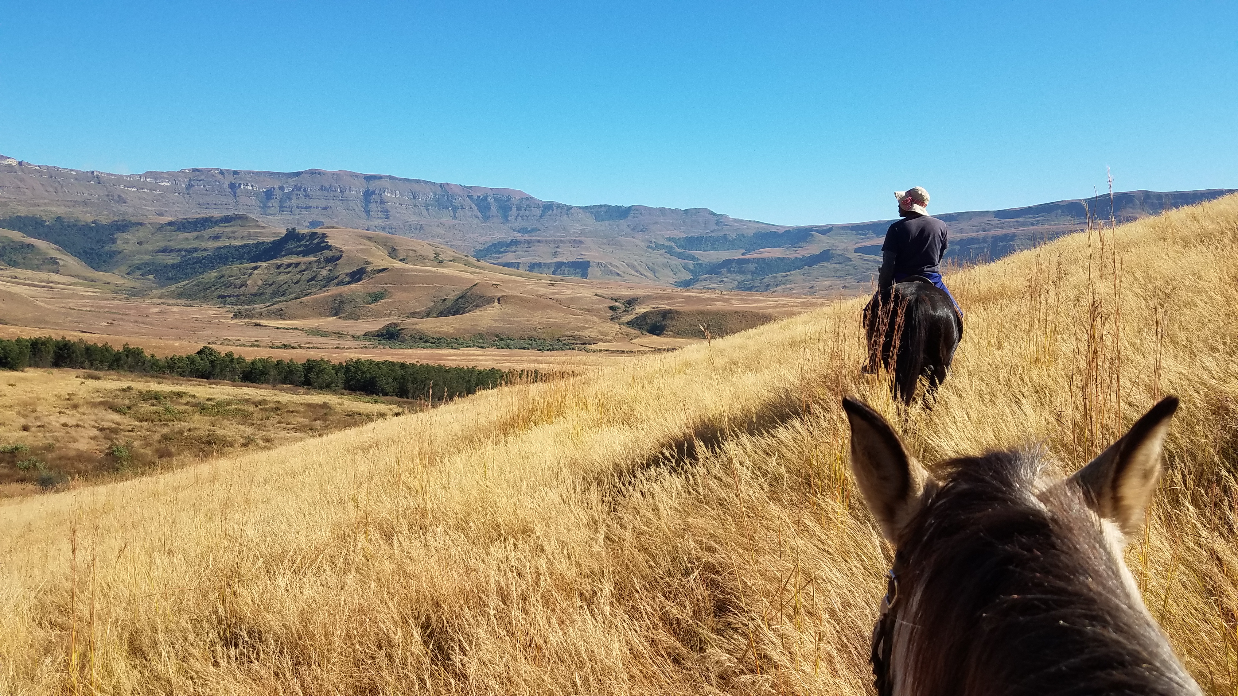 I wake up around 6:30 AM every morning and dress in farm or riding clothes. If I’m riding, I’ll wear my Kuhl hiking pants, a light flannel shirt, since it gets hot during the day but I’m trying to somewhat protect my skin from the sun, and my hiking boots. If I’m working: Carhart pants, a trashed tshirt, and waders. I join my Workaway host, Karl, in his house for breakfast, which is usually strawberry yogurt, granola, and a banana. We talk about the plan for the day and have about 3 cups of instant coffee, then catch up with the staff when they arrive around 7:30 AM. Nathi is a local in the valley and has worked on the farm for the last 10 years. He works every weekday as a horse groom, rider, guide, and all around farm hand. Spha and Robert have only recently started work after the lockdown. Spha helps with the riding and training, and Robert manages the gardens. Some days we all work together, like today when we burned some of the fields to make fire-breaks. We let the horses out at 8 AM; Nathi and I feed all the horses with their own feedbag. Recently, we’ve been administering routine antiparasitic medicine – this involves paste to be decanted in their mouth and an injection of about 15 mL of Dectomax into the muscle of their neck. I was a little intimidated doing the injections at first, but now it feels natural (and I only hit a vein once). Then we catch the two we’ll ride. We groom them, trim their hooves, check for ticks, and saddle up. The tack is stored in an old transport container – about 20 saddles and bridles. I use an Australian style saddle and Nathi uses a minimalist English style saddle. Tea time is from 9 – 9:30 AM, coffee for me. Then we head off for a two hour ride either lapping the 1 hour trail twice, or branching off in different directions from the farm to roam the hills for a couple of hours. Each trail is named for the tour that tourists would use, though I only know them for exercising the horses. When we get to the fields, Nathi always asks to race the horses. I know whether he knows if he has the faster horse, but I always say yes anyway. Then we fly.