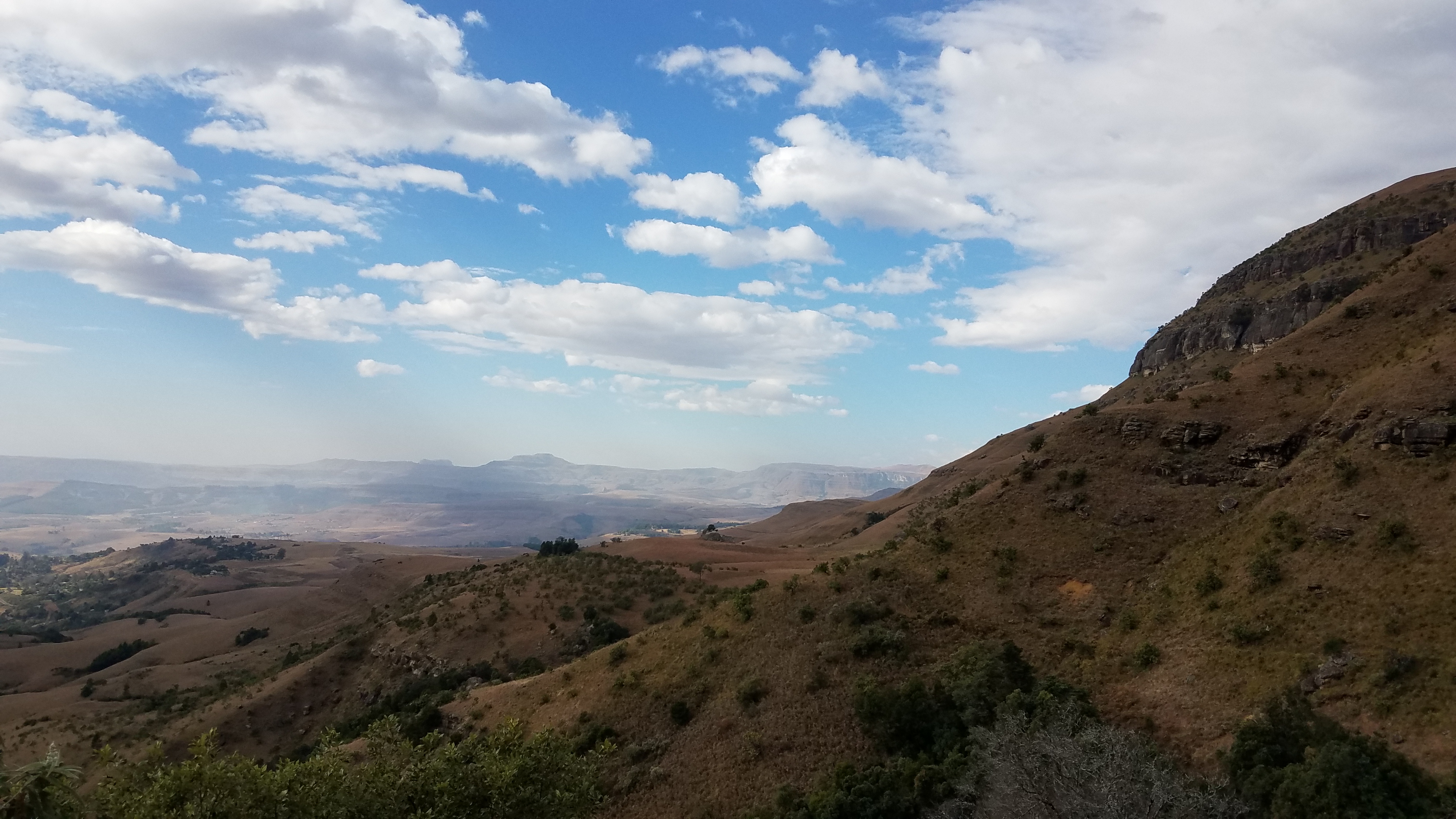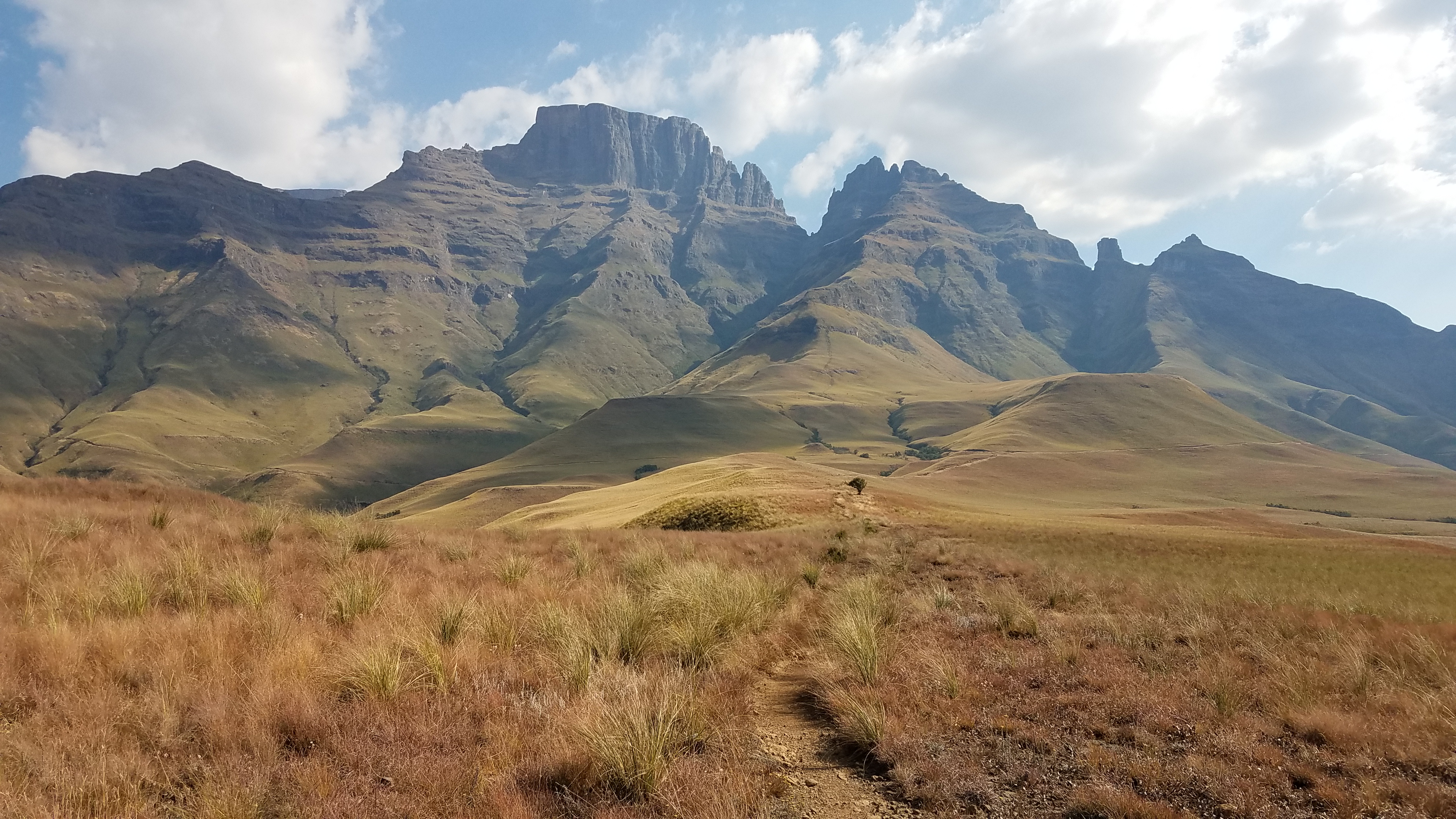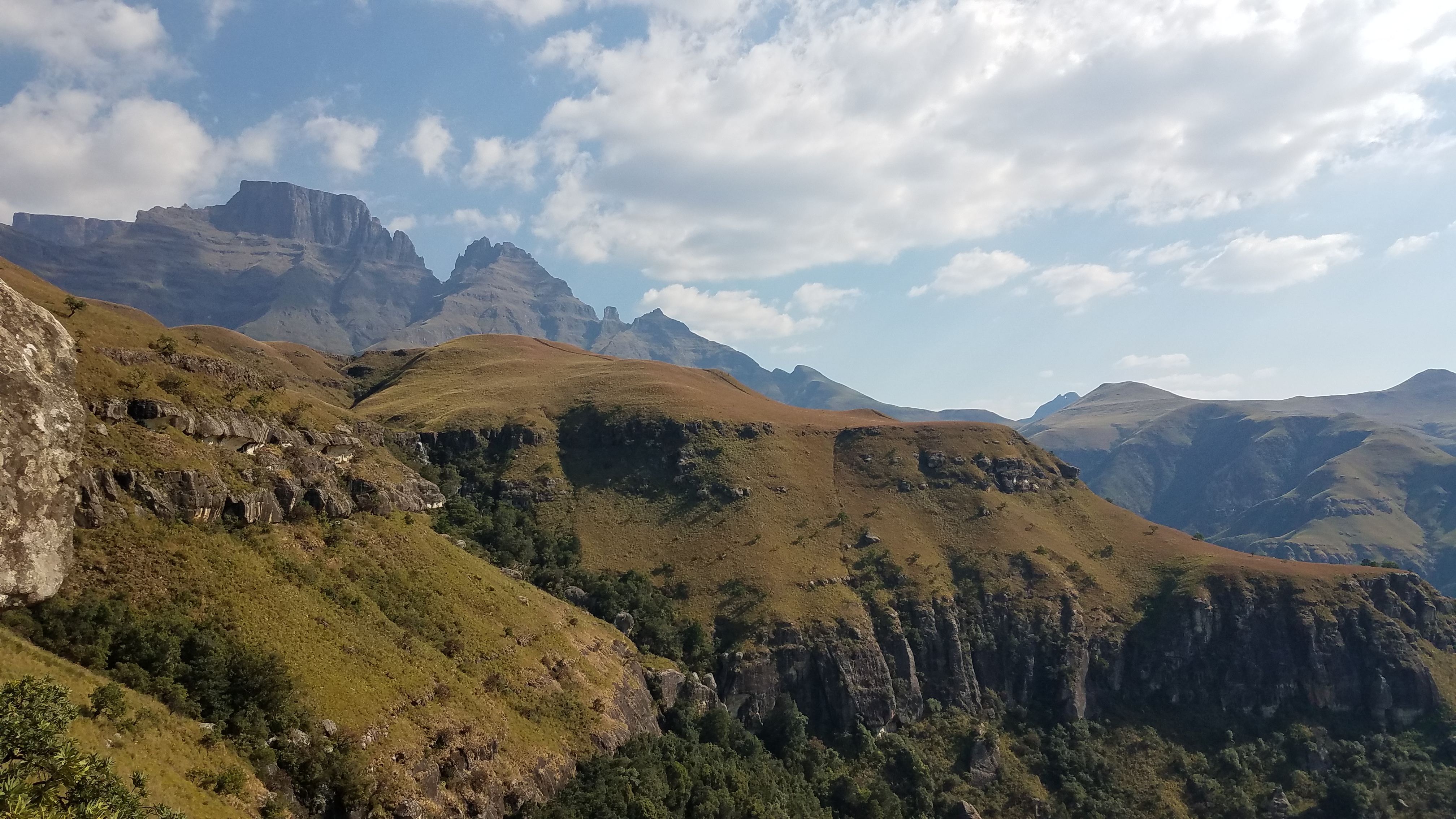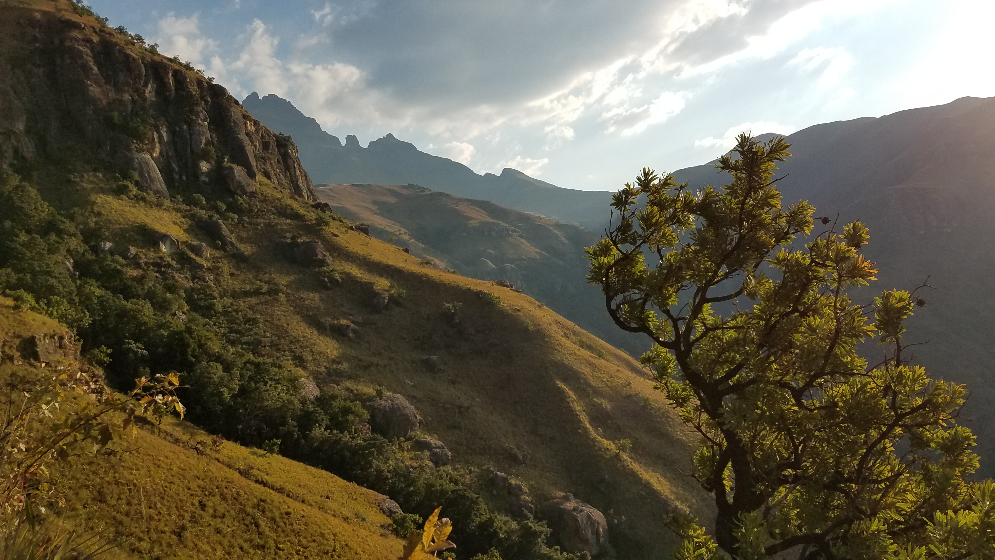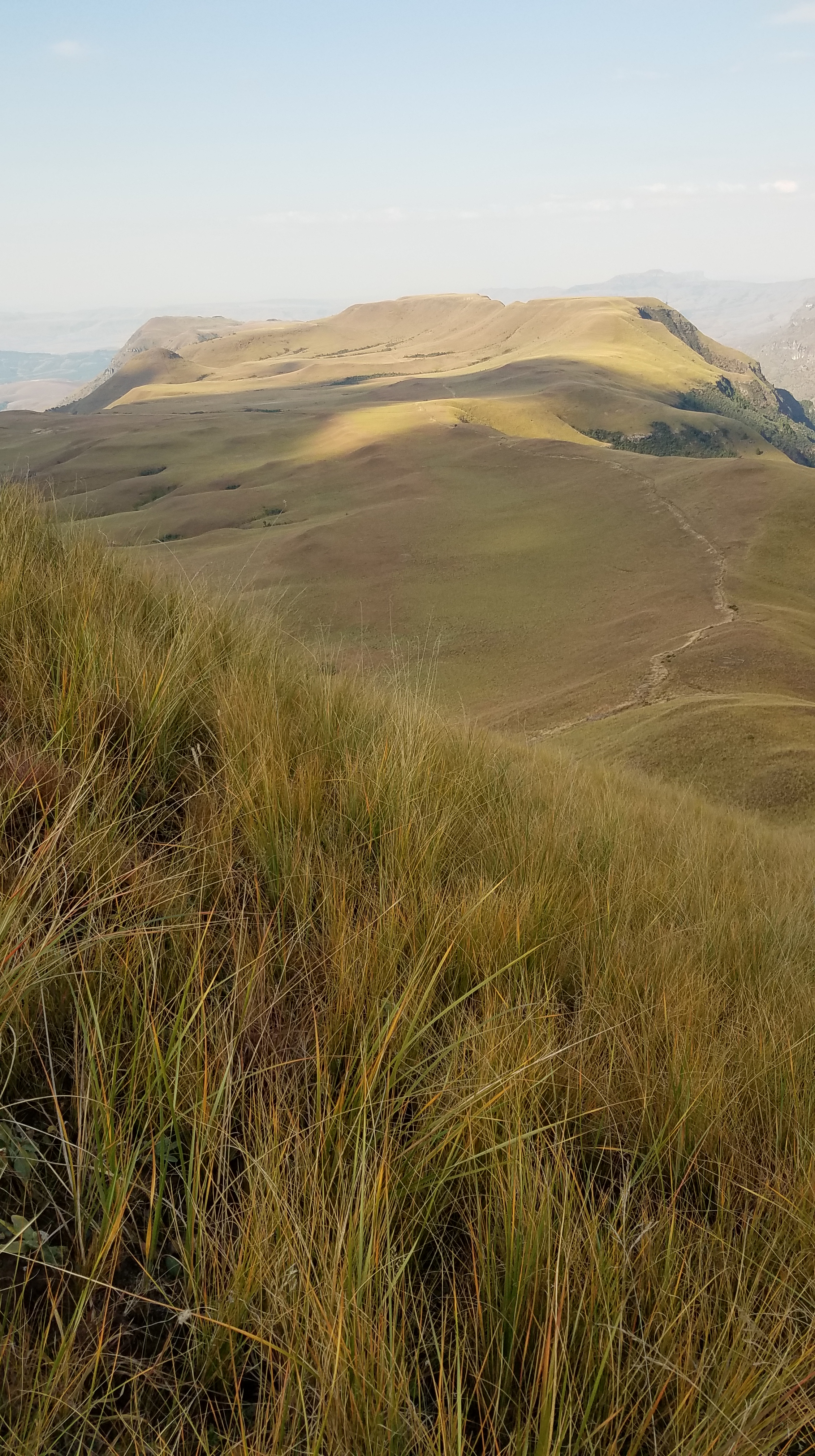 The bridge brought good karma and I was granted access into the park to hike even though it is still closed to the public, as long as I keep it a secret in the valley. One afternoon after finishing work on the bridge, I hiked up a popular trail to Blindman’s Corner and got my first taste of the “berg.” The manager said they had a mission for me to go up there: to check the campsite at the corner and make sure no one had vandalized it. The trail from the ranger station switchbacked up to the lower berg and from there I followed the contour trail along the ridge. The mountains appeared to be fluid, melting from the summits down into the valleys below. Golden hills rolled out before me and fell away on the sides turning to cliffs and eventually thick, lush forests. I gained the 2 kilometers quickly with my eyes fixated on the mountains ahead of me – Cathkin, Sterkhorn, Turret, Amphlett, then Champagne Castle in the back and Greys Pass. Further North below me was Eagle Gorge, a place I must go to explore for a few days. As I grew closer to the corner, I craned my neck to trace the ridgelines to the tops of the peaks. It was spectacular. When I was given directions to Blindman’s Corner, the park ranger said that I couldn’t miss it, because even a blind man could find it. The trail met the base of the mountains and split, North and South. The campsite lay right at the junction and was left untouched – mission accomplished. Above the intersection was a triangular grassy hill, a corner of the mountain. It was the steepest grass hill I’ve ever seen and I wondered how the vegetation managed to cling to its sides. I wondered if the saying from Alaska, “If it’s green, it goes,” applied to the Drakensberg as well. It did, and soon I was sitting cross-legged on top, eating my lunch, dazed by the views. I knew I’d be up on top of the peaks someday soon. It had been awhile since I felt the mountain high – it felt good. I don’t remember much of the hike down as it all seemed like a dream, especially watching the light show as the sun set behind the range. I did not see a soul the entire hike. I’m incredibly lucky to have this natural playground so close to my farm and access to explore.