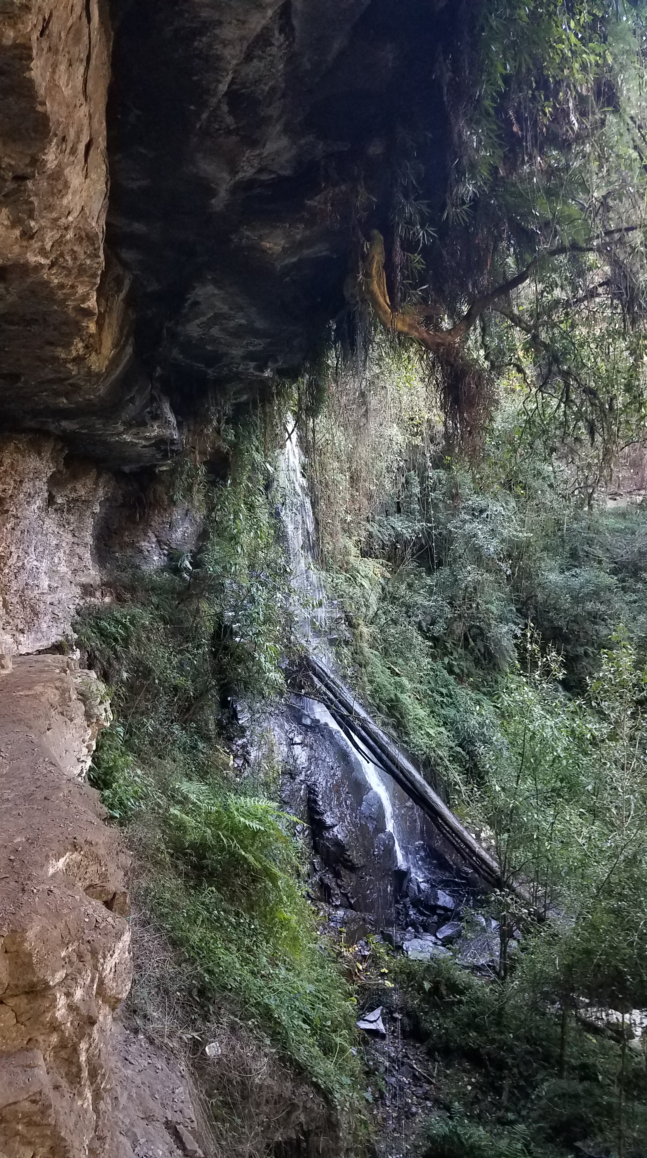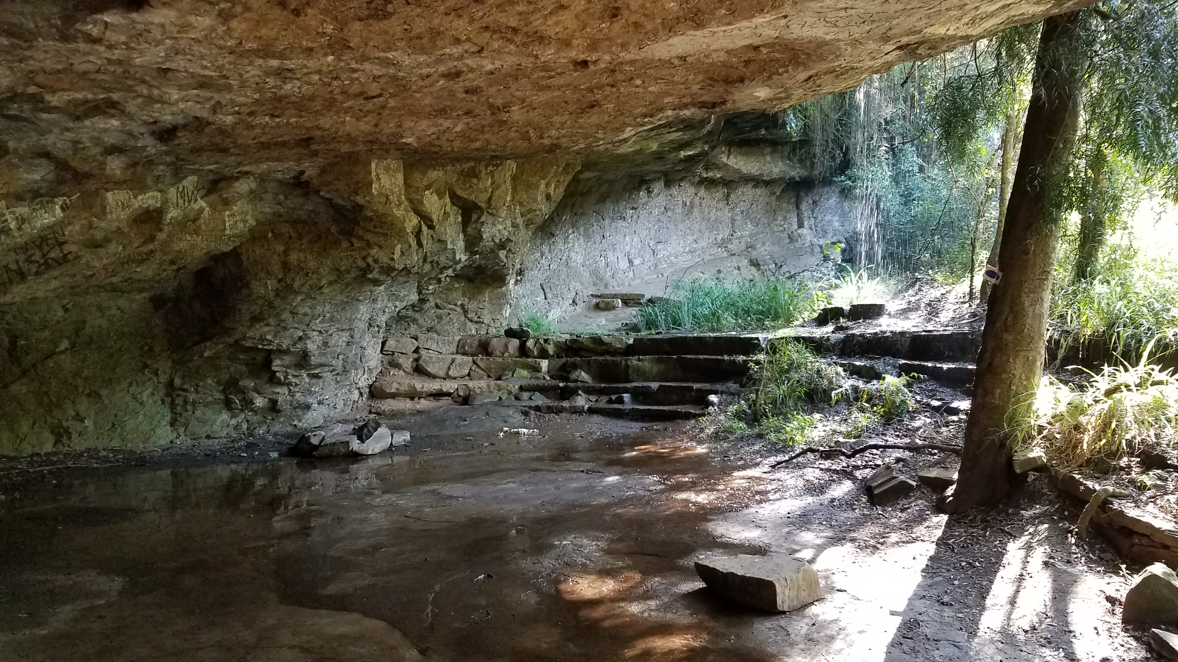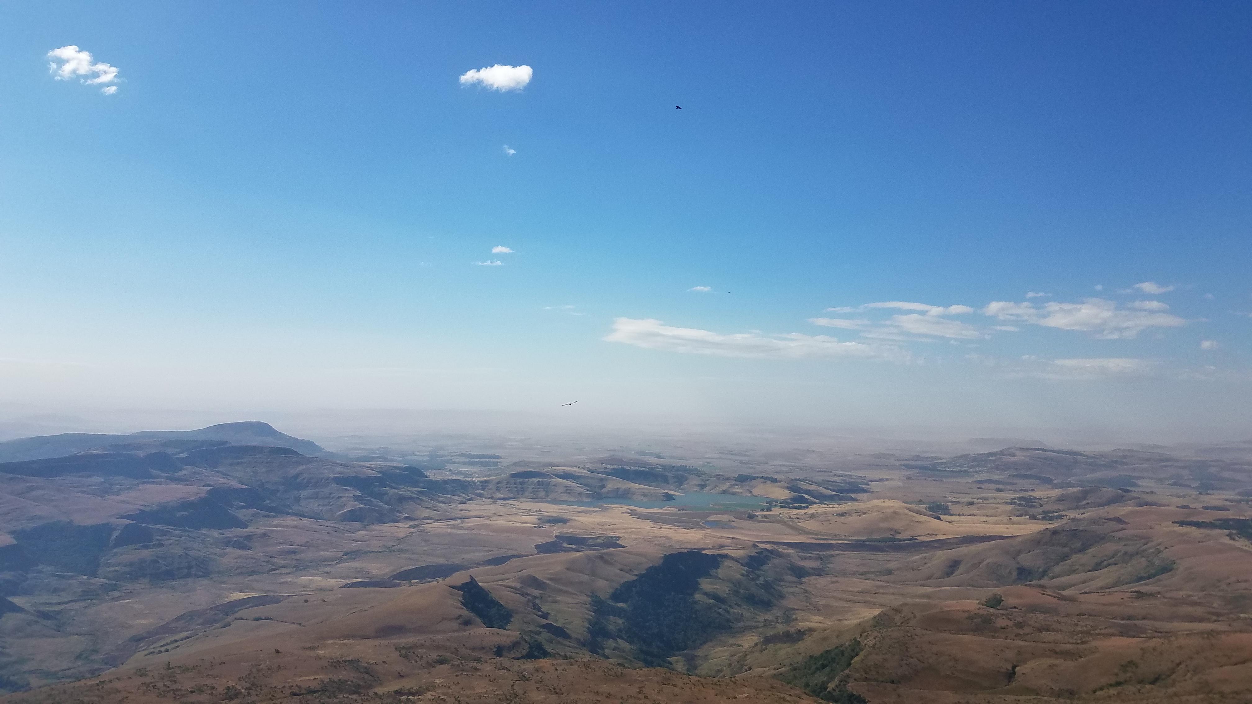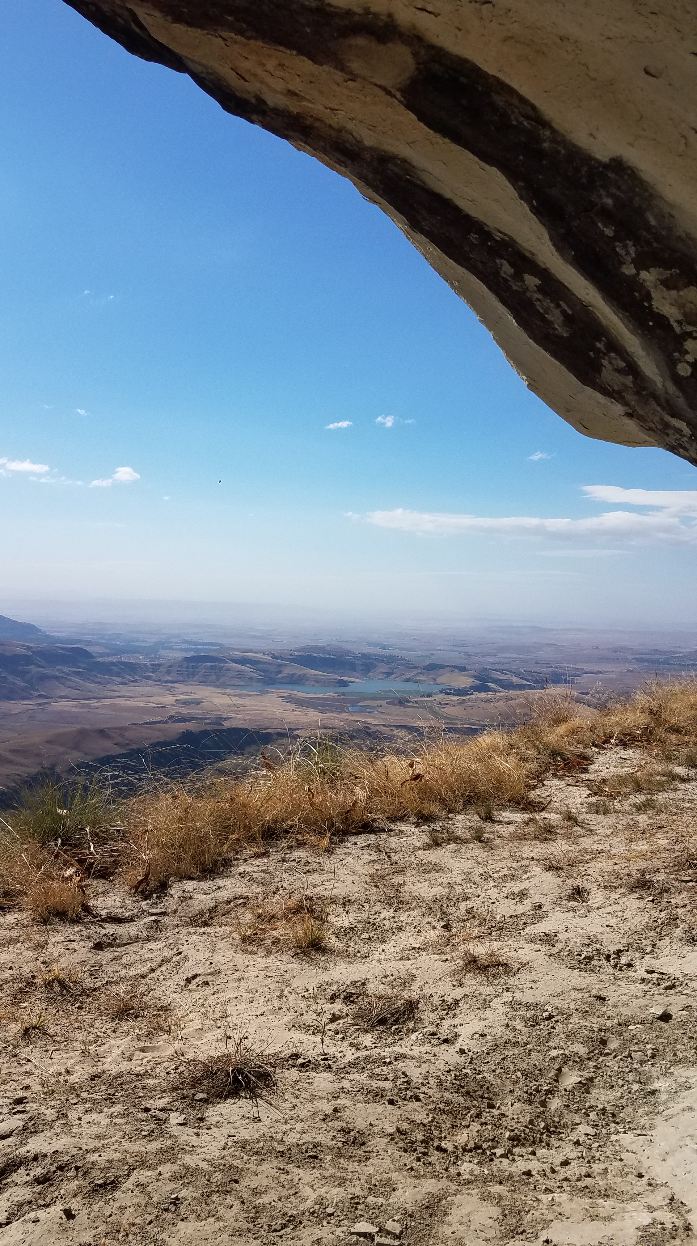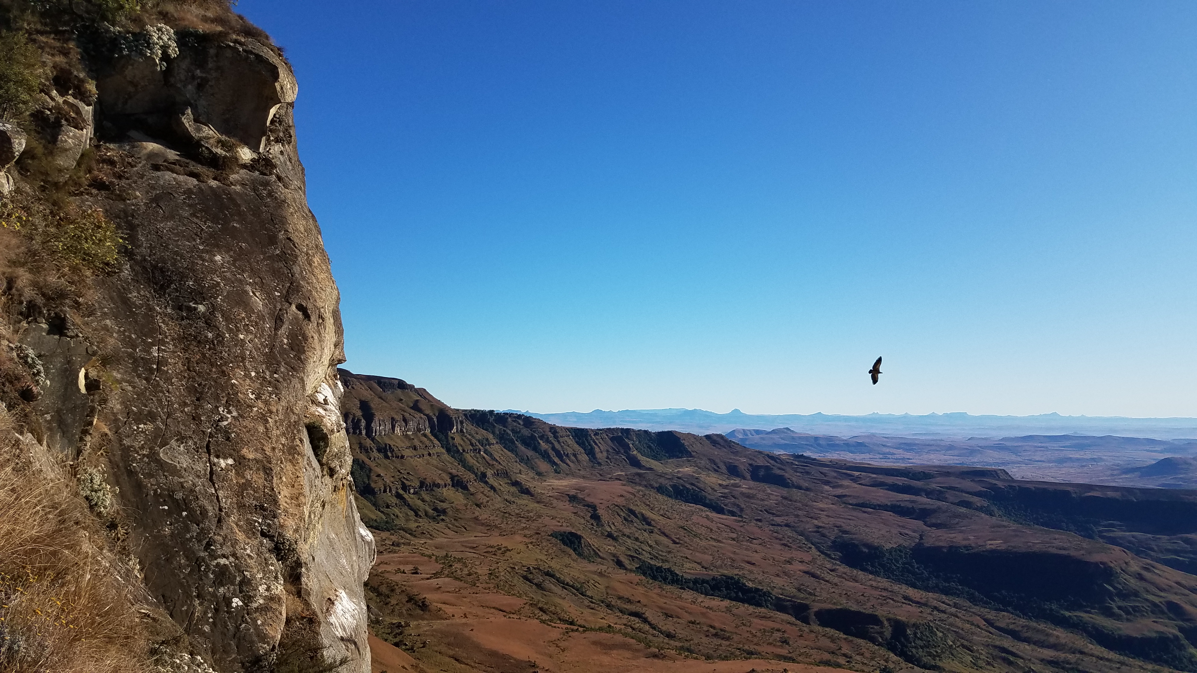 Roy gave us a lift up to the vulture hide, saving us a lot of elevation to hike. We set off on the contour path at a moderate pace. The hills were a bit more golden than the last time I’d been up there and a jet stream pushed puffy white clouds into the sky. We took a break an hour in beside a stream in a forested gully, ate some lunch, and refilled water straight from the stream (no need to filter, boil, or add iodine to the mountain runoff). The contour trail wrapped around into the next valley where we could see the farm and all the trails Nathi and I ride. We ascended the ridge via Jacobs Ladder, a long switchbacking trail, before topping out at an overhang. From here we saw smoke rising from the cliffs above our destination – three separate fires. We notified Mark; he hadn’t seen them yet and asked us to report back if they got bigger. They were likely set by arsonists since there were three separate fires along the ridge. I learned that one should always carry a lighter when hiking during winter. Fires are common, either from being purposely set or by careless acts, and the dry vegetation can quickly fuel a massive fire. Recently, two Canadian visitors burned to death by being trapped by a fire; people die every year from them. If there is no way to escape the fire, and you really can’t run from fire, you should set your own to burn the area around you. That way when the fire comes through, you will be in a place where it can’t burn anymore. I had brought a lighter in my emergency kit, but thought it better to have it more accessible.