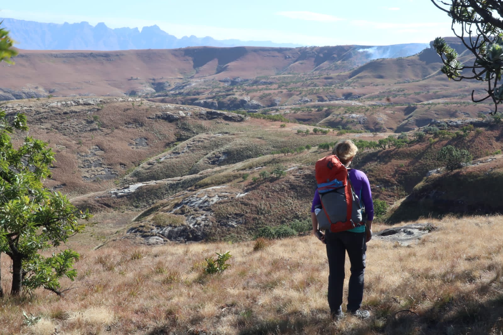 It was a cold night with howling wind but a crystal clear sky. I awoke multiple times and watched the sky for shooting stars between sleeps – there were tons. In the morning we made coffee to warm up and assess the cave. The rock art was untouched, though faint. A triangle symbolized a beehive; I wondered if that meant at one time there was a hive in the cave. There were drawings of eland, as well as a plethora of their scat in the cave. They were likely using it for shelter more now that the park was closed to visitors and campers. On some of the rocks was a deep burgundy coloration. It looked like it was just part of the rock but apparently it is from blood coming off of hides as they were scraped and cleaned against the rock by bushmen. Further down the cave we found what we thought at first was graffiti. Upon closer inspection, the large scrawled writing read “Im Jo. Help. 6 days lost. Look past for this path. No food. Weak.” I took photos of the rock and we wondered when it was written and whether there were more clues. Lockdown began in March, so no one should have been back here since then. Without finding anymore clues, we packed up and hiked back up to the ridge for reception to notify Mark. Sure enough, in April, a man had gone missing and was found on the seventh day. He planned to hike to Blindman’s Corner – a long way from the cave. They think perhaps fog moved in and he turned down the wrong trail and wandered down into the valley, then found shelter in the cave. Within a day after he wrote the message on the rock, he made his way to the vulture hide (where we started our hike), and was found by Roy with little clothes on, no shoes, and very weak. He was a musician from Switzerland who was visiting and was lucky to have found his way back out. During the time he was missing, the mountain rescue crew and police (since he was a missing person) searched on foot and by helicopter all around Blindman’s corner, but not in the valley with the cave. Having data like this, even after the guy was found, is helpful to train for future rescues. Though to us it would seem like common sense to perhaps get on a ridge and look for city lights, or stop moving immediately after feeling lost, sometimes panic sets in and maybe not the best choices will be made. The cave was never searched because no one thought he would end up down in the valley, tucked away in a cave for 6 days.