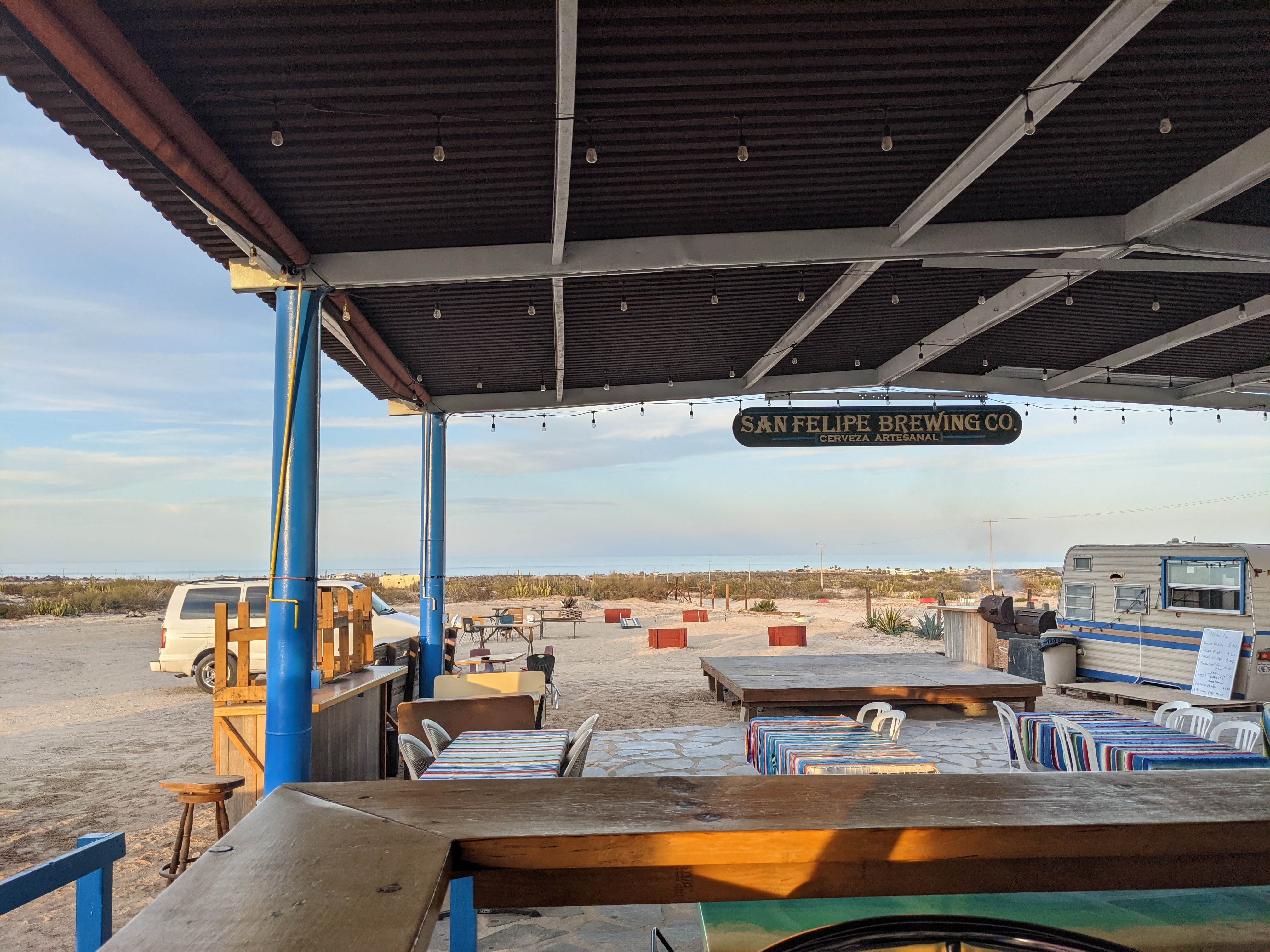 After a full day of shenanigans, driving, check points, and plotting, we finally landed in San Felipe, at a brewery overlooking the gulf. We chatted with the bartender and shyly asked if we could camp out for the night in the parking lot – I promised we’d buy some more beers if this would be alright. He made it seem like no problem so we bought some pork and fish tacos, drank some beer, planned tomorrow, and decided to update our blogs with the unexpected wifi.