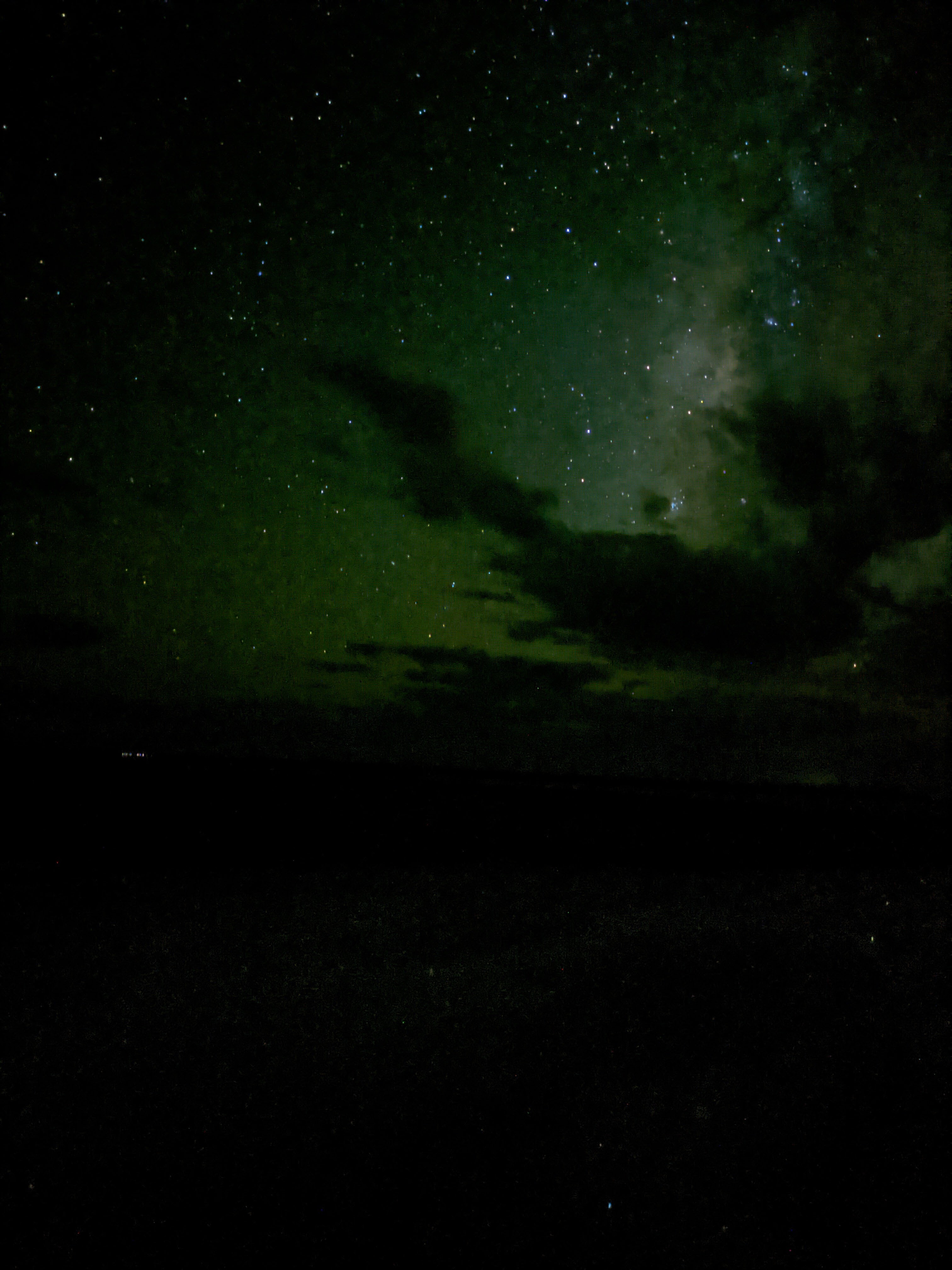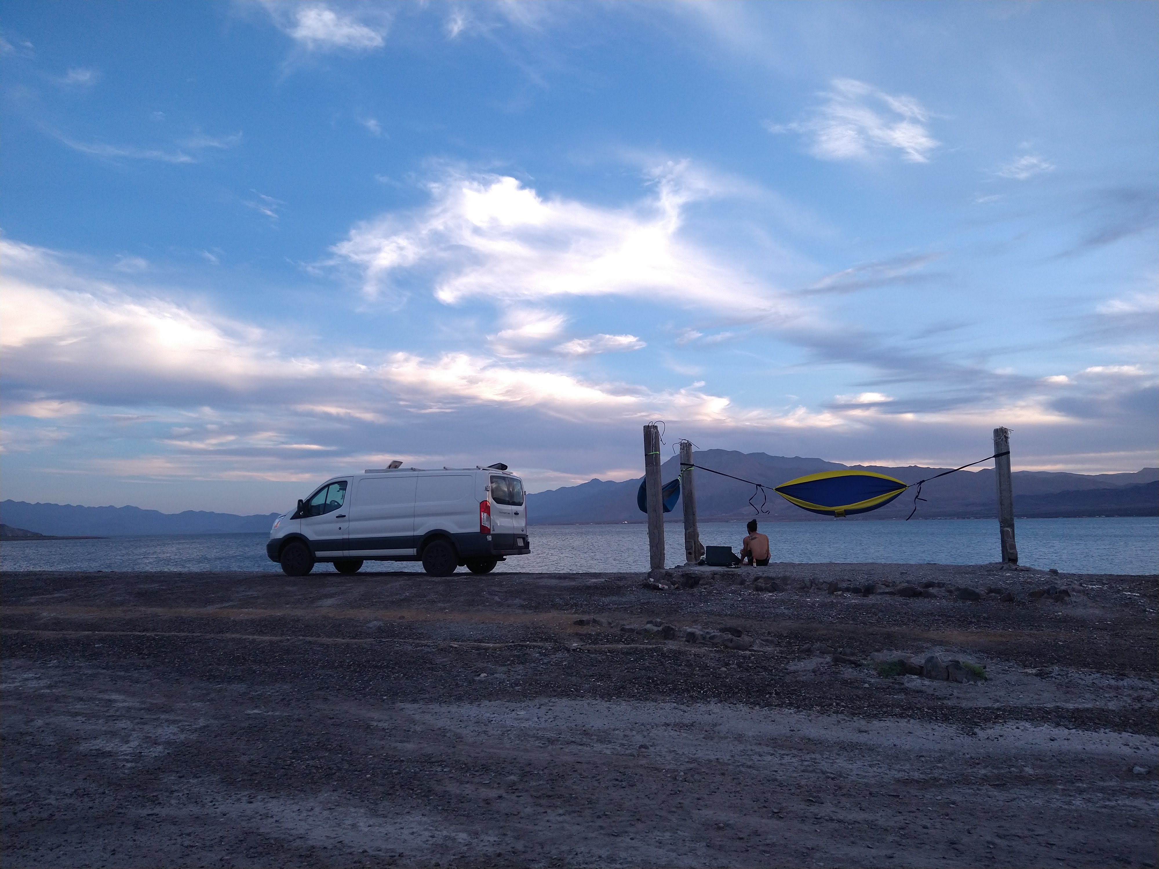 We swam in the clearest blue water I’ve ever swam in. It looked like sunken mountains dotted the bay. It was the perfect little bay that we were lucky to stumble upon. As Andre cooked dinner, I noticed our ideal spot with the three posts of a building opened up. I moved the van over to claim it and set up our hammocks as Andre finished dinner. Once it was dark, we went down to the water to check out the stars only to find bioluminescent algae! As we disrupted the water with our hands and feet, the water lit up with specks of blue. It was incredible.