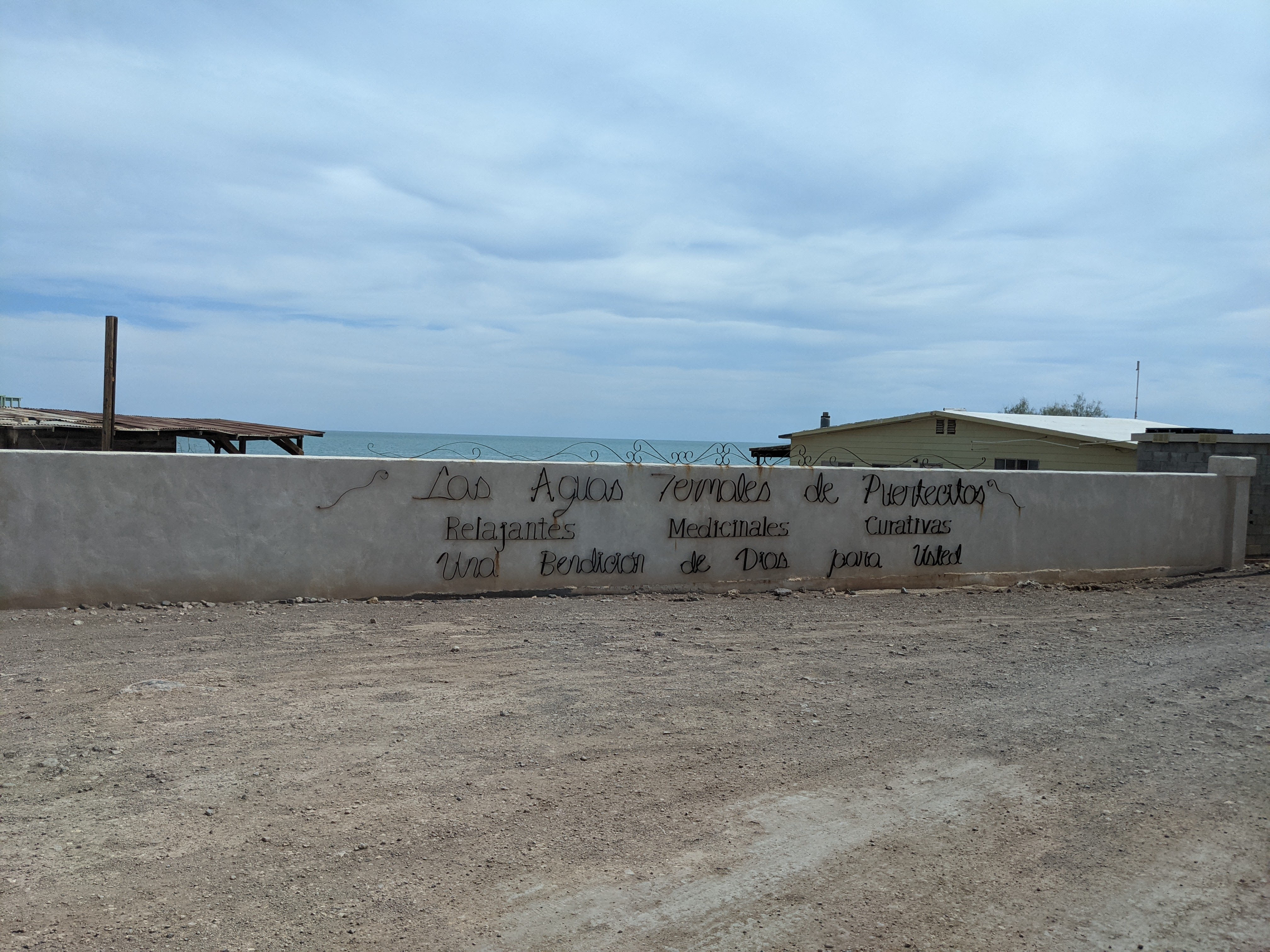 We allowed ourselves to sleep in at the parking lot of the brewery. Once we decided we were awake, we headed off to the hot springs (las aguas termales de Puertecitos). We paid 500 pesos to drive Savannah into the village and up to the hot springs, which we hit just as the tide was coming in. The hot springs were quite busy as families congregated around the hotter areas. We found a quiet pool on the outskirts and watched dolphins jump and pelicans dive while we soaked.