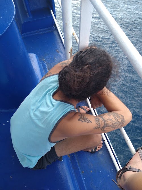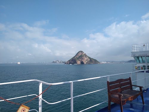 For breakfast we had what looked similar to dinner from the night before, but upon further inspection it was scrambled eggs, shredded dried beef (maybe?), and bean paste. We returned to the upper deck, hiding in the shade as the sun was already cranking by early morning. Andre was feeling a little green at this point, at the end of it all we would be on the ship for about 20 hours. We did see some dolphins in the morning jump along side the ship! We also noticed some buoys that seemed to make a line towards the ship. Shortly after this observation the front of the ship caught the line connecting the buoys and within seconds snapped the entire line! We thought maybe they were for a fishing net and didn’t realize they set it across a ferry route?