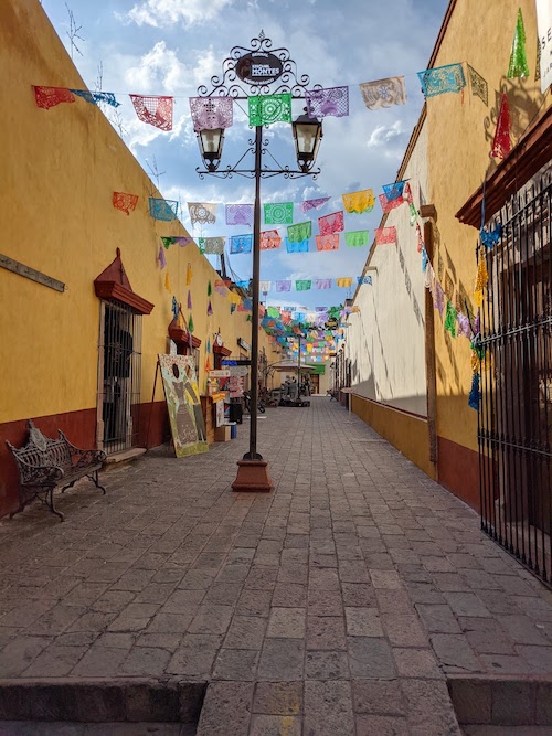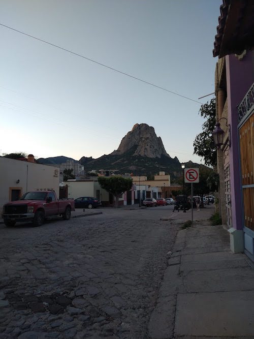 The next morning we made the decision to skip Tamul waterfalls since it was pretty far North out of the way and there were various comments in iOverlander about it sometimes being closed or with a steeper cost to go in and look at the falls with the pandemic. We opted to move ahead to our next destination, Bernal. Here there was the third largest monolith in the world, and it had multi-pitch sport routes up the whole thing! We drove about 6 hours to Bernal and parked in the festive, cute town to walk around. We bought some quesadillas for dinner from a small street restaurant. They were deliciously spicy (to me) and deadly spicy (to Andre). We walked the main drag before turning in. A local hotel let us park the van for the night, with the use of a restroom, showers, and wifi, for 250 pesos (~$12). We took a freezing cold shower, then read up on the climb for the next day before crashing.