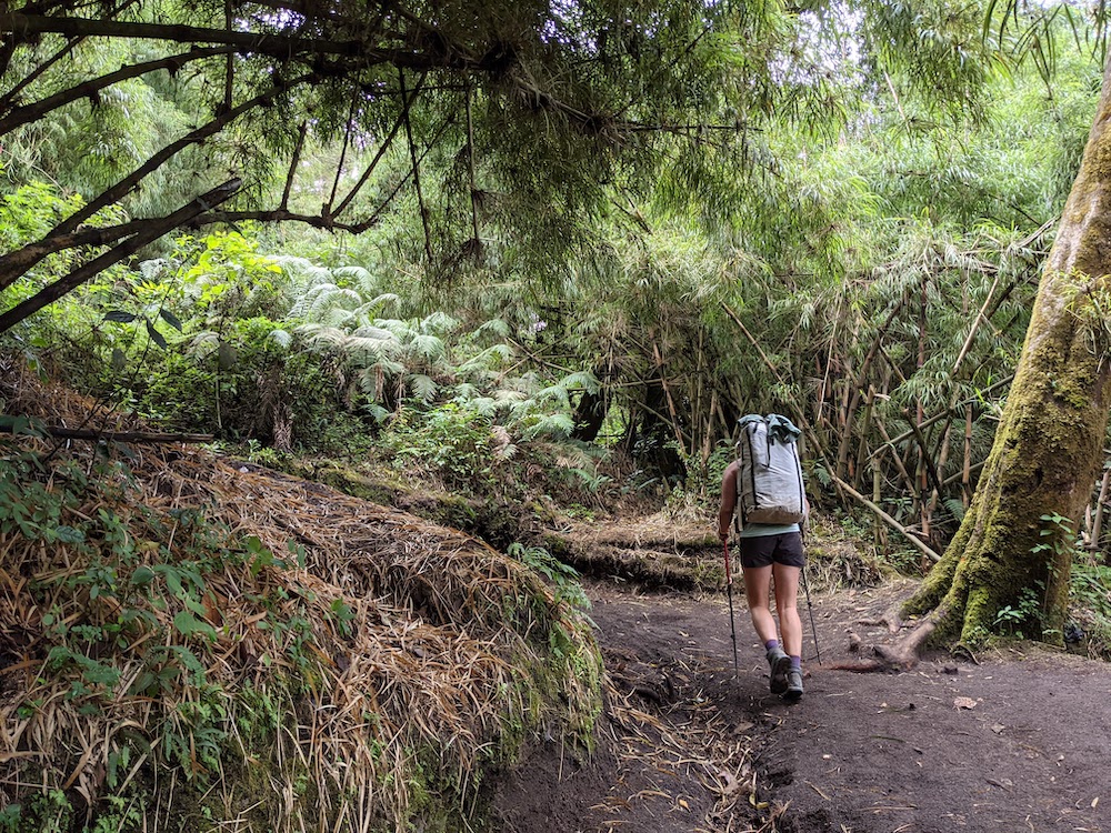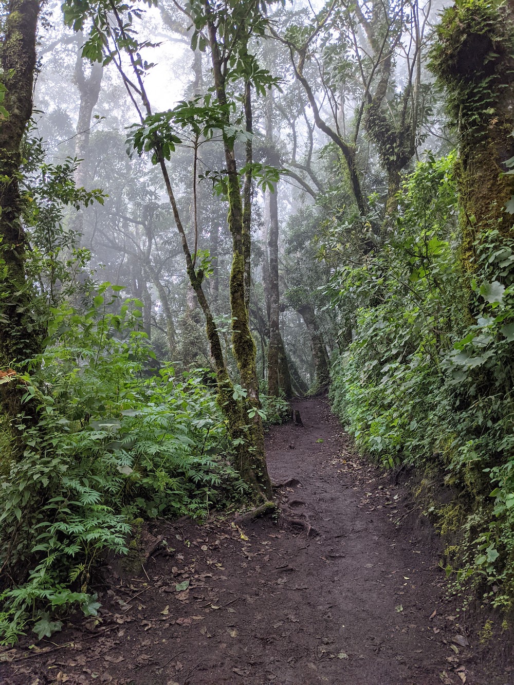 We hopped off right at the trailhead and we were soon shlepping our packs up a loose dirt path. It really did feel like one step forward and half a step back as we ascended through corn fields on this well used path. About a half mile up, we hit the first restaurant/break area. We didn’t hang around long though and continued on to the fee station. Another couple of corn/wildflower fields and more silty trail, we reached the fee station. You’d think there was a party going on with how many people were loitering around – we could hear the crowd minutes before we arrived. We paid 50 quetzales each (~$7 USD each) to enter and filled out our information on the forms. Once we left the station, we were relatively alone on the trail again. Clouds creeped through the trees and the environment reminded me of hiking along the Columbia River in Oregon. We were sweating hiking uphill but once we would stop to take a break, we’d get a chill from the fog and cool temperature. We ran into a few guided groups and one woman being brought up the volcano on a horse. At another restaurant/break area we saw a couple of horses loaded up with gear to bring to the basecamp sites. There were also some really cute dogs.