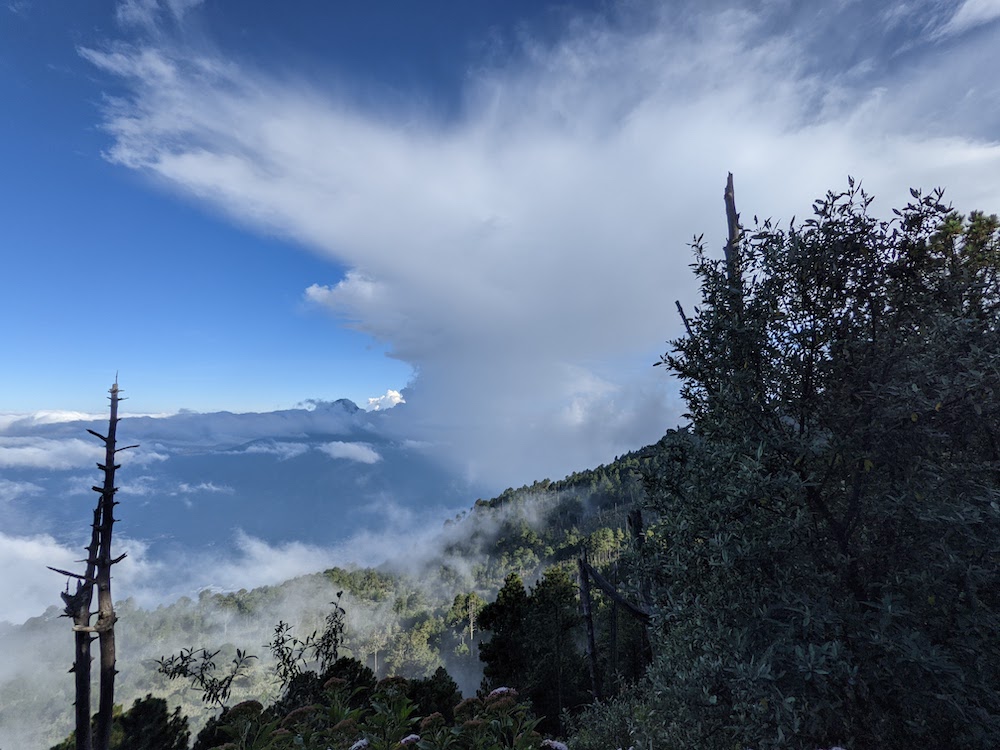 We switchbacked our way up on damp soil. We hypothesized that the side of the volcano that we were hiking up didn’t get a lot of sun and was still wet from the rain a few days before. We read a sign along the way about a beetle that was responsible for killing off the pine trees on the volcano; apparently once the tree was infected it would die within 90 days. Evidence of this was everywhere as we neared 11,000 feet.