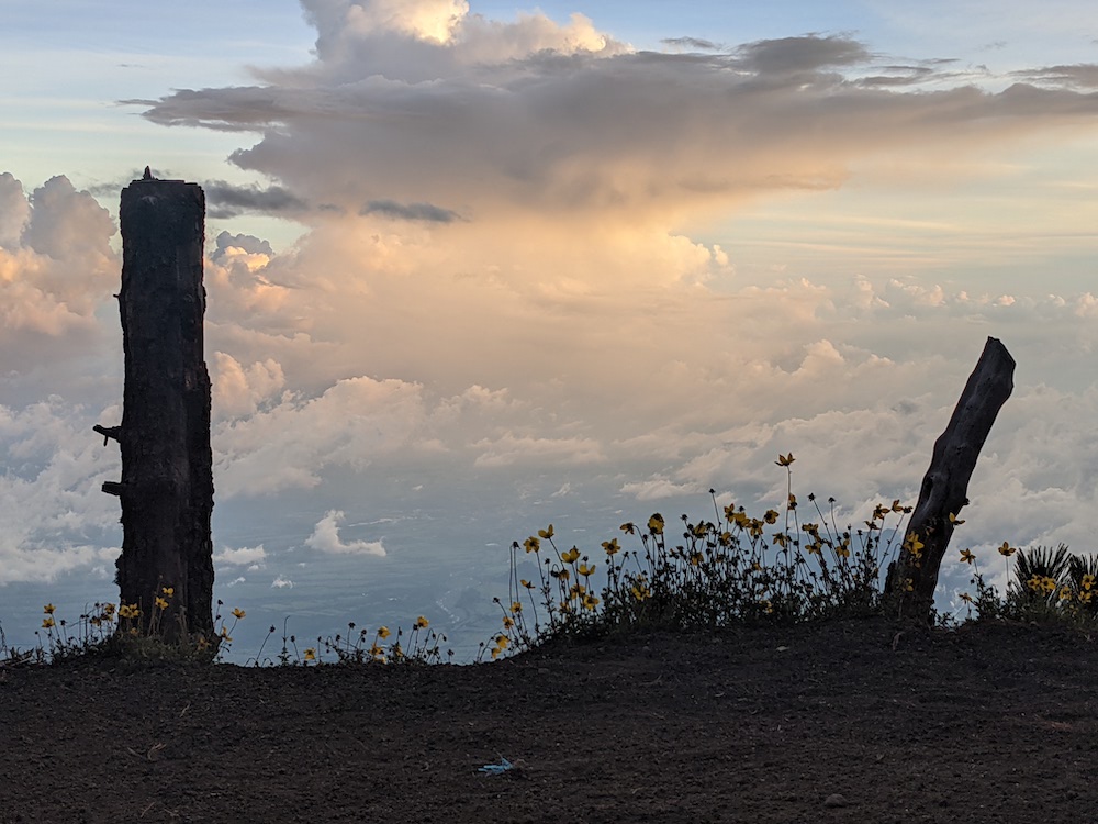 The caldera looked ominous and a bit spooky, especially after reading that the last eruption was only a few decades ago. It was smaller than I had imagined, and we ended up walking around the rim of the dormant volcano in maybe 10 minutes of hiking. There was evidence of bivy sites in the center of the caldera and where the half dozen people died a few years ago. We first rested at the Southern summit (the lower one) to watch Fuego erupt through the clouds. Then we skirted (well I skirted, Andre walked through the center) the caldera to the high summit. It was really trippy to imagine this as a once active volcano. Our legs were screaming from the hike.