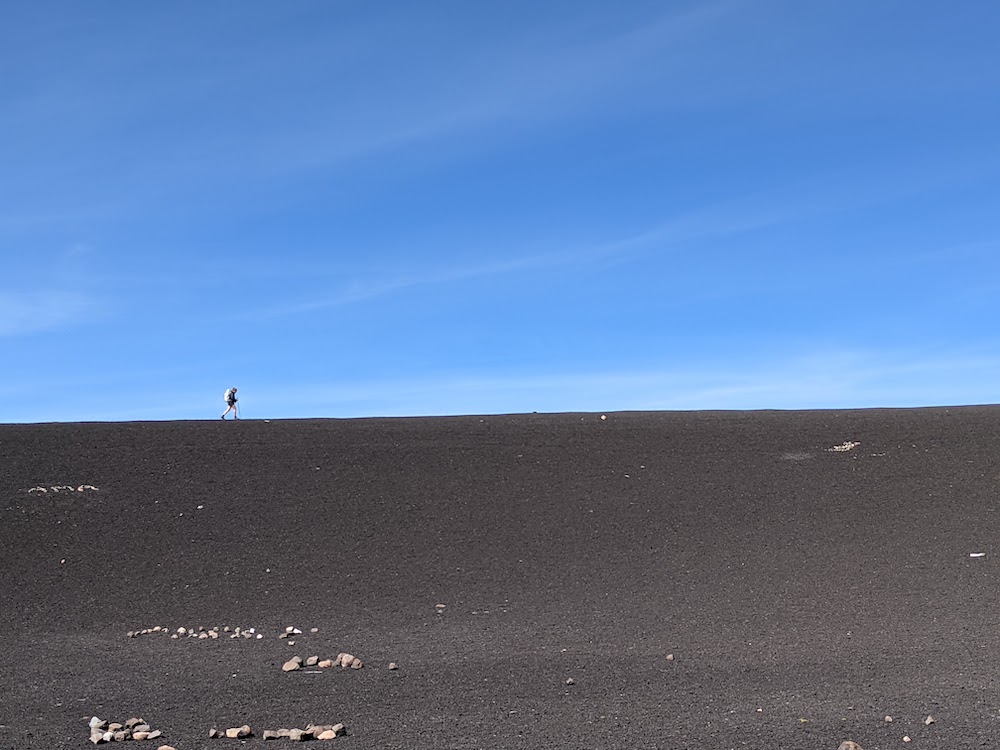 The guided tours advertise a sunrise summit of Acatenango to watch Fuego. We decided not to make this part of our solo itinerary and watched the sunrise from the tent. We roused around 7 AM and packed up, then started trekking up to the summit. From basecamp, the trail to the summit was even more silty and steep. We sloshed around the loose rocks for about an hour and half as we tried to gain ~1200 feet . The last stretch to the caldera was especially slow with super deep silt that felt like you weren’t going anywhere.