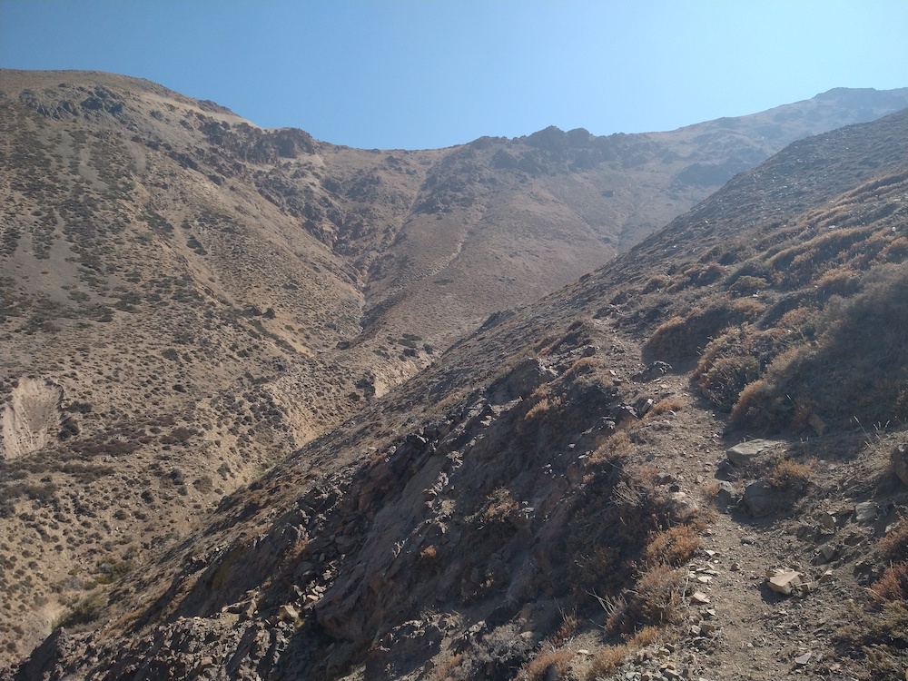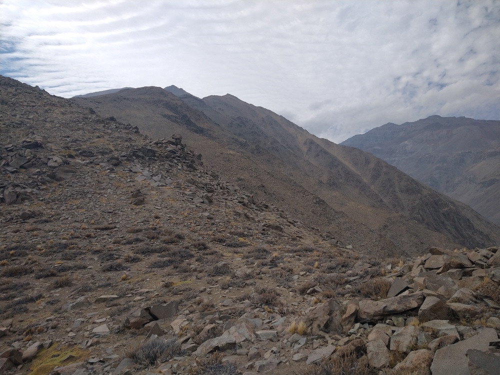 I drove another couple of kilometers to the parking area and quickly threw my pack together and set off up the trail. The sun was hot and the climate here is so dry; I quickly broke a sweat. The trail, or “sendero” in Spanish, started with a gradual incline up the valley, then the turn off for Cerro Manchan broke off from this main valley trail and zigzagged up a steep hillside. From there it crept along the slope of a small valley. I felt the altitude and gain almost immediately after the trail became steep. My legs were screaming and heart was thumping as I tried to keep my normal pace. But I did have to take some breaks and acclimatize a bit. After leaving the valley floor, the trail reached the main ridgeline. I love ridge walking. I love being high and looking down at peaks and valleys below.