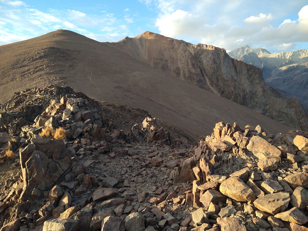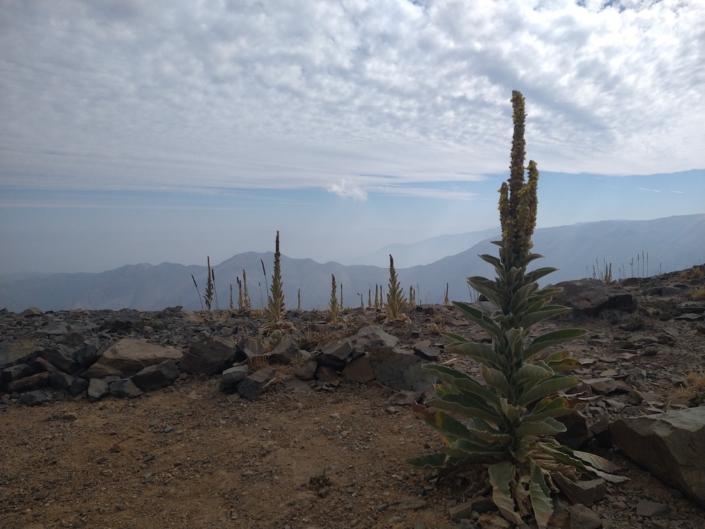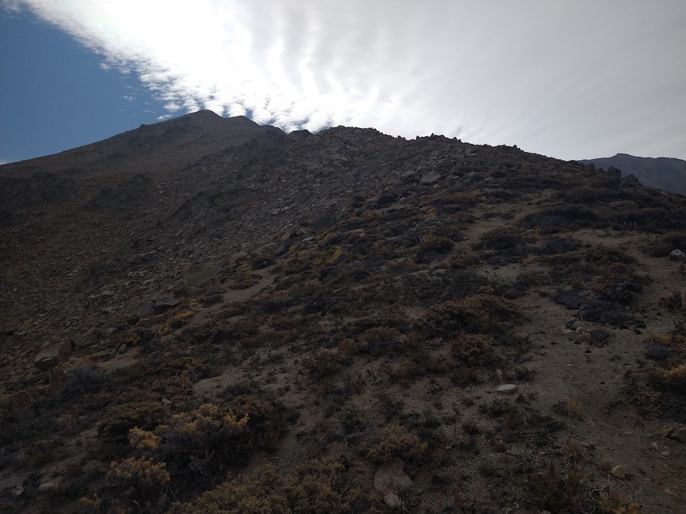 I reached many false summits. Each time I’d think it must be the top, I crested the high point and saw the trail continue beyond. It was pretty incredible how much mountain was above that valley (6000 feet!). I passed three parties who were coming down from the summit, all were surprised I was up there alone and also told me they close the gate at 6 PM for vehicles. I assured them that I was fine and that I was camping there that night so I could be up there late. Eventually, the trail crossed a narrow section of the ridge that required some scrambling, then some switchbacks up scree to reach the true summit of Cerro Manchon at 12,250 feet.