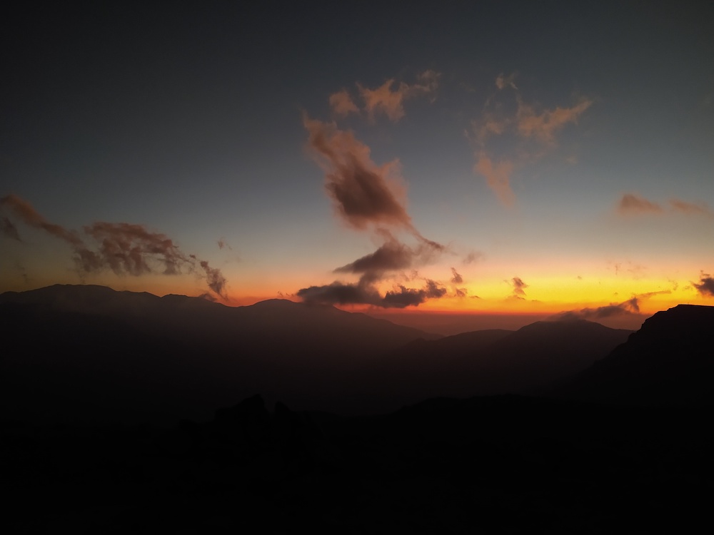 I had summitted at around 4:30 PM and wandered around the summit for about half an hour. Eventually, I knew I’d have to head down, even if it was hard to leave such an intense and stunning place. I retraced my steps back down the scree and across the scrambly ridge. The sun was just about to drop behind the mountains when I decided I wanted to wait and watch it, not rush back. I had my headlamp so I would be able to navigate in the dark, and there was something mesmerizing about the light and shadows that I couldn’t find a good reason not to stay. I munched on nuts and dried fruit while watching the colors change from bright orange to hot pink to a lilac purple. New ridgelines appeared and faded while the colors of the sky changed. I had missed being up in the mountains at this hour.