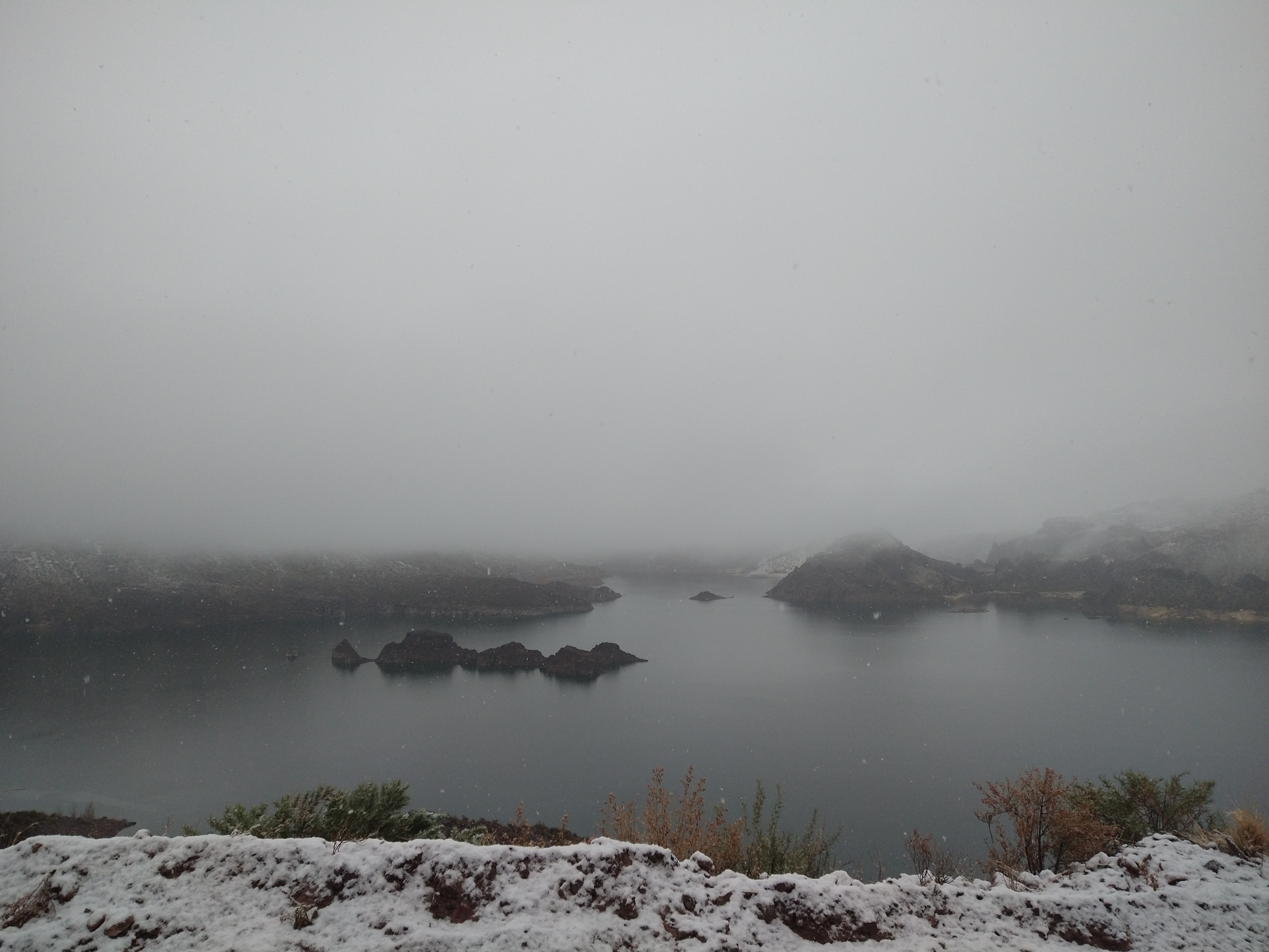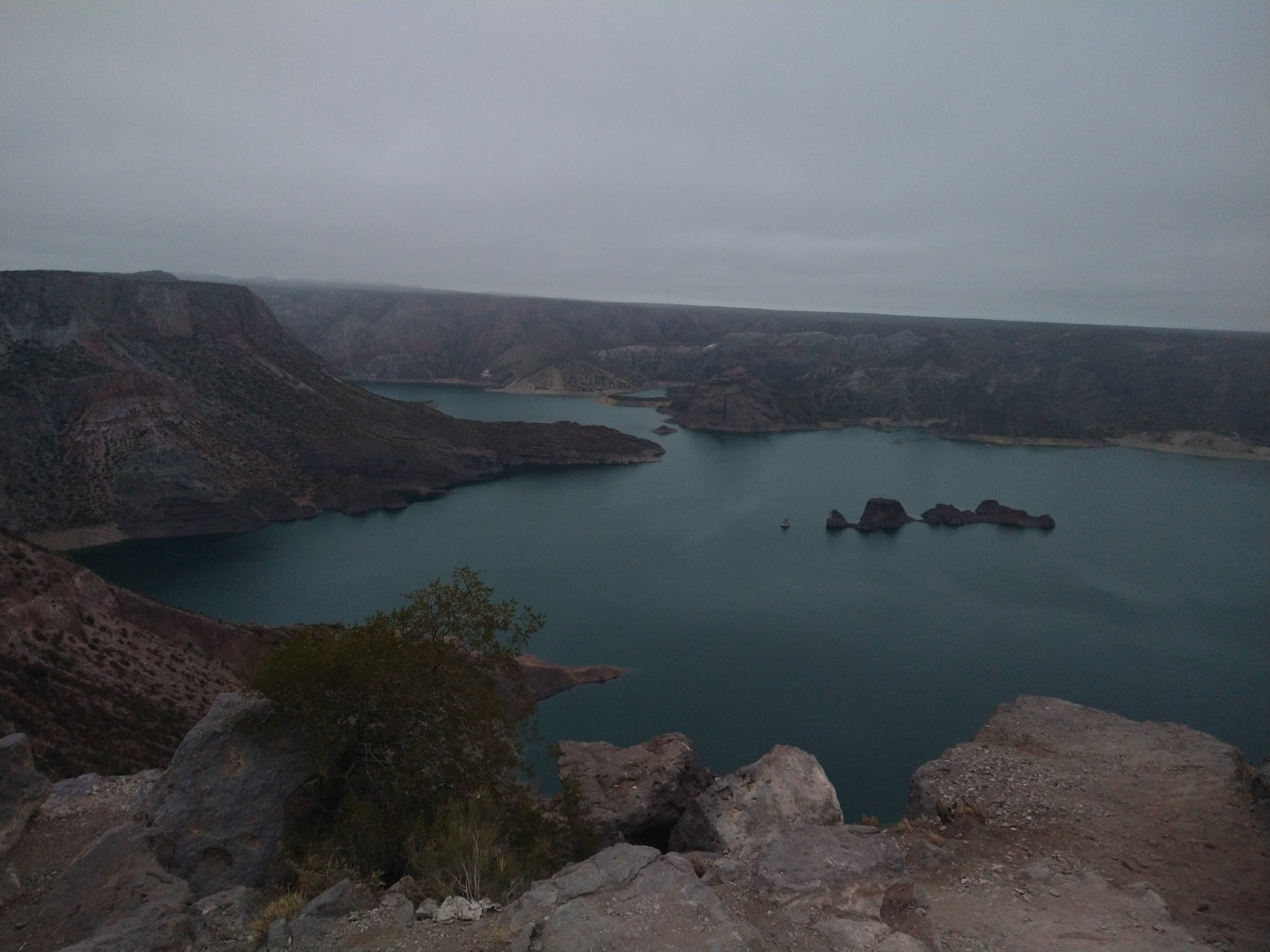 I decided to drive about 4 hours South of Mendoza to check out Atuel Canyon, which seemed kind of like a mini Lake Powell where a reservoir was dammed and previous canyons were now filled with water. It was not natural, but it looked interesting. Before I left the city, I tried to purchase the mandatory car insurance but was unsuccessful since it was a weekend. I was a bit spooked to drive, because I’ve heard some horror stories of huge fines if you’re caught without insurance (though mostly from Central American countries). But with restlessness winning me over, I decided to chance it and slipped out of the city to the South. I ended up being waved through three different police checkpoints, all while with sweaty palms as I nervously gripped the wheel. I’m not sure why they didn’t bother to stop me and ask me for my documents, but I was sure happy they didn’t. After Mendoza I drove a long, high, cold, foggy stretch Southeast. I had been feeling not so confident or mentally strong in the morning but ready or not it was time to move. Over this high plateau, my music set the perfect mood and the landscape was stunning, and I felt good again.