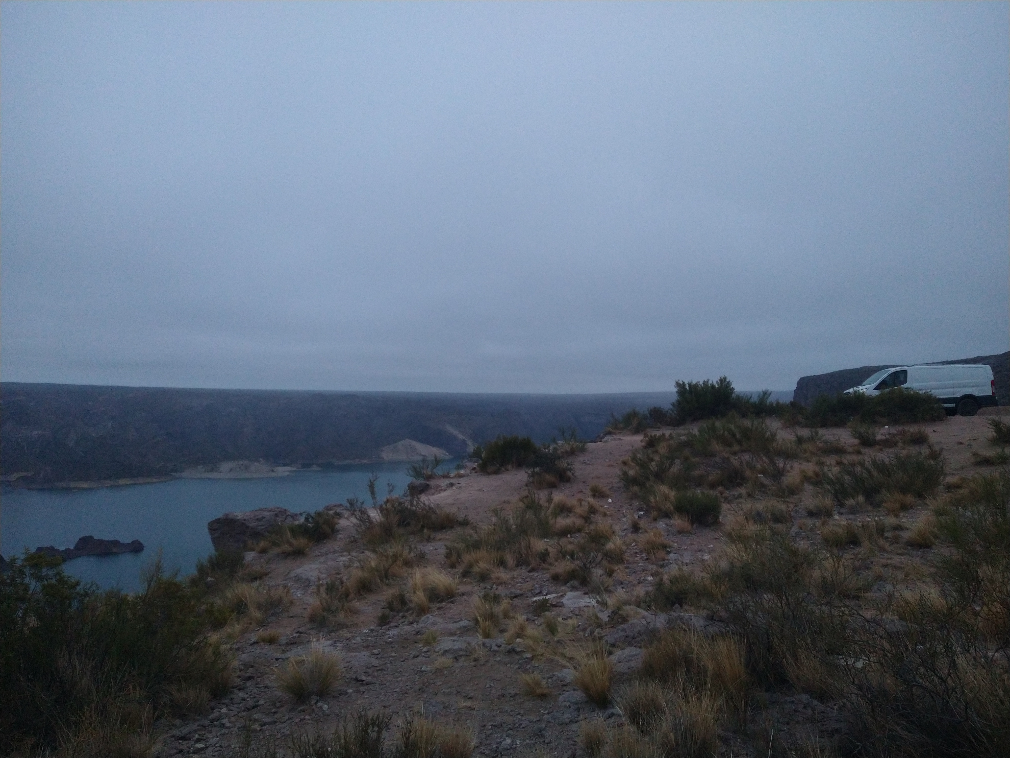 I arrived at the lake in the early evening as Savannah climbed up the dirt track switchbacks to get to the top of the dam. They were steep, but luckily dry. After another 2 kilometers along the rim of the reservoir, I found the pull-off listed on iOverlander to sleep for the night. The last light of the day threw shadows across the water as a gloomy fog moved in. It was a pretty sweet place to spend my night. I had bought some silicone to seal up places where Savannah is leaking water onto my air box (hope I got the right one), but by the time I parked it was too cold and damp for it to set properly. I had seen that the forecast called for rain that night, so I tarped the front of Sav hoping it would prevent water leaking in. The temperature was dropping when I crawled into my sleeping bag that night.