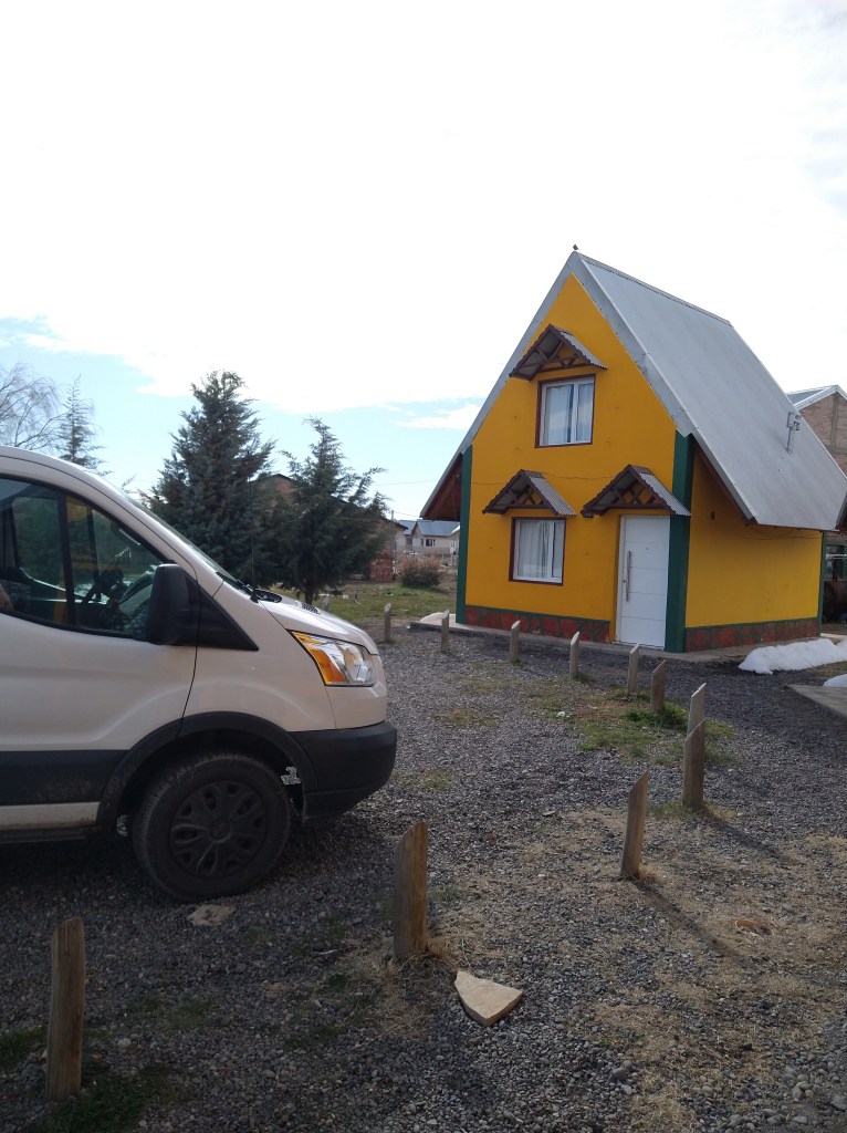 Sav and I rolled down from the volcanos and got some much-needed gas at the closest “big” town. I stopped at a grocery store to restock on food, which took me four different tries to figure out how to get into the entrance. Stocked up, I continued heading South until dark when I hit Las Lajas (a border town). Without many options, I went for the best one which was parking behind a YPF gas station. I asked about parking for the night and the gas attendant showed me where to park, gave me the password to the (very weak) wifi, and told me there were restrooms and showers. Now dark though, I didn’t want to explore what this gas station shower was like so I opted out of that. Instead, I tried to sleep in Sav next to a semi-truck which ran all night long, apparently the person sleeping in the truck really needed heat? I woke up the next morning cold with my van covered in ice, and still without a plan. I decided to indulge again in an enclosure. Luckily, literally one minute of a drive away, there was a set of cute little yellow houses that were pretty cheap to rent ($20 USD per night). I booked it, drove over, and had another much-needed shower and wifi and made a plan.