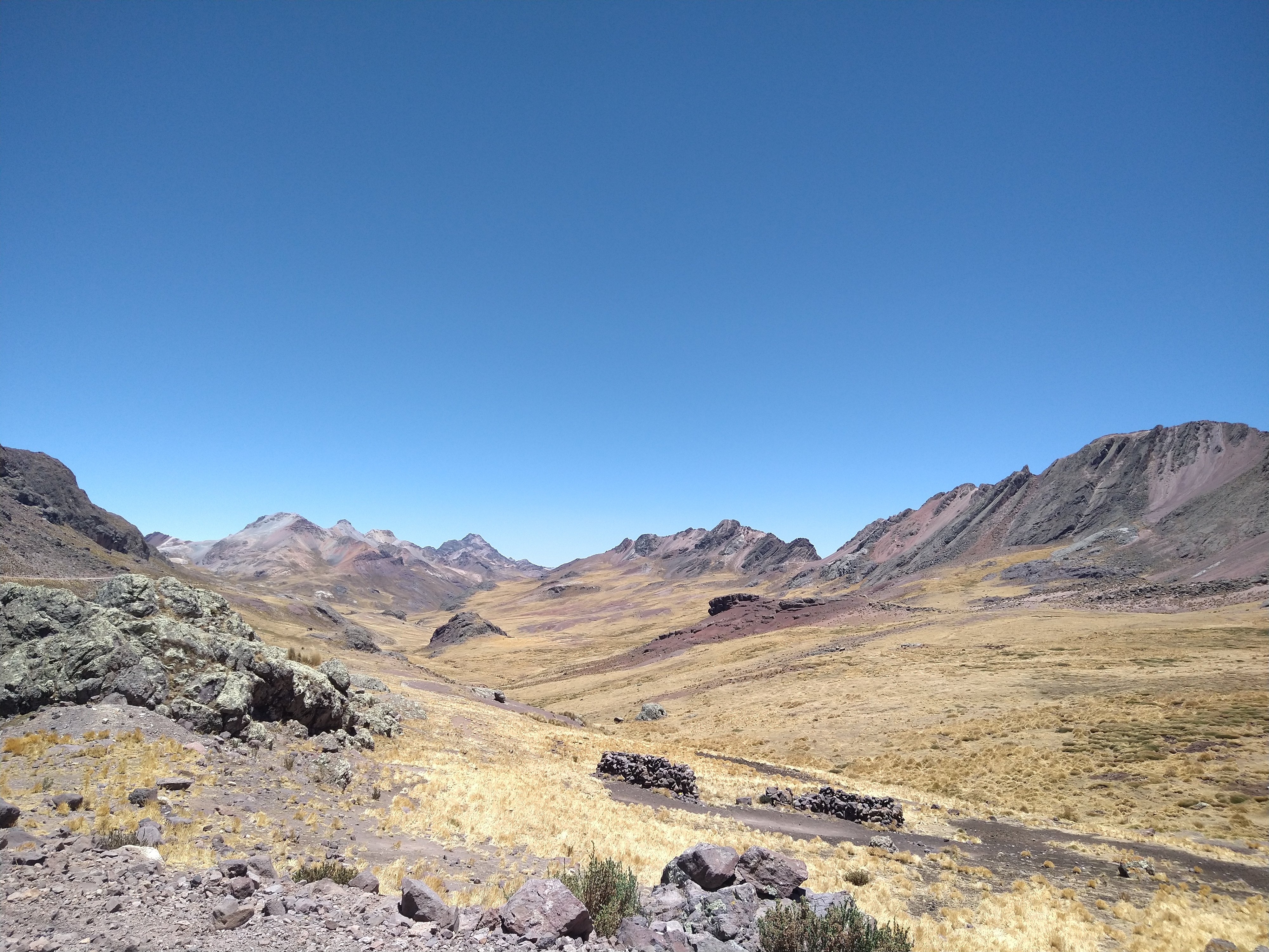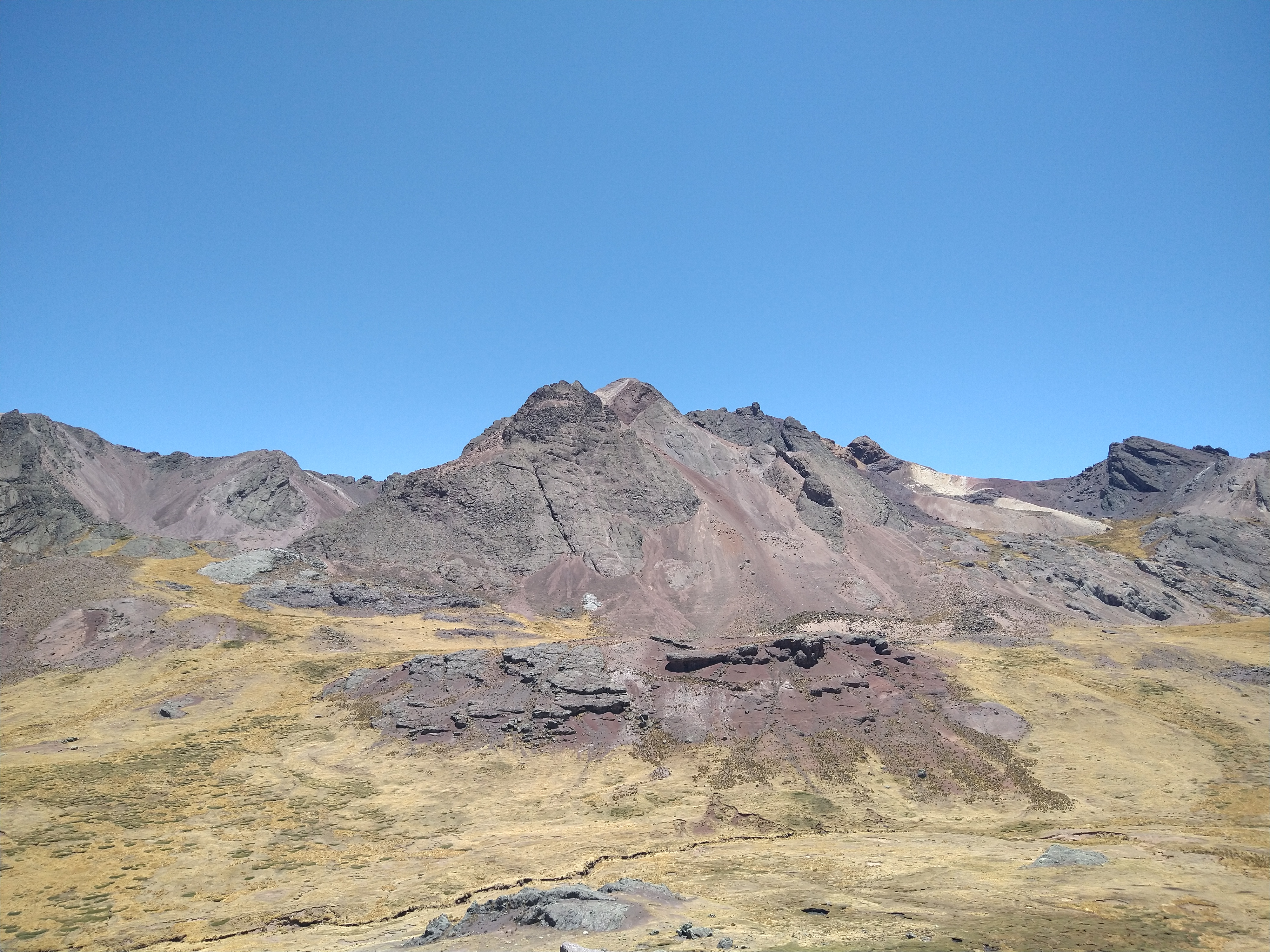 Due to the traffic I hadn’t gotten as far as I wanted to and decided to get a hotel in San Mateo. It was incredibly cheap, 30 sol ($7) per night and quite cute tucked away from the city along a gurgling river. The next morning, I got up early with a plan to check out HW-120, the route I had considered driving with Sav. I was surprised to find it was a dirt track, at times only single lane, and twisted up into the mountains to around 15,000 feet. I had hoped to do a glacier hike about 40 km along this road. The going was slow, and I needed to drive with extra caution through deep ruts or random potholes since this was not a 4×4 vehicle and rather a 2wd little car. The landscape was striking, the mountains seemed to change completely with every kilometer I drove. First they were lush with eucalyptus trees and desert-y plants, then barren slabs of red and gray rock, there were some multicolored scree covered domes, and then finally bright white sharp peaks. I was in the Peruvian Andes.