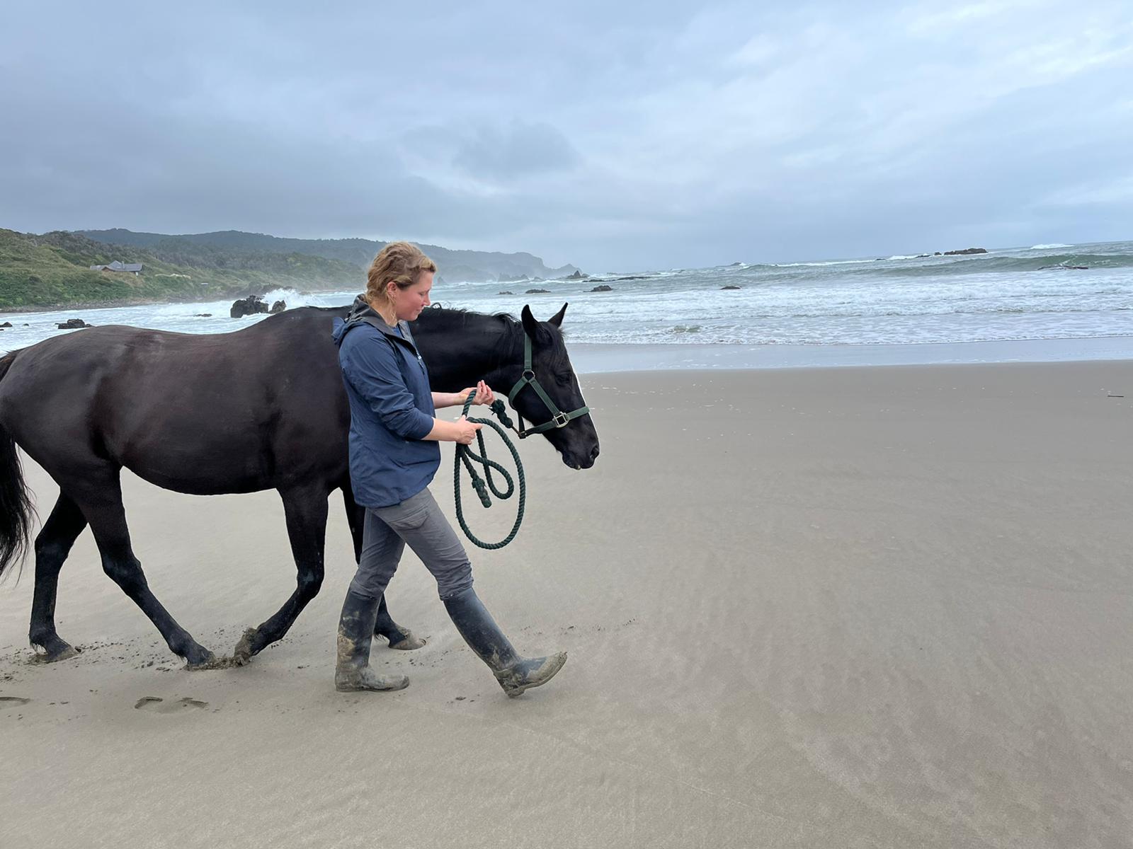 The next day I took an overnight bus down to Puerto Varas to return to Mari Mari Ecolodge where I had parked Savannah. I met a new volunteer for the farm there that morning and was greeted with a big hug from Marco and Kristina, who are my friends at Mari Mari. I slept so good that night back in my van, despite the howling wind off the sea and rain slamming the roof. The next few days I spent getting the horse therapy I always crave. I spent time with a younger horse, Joya, and worked with her a bit introducing her to the ocean and the apparently very scary waves. A new mare also arrived at the farm and I was able to work with her for a bit; she’s a very cool horse and reminds me of my old horse Daisy.