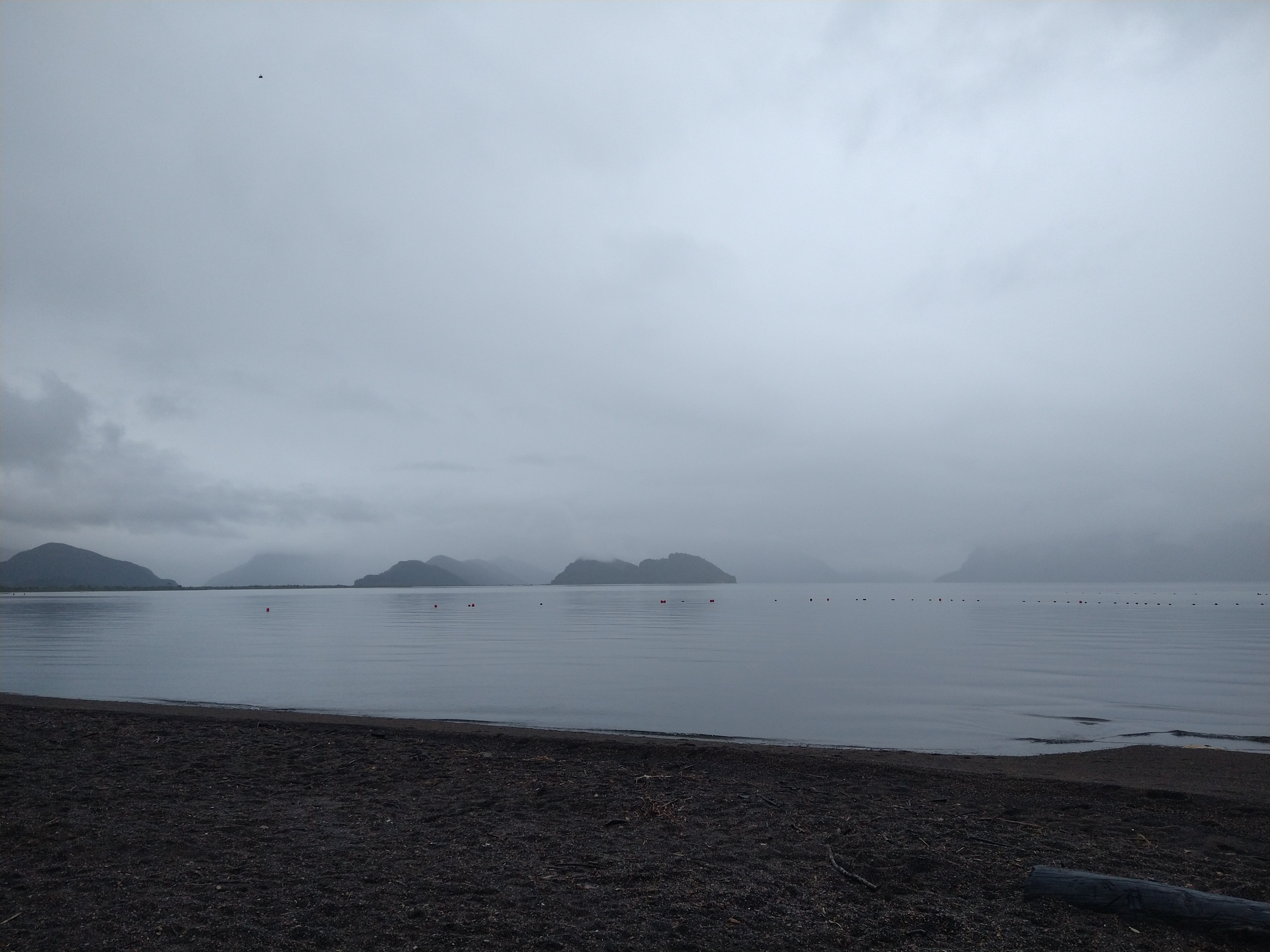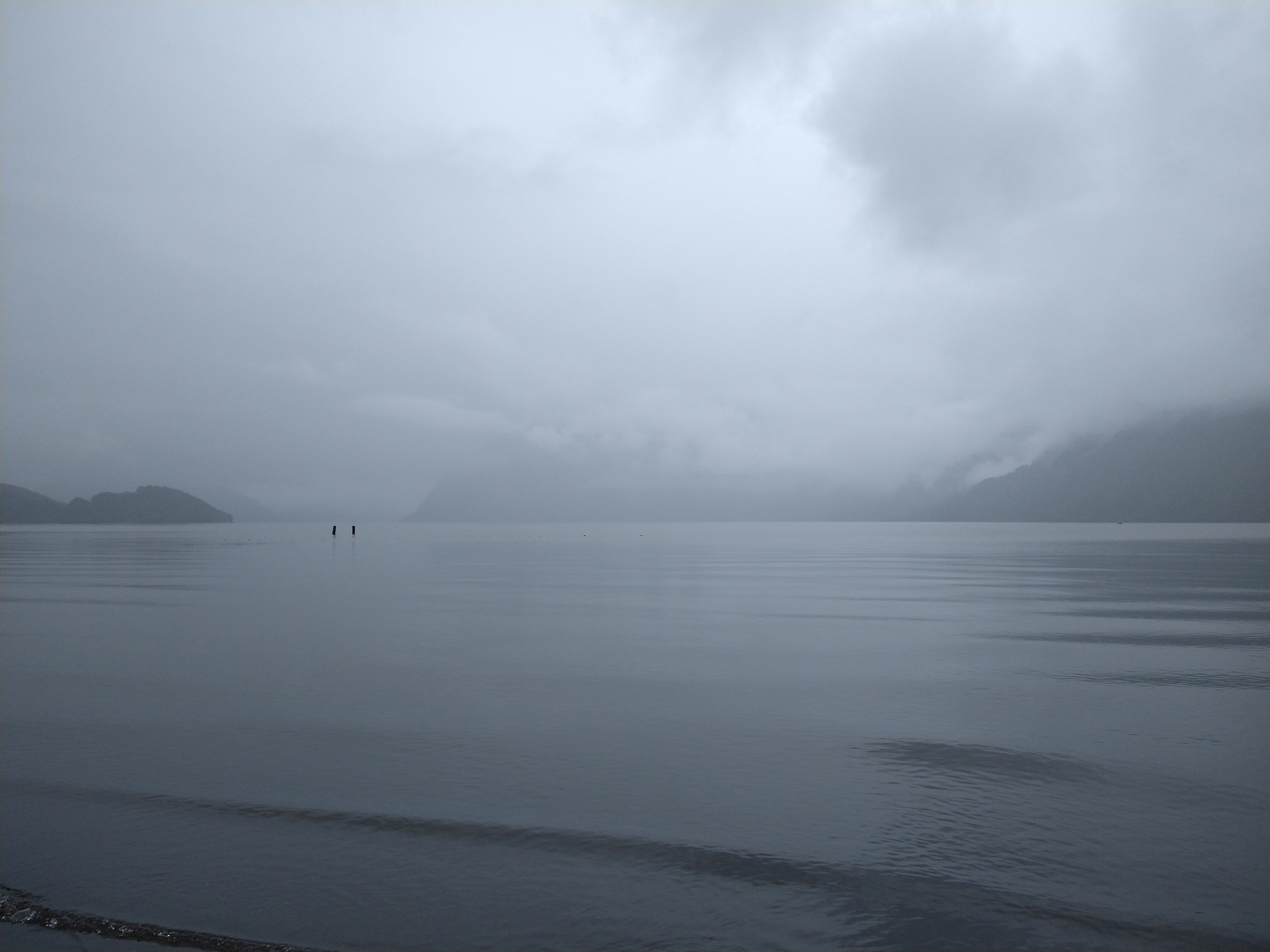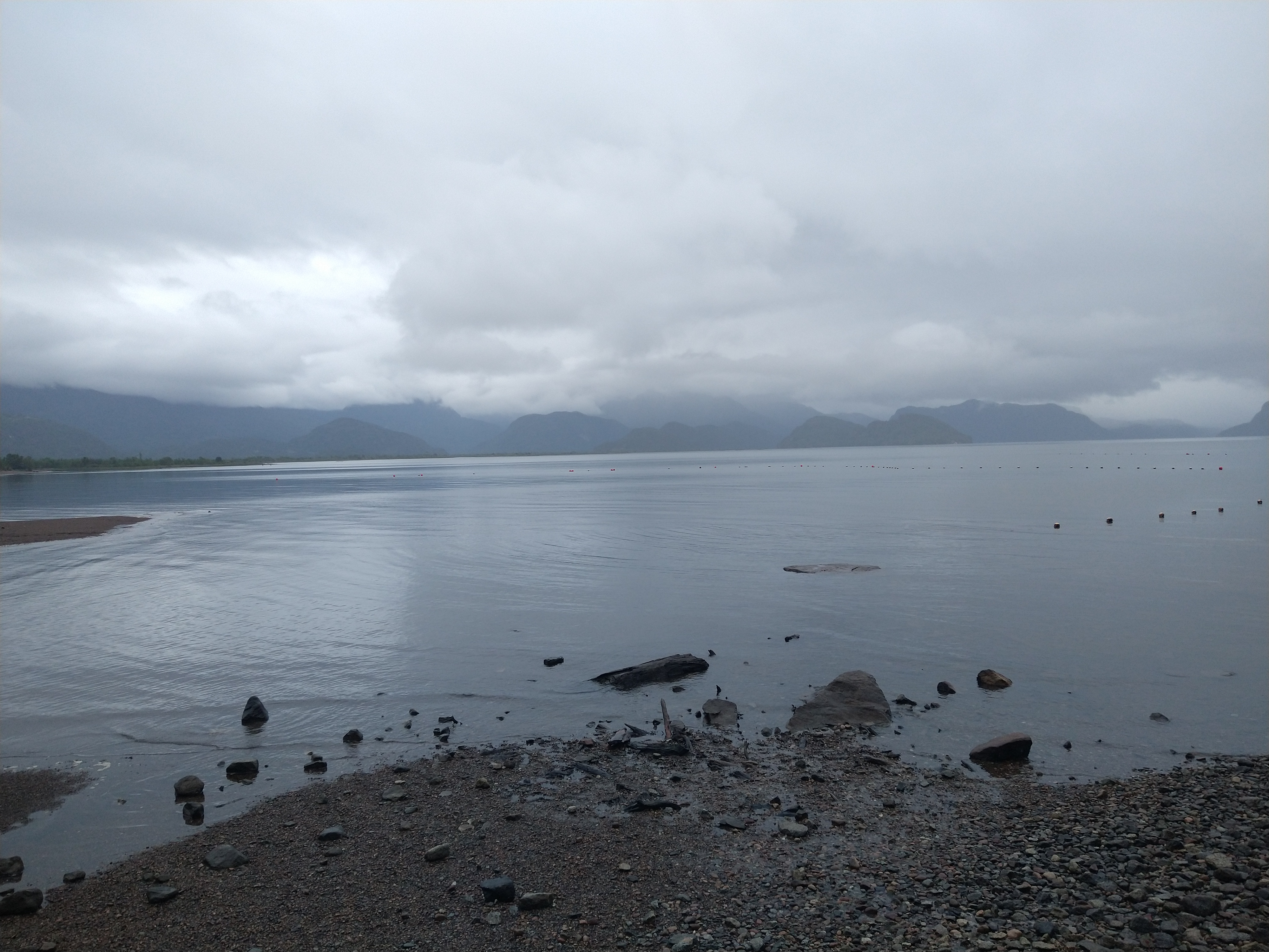I took a quick trip to Puerto Aysen, actually back up North and West from Coyhaique. I decided that if I’d probably be continuing due South, whether before or after working in Peru, I should make sure to go and say hi to the sea first up there. It was a gloomy, foggy day, and the most perfect time to visit the fjord. The clouds gave the islands an eerie, mystical look, and contrasted the stillness of the water. I could see fishing boats miles and miles away looking like they were sitting on glass. I walked the beach, occasionally greeted with some light rain. Waterfalls trickled from the clouds, from a mysterious world above that I could not see. Everything was silent, except for some gentle lapping on the shore.