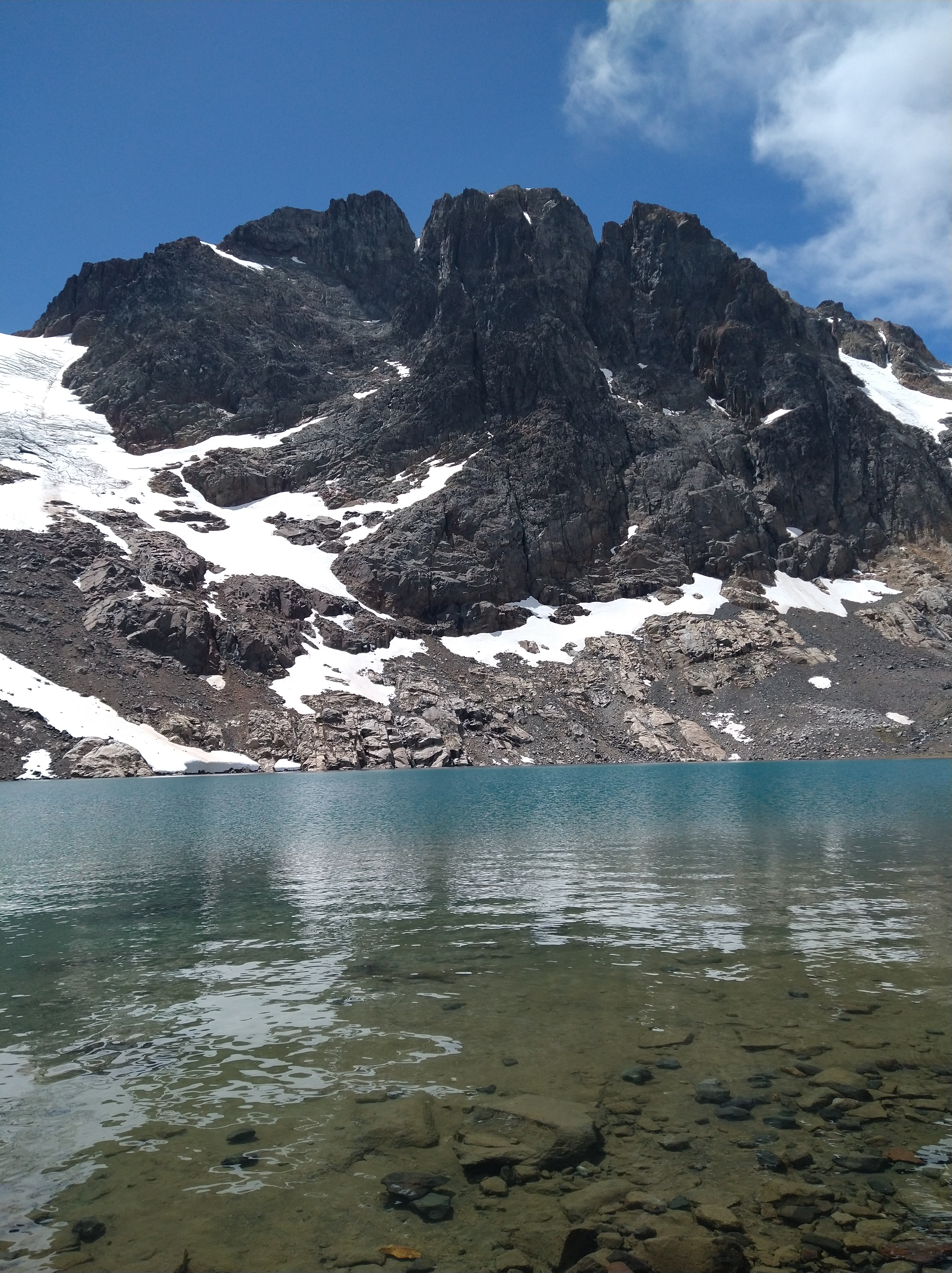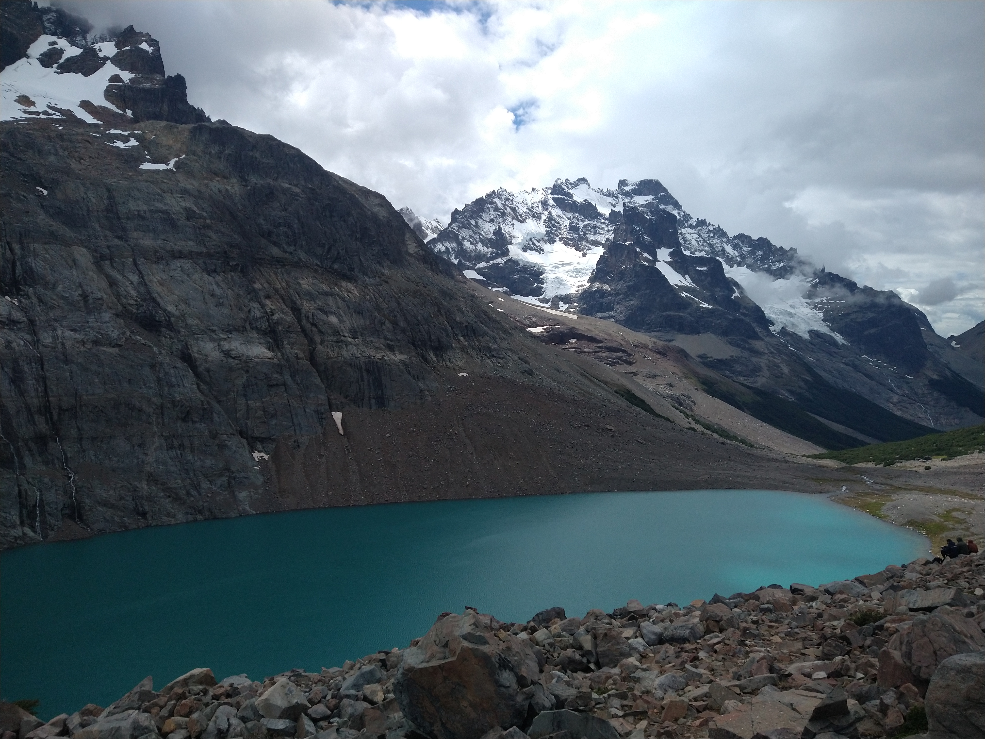 Cerro Castillo towered above the lagoon. The glacier was quite small and riddled with crevasses. There were some “dirt slides” down the glacier and cascades of water trickled down into the turquoise lagoon. We marveled about how deep the lagoon must be and wondered how it formed there. The spires were spiky and oddly shaped and we guessed it must be wind erosion. My friend pointed out a snow ramp that is the only access to the true summit of the cerro and it looked crazy steep. Bundled up against the wind, we snacked and chatted and gawked at the mountain.