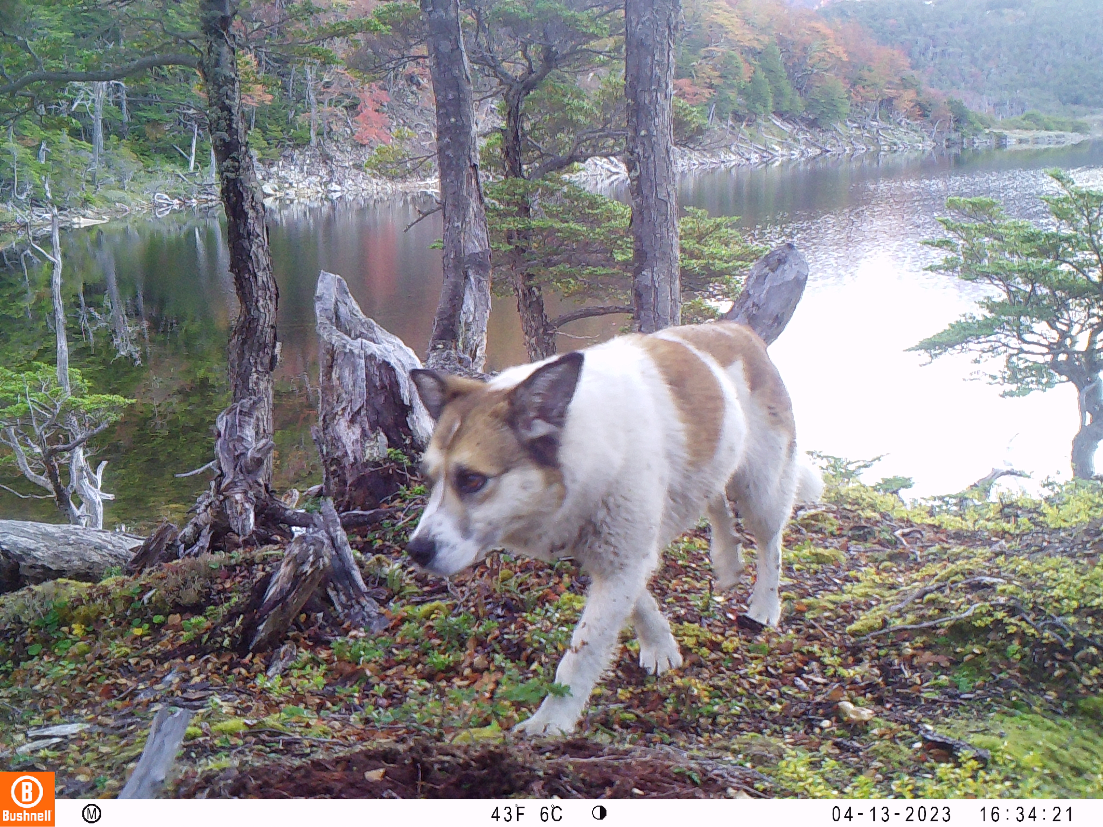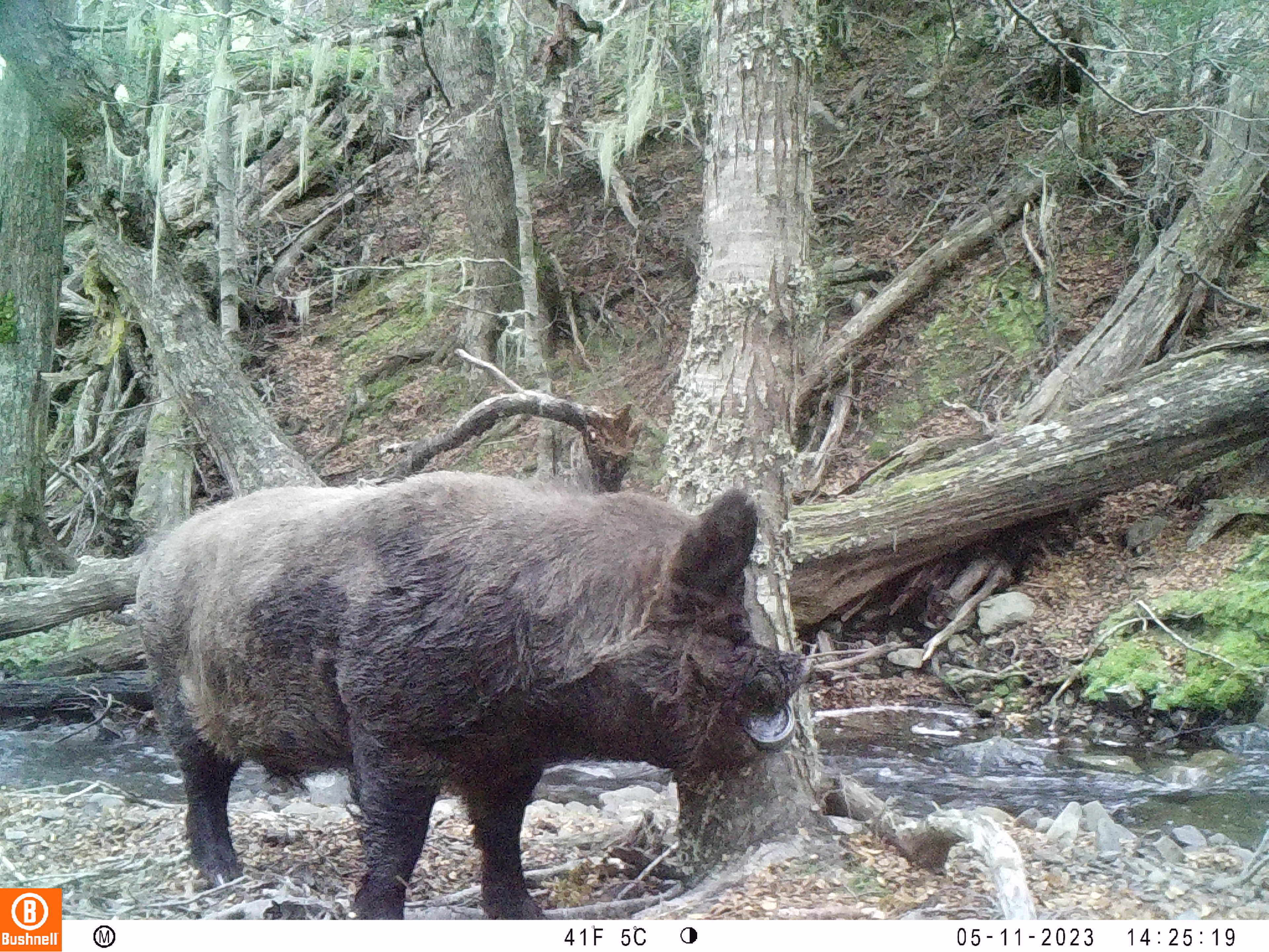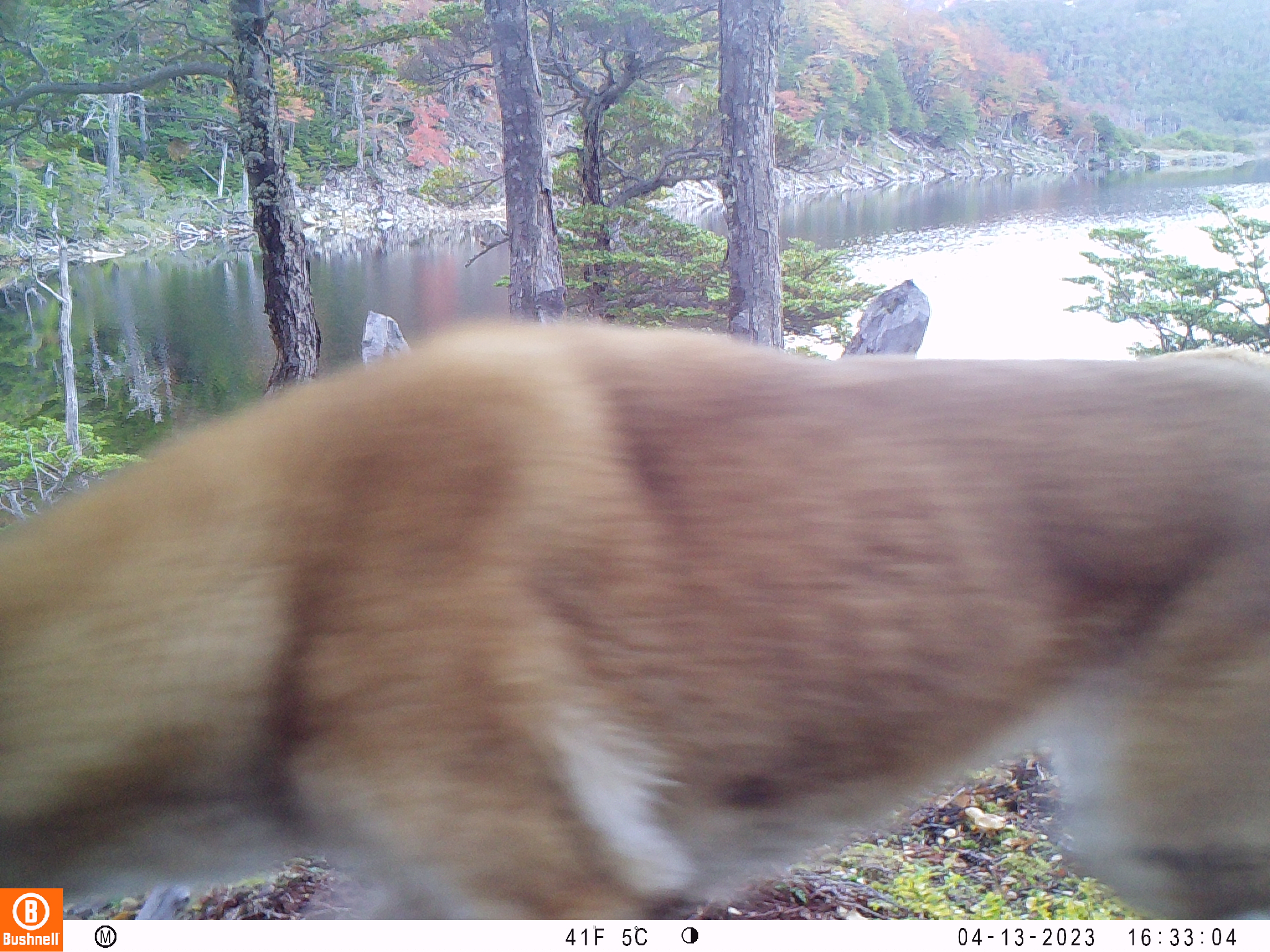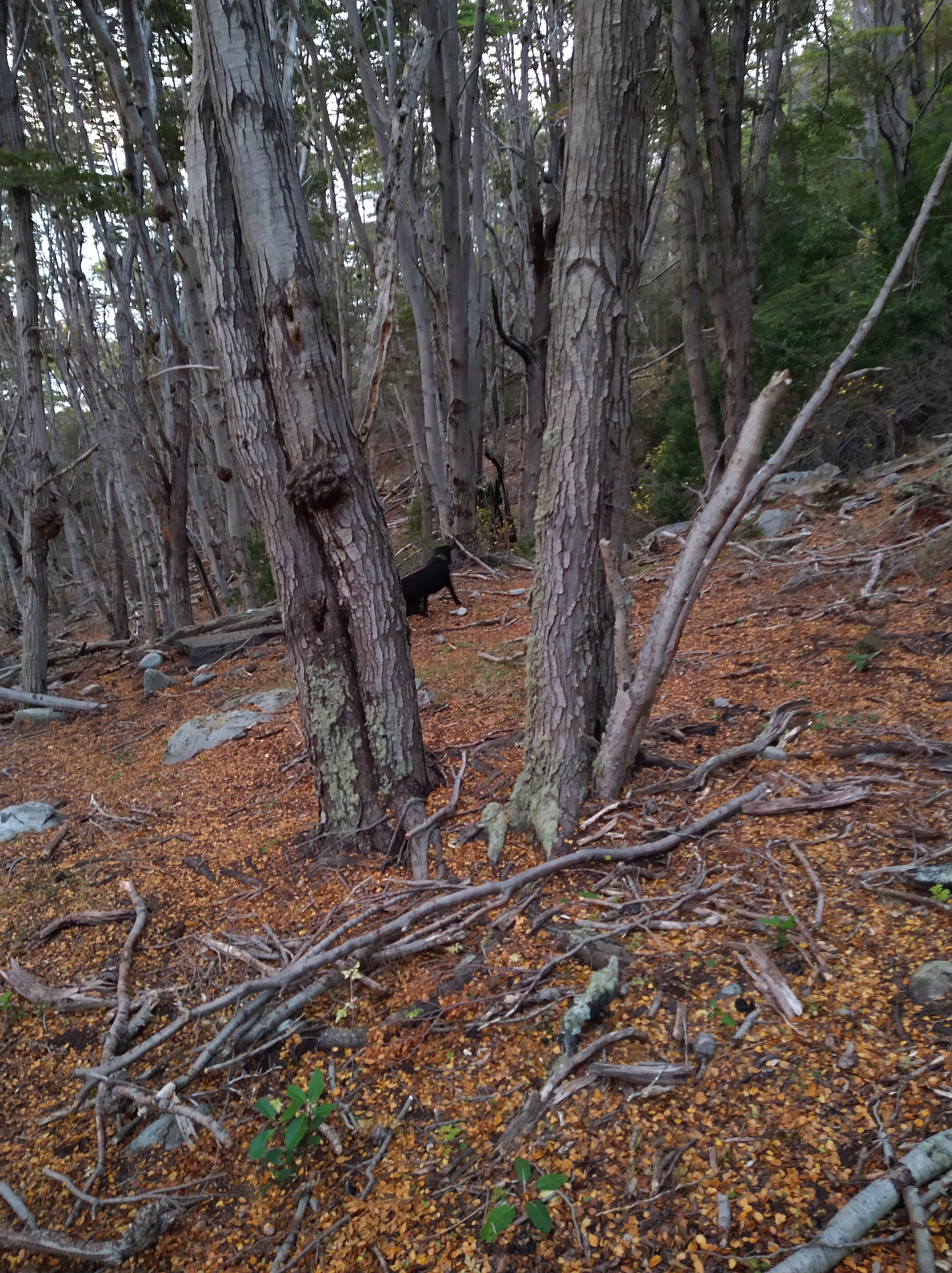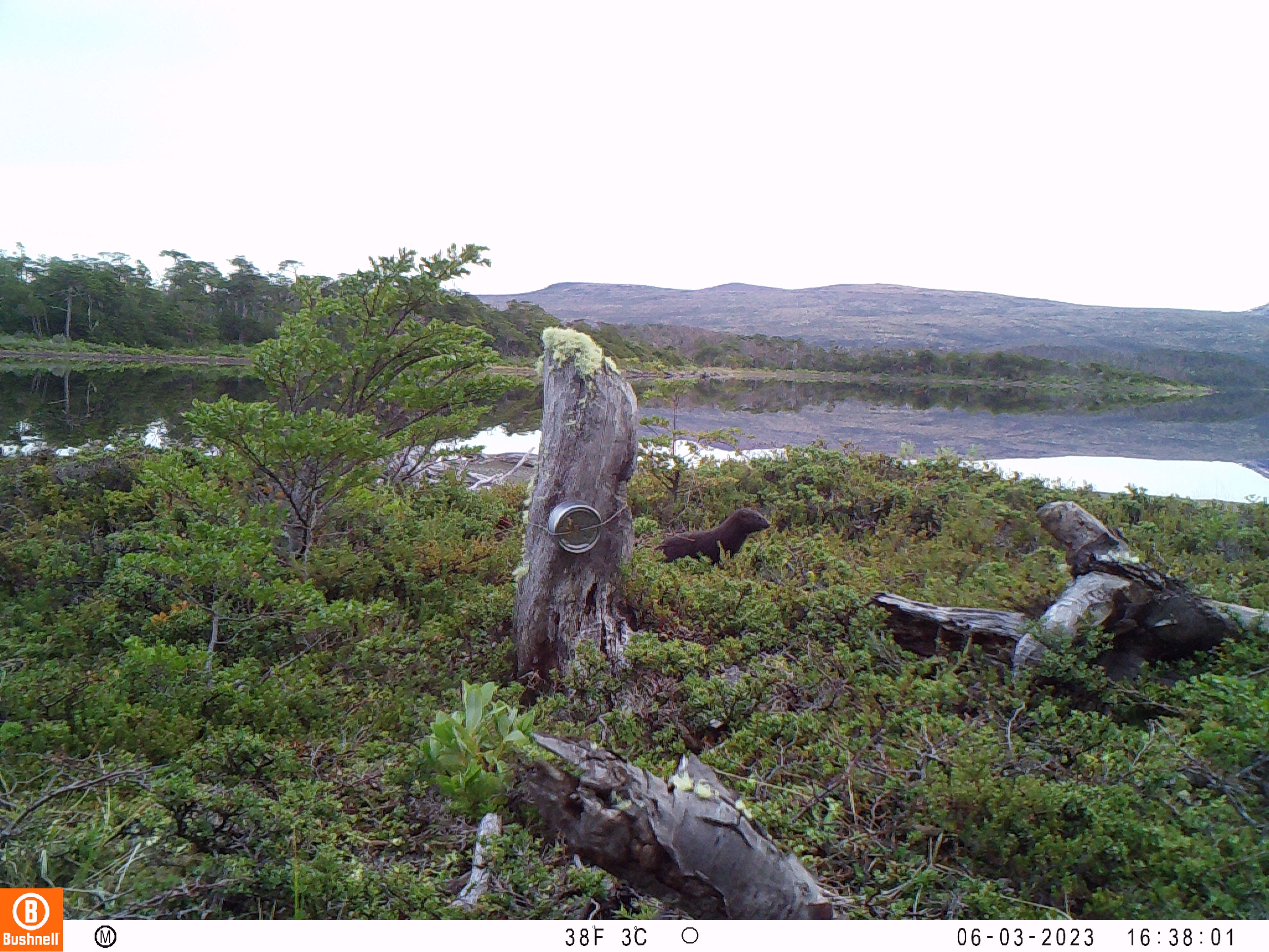 A few dogs bounded across the farm at the start of the trail and one took a liking to us. He was black with grey on his face and paws. As we set up the trail, he trotted ahead, as if showing us the way. The trail was well marked and we broke our promise of verbally acknowledging this, now having a superstition that as soon as we say a trail is in great condition it disintegrates. We followed a gradual slope up along Rio Lum and placed one camera about 2 km from the road. Future us would be happy for just a short day hike, and the river looked like it could be minky. (Mink are one of the invasive species we are interested in detecting with camera traps and environmental DNA sampling). We camped a bit farther up the trail and were treated with FM radio reception through Nacho’s radio to listen to some latin tunes while we watched Ushuaia light up across the channel.