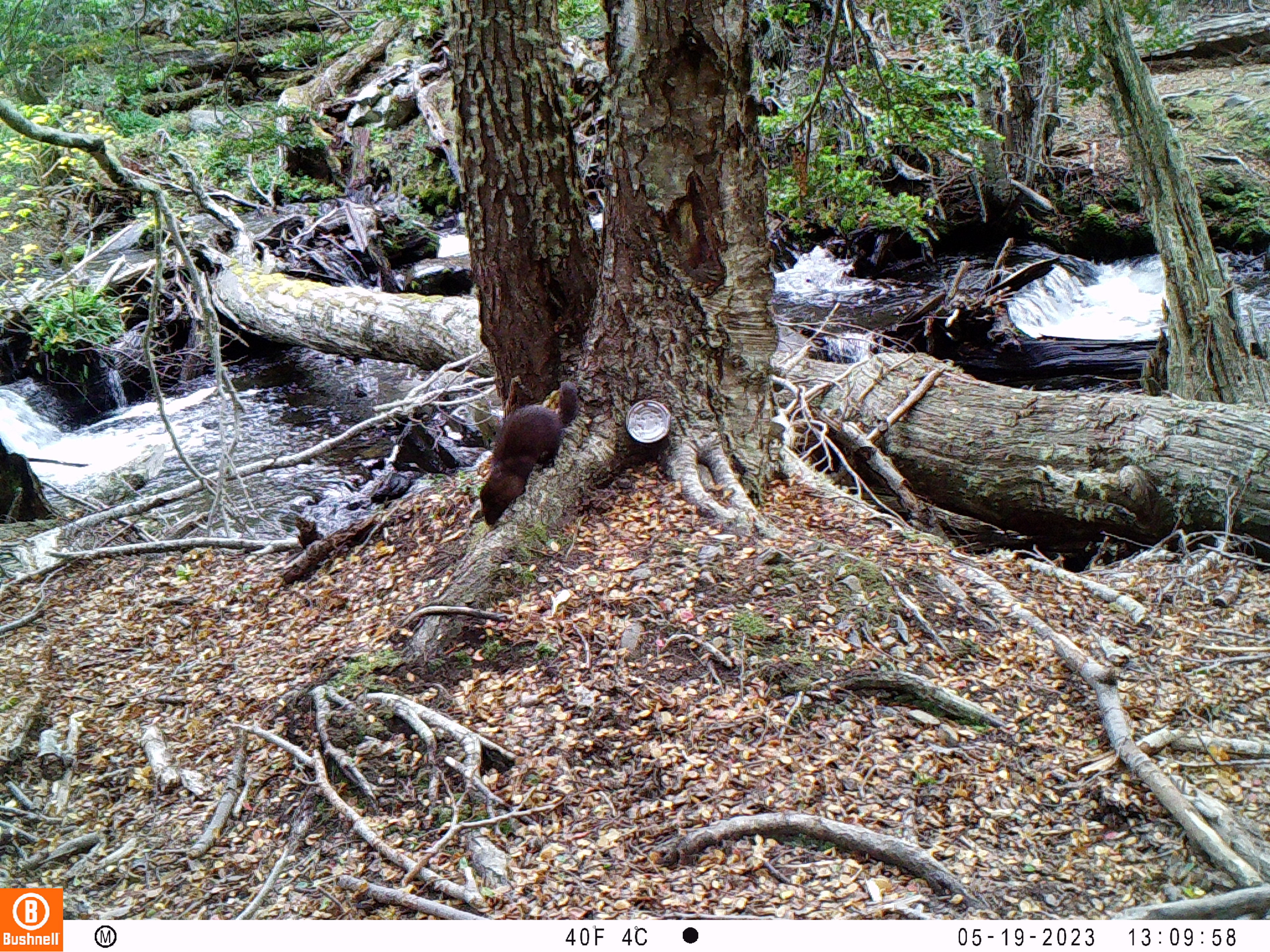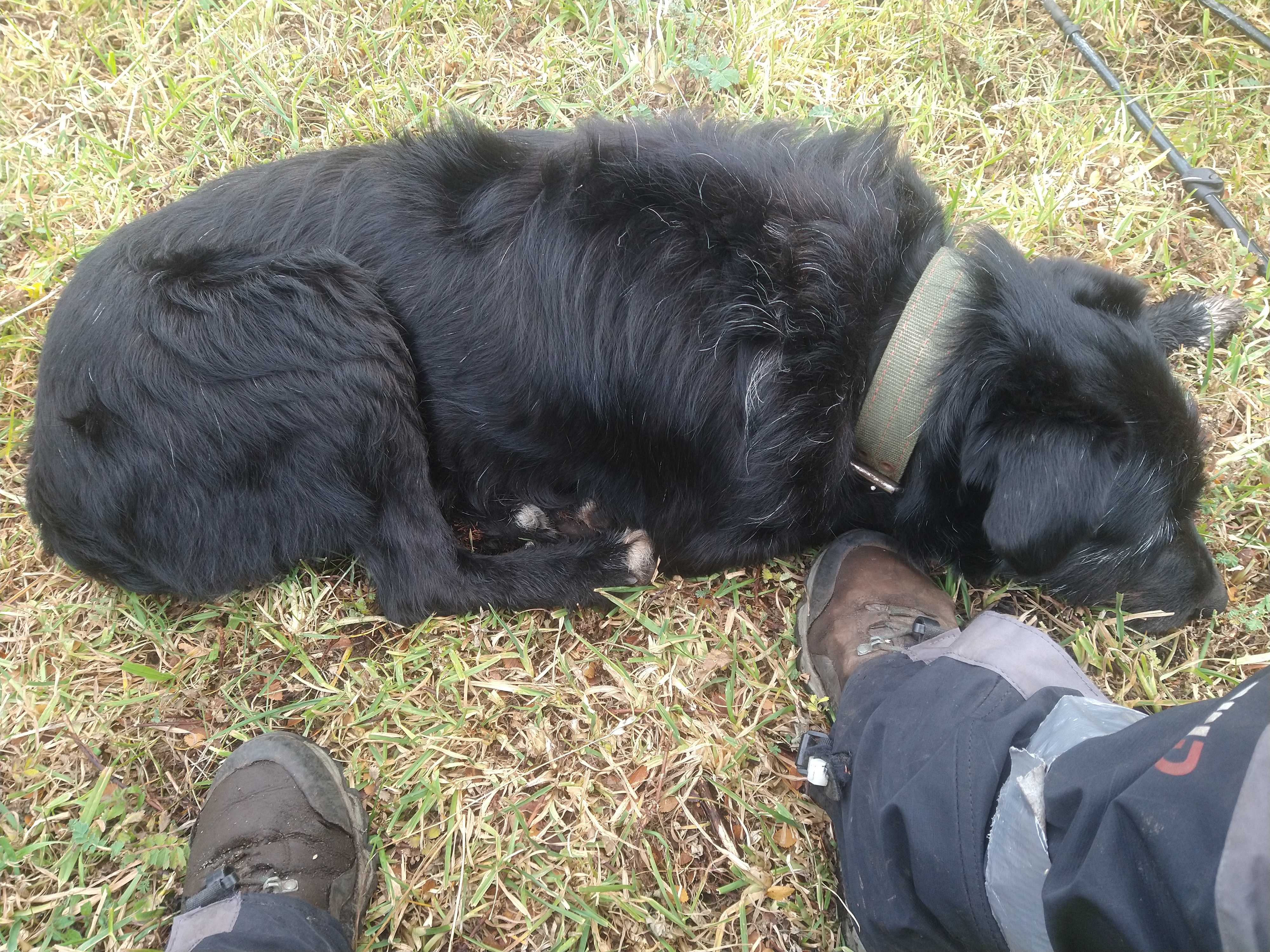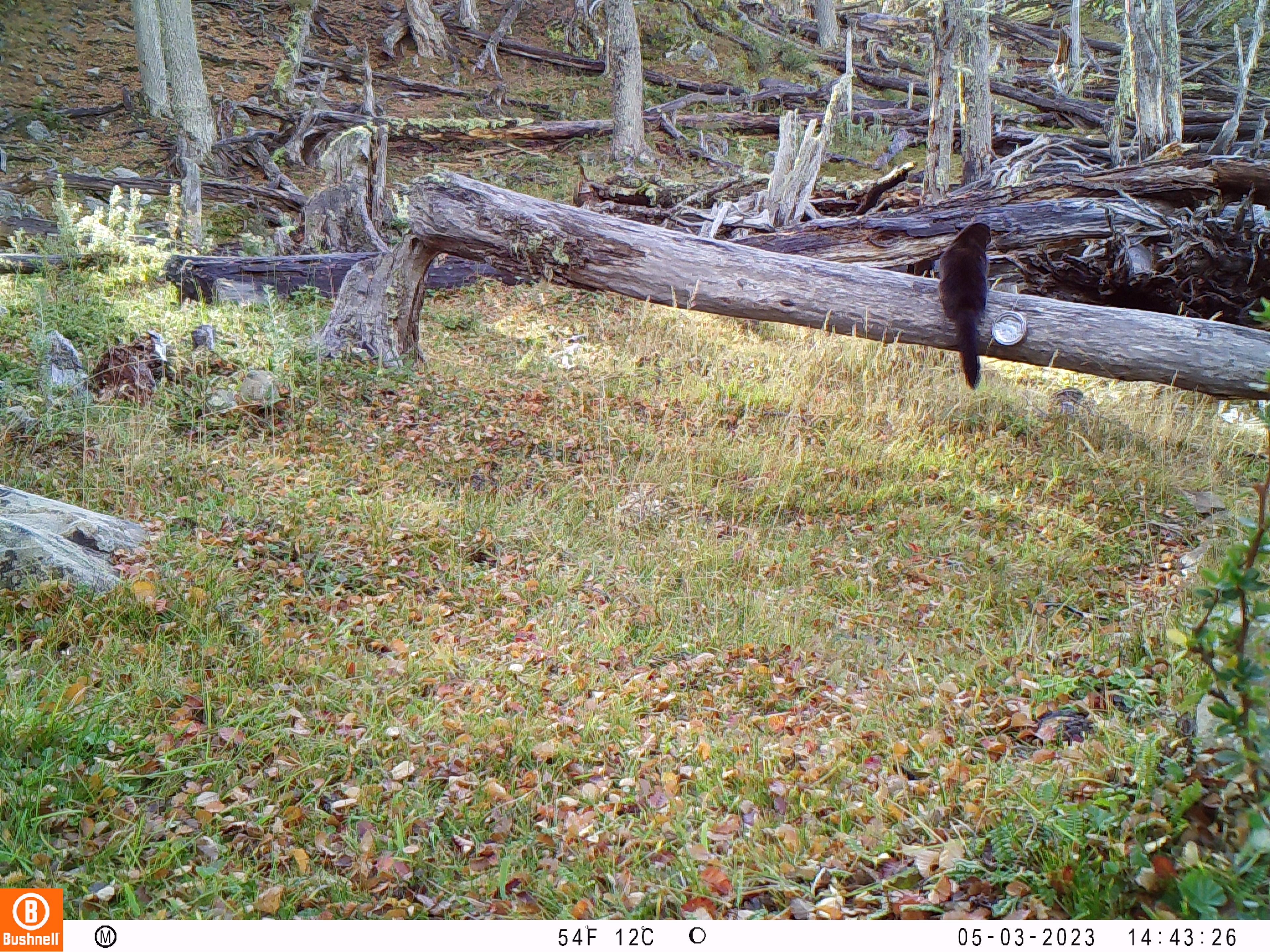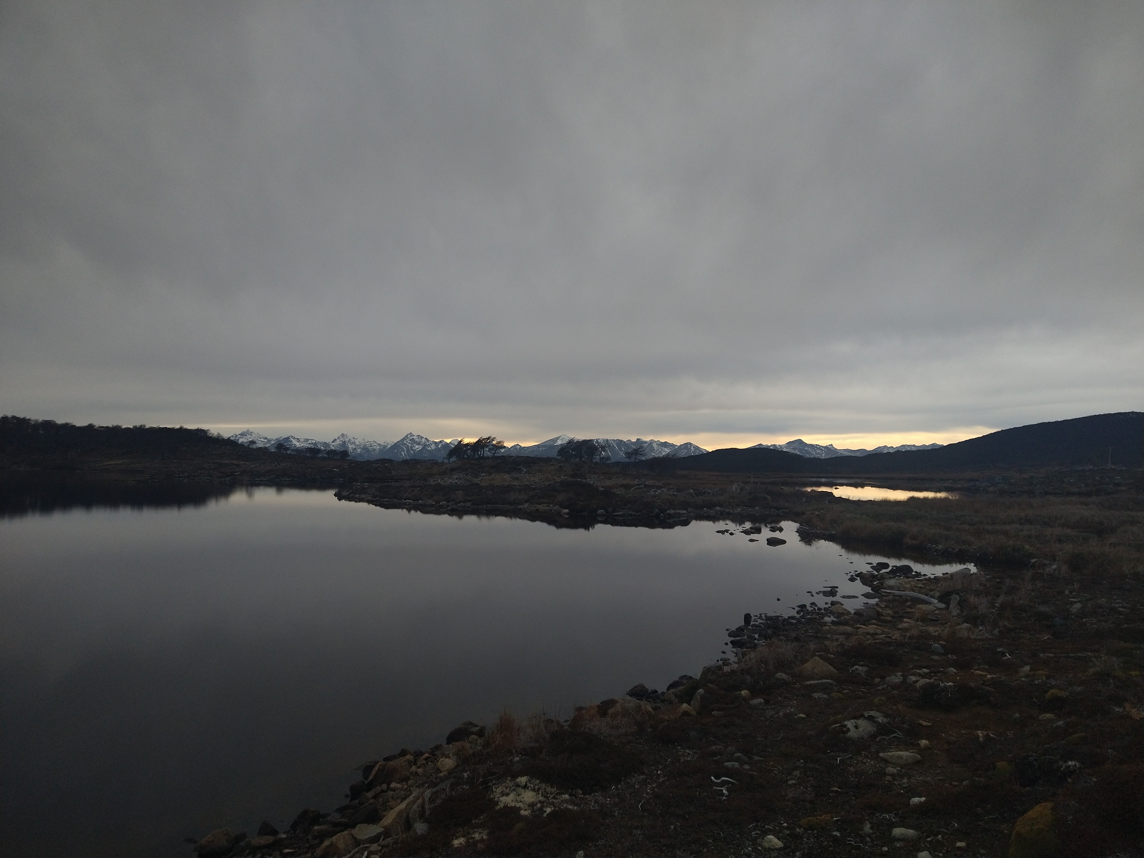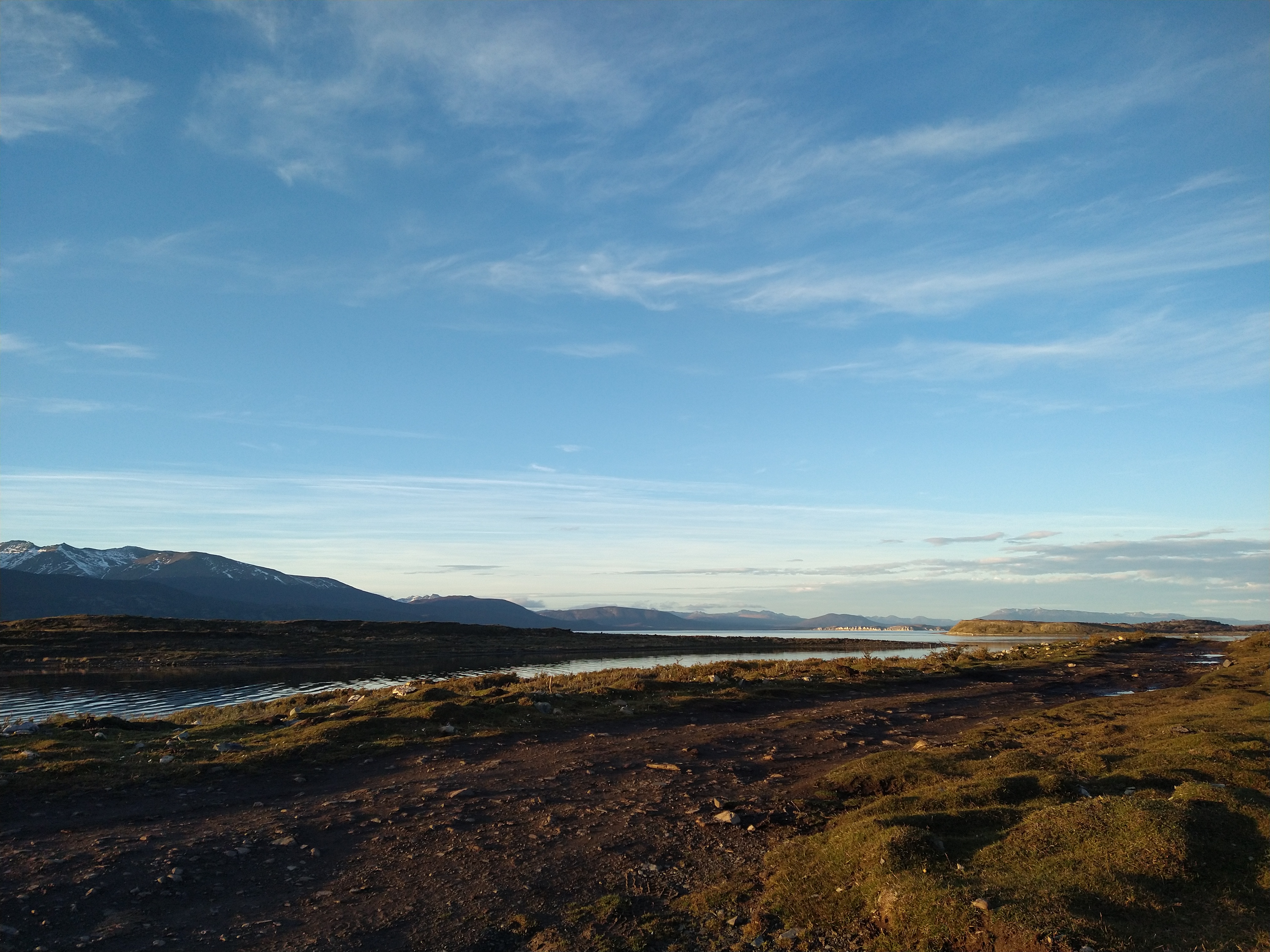 A few dogs bounded across the farm at the start of the trail and one took a liking to us. He was black with grey on his face and paws. As we set up the trail, he trotted ahead, as if showing us the way. The trail was well marked and we broke our promise of verbally acknowledging this, now having a superstition that as soon as we say a trail is in great condition it disintegrates. We followed a gradual slope up along Rio Lum and placed one camera about 2 km from the road. Future us would be happy for just a short day hike, and the river looked like it could be minky. (Mink are one of the invasive species we are interested in detecting with camera traps and environmental DNA sampling). We camped a bit farther up the trail and were treated with FM radio reception through Nacho’s radio to listen to some latin tunes while we watched Ushuaia light up across the channel.