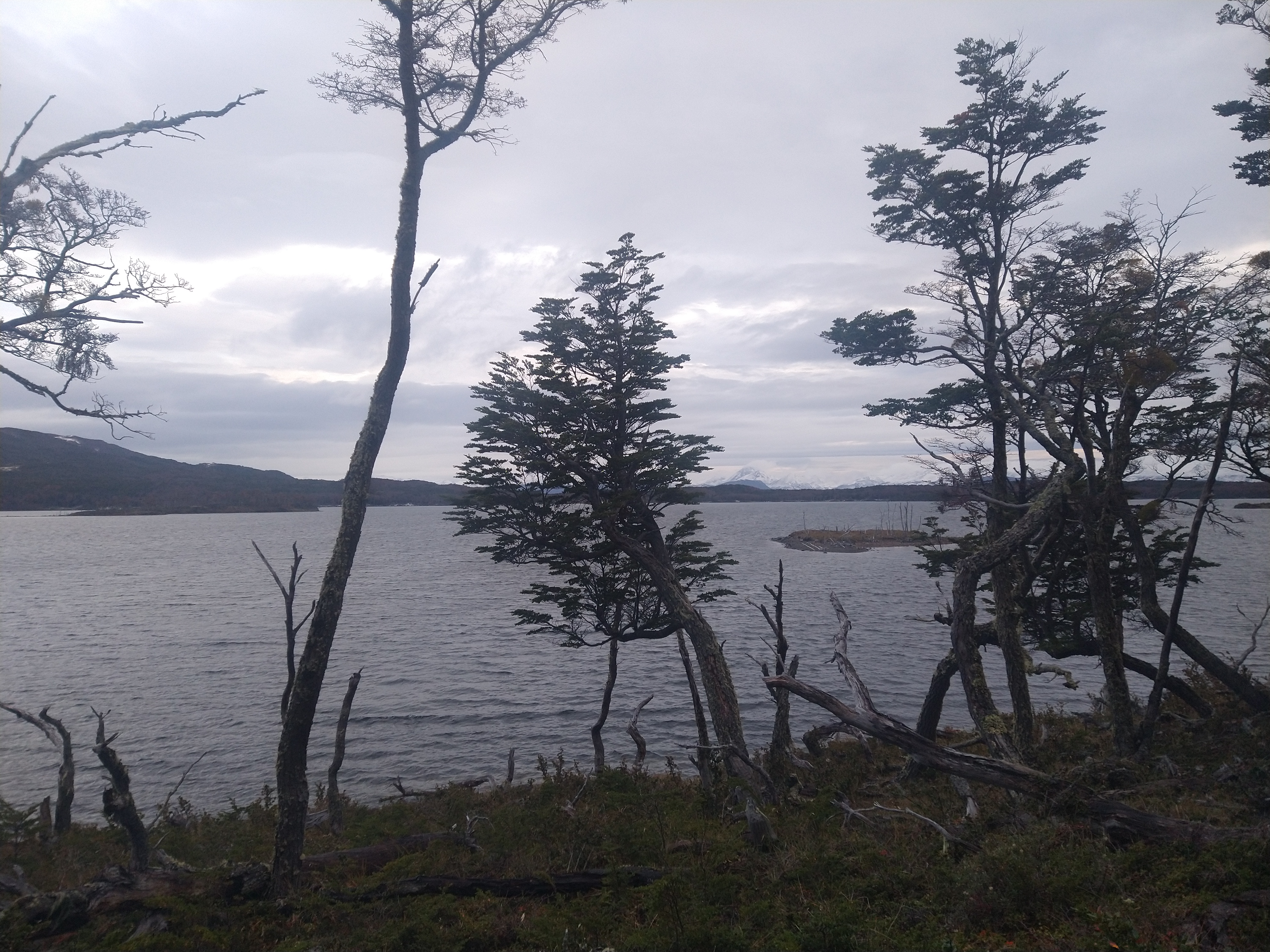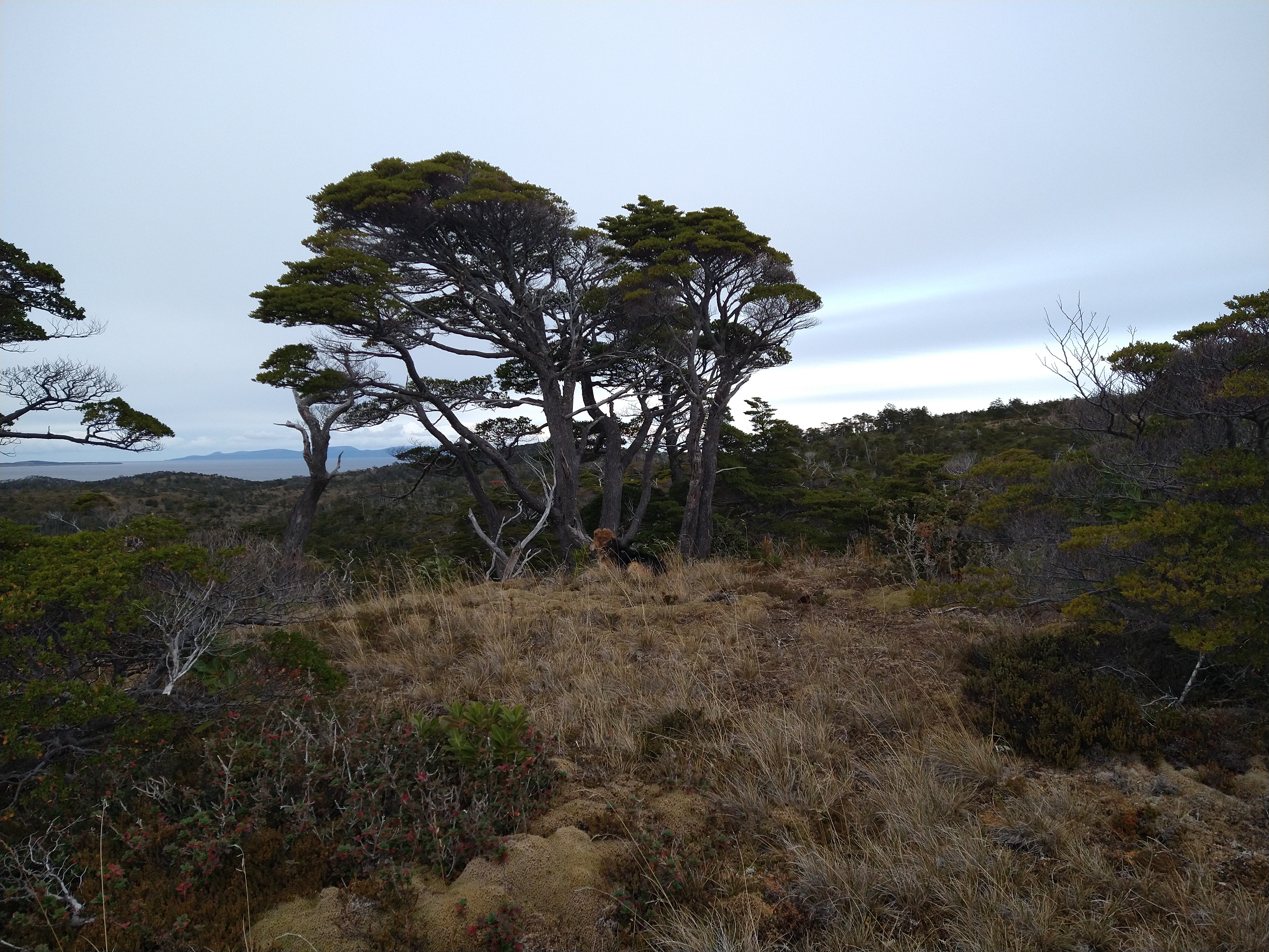We stayed high the next morning, above the ravine, and followed a better path of least resistance down. We could see Lago Navarino in the distance but knew from our slow pace and lack of trails that it would still be a while before we hit the shores. I decided to go with the waders again, it seemed like warmth was more important than flexibility here. We walked down the gently rolling slopes and back down into the thick forest. Here, we would be presented with choice after choice about which way looked less hellish and may actually get us down to the lake. It was either thick brush, tight saplings that our backpacks would get wedged between when we passed through, or a lovely plant called Winter’s bark. Winter’s bark, Drimys winteri, is a small evergreen tree with thick, soft leaves and, in summer, big white flowers. It’s a beautiful, and preferred to bushwhack though due to its bendy branches. However, with the flexibility came the risk of getting whipped sharply in the face or ears as the branches sprung back. On one stretch of especially hellish bushwhacking, the “f^%$ around find out” phenomenon seemed especially relevant. I shared my thoughts with Nacho and tried to relate this ridiculous idea of ours to link the lakes in the manner we were trying to by saying, “You know, if you don’t f^%$ around, you’re not going to find out!” And we found out why there wasn’t a trail linking the port town to the lake.