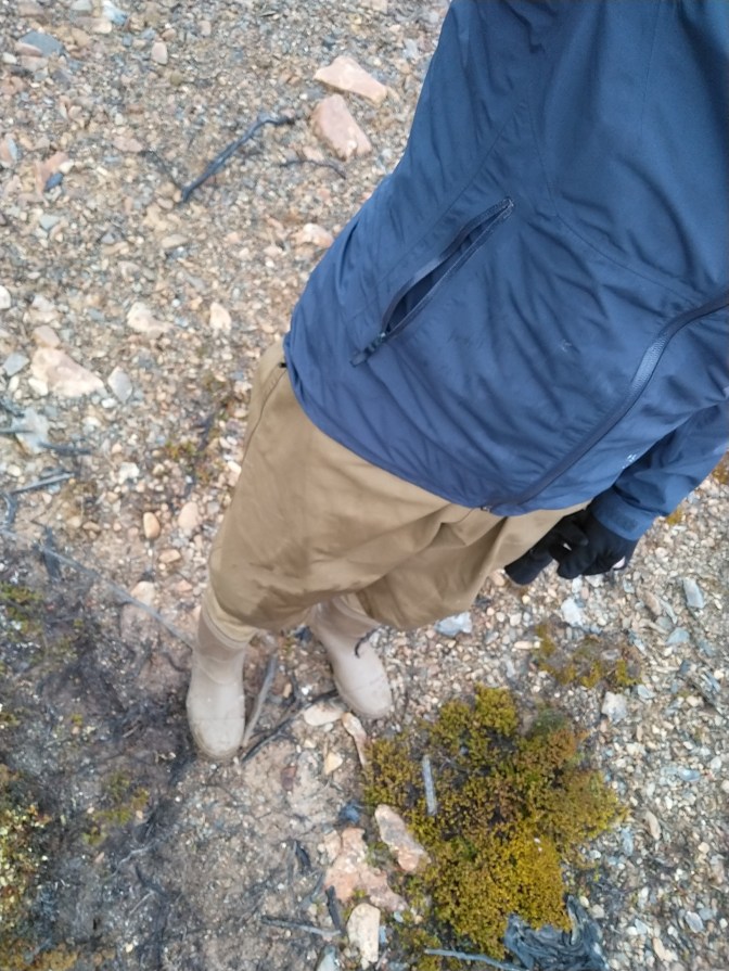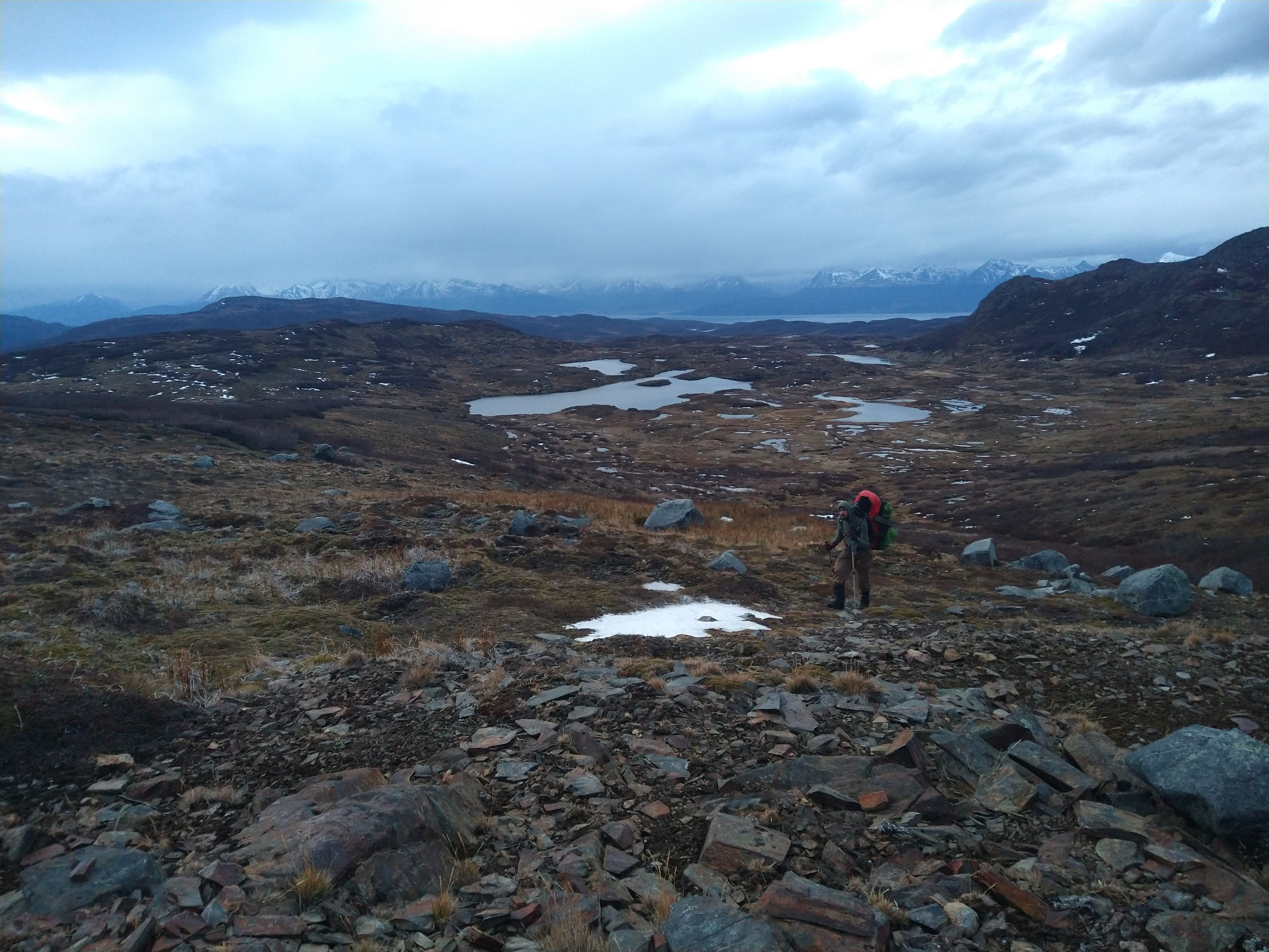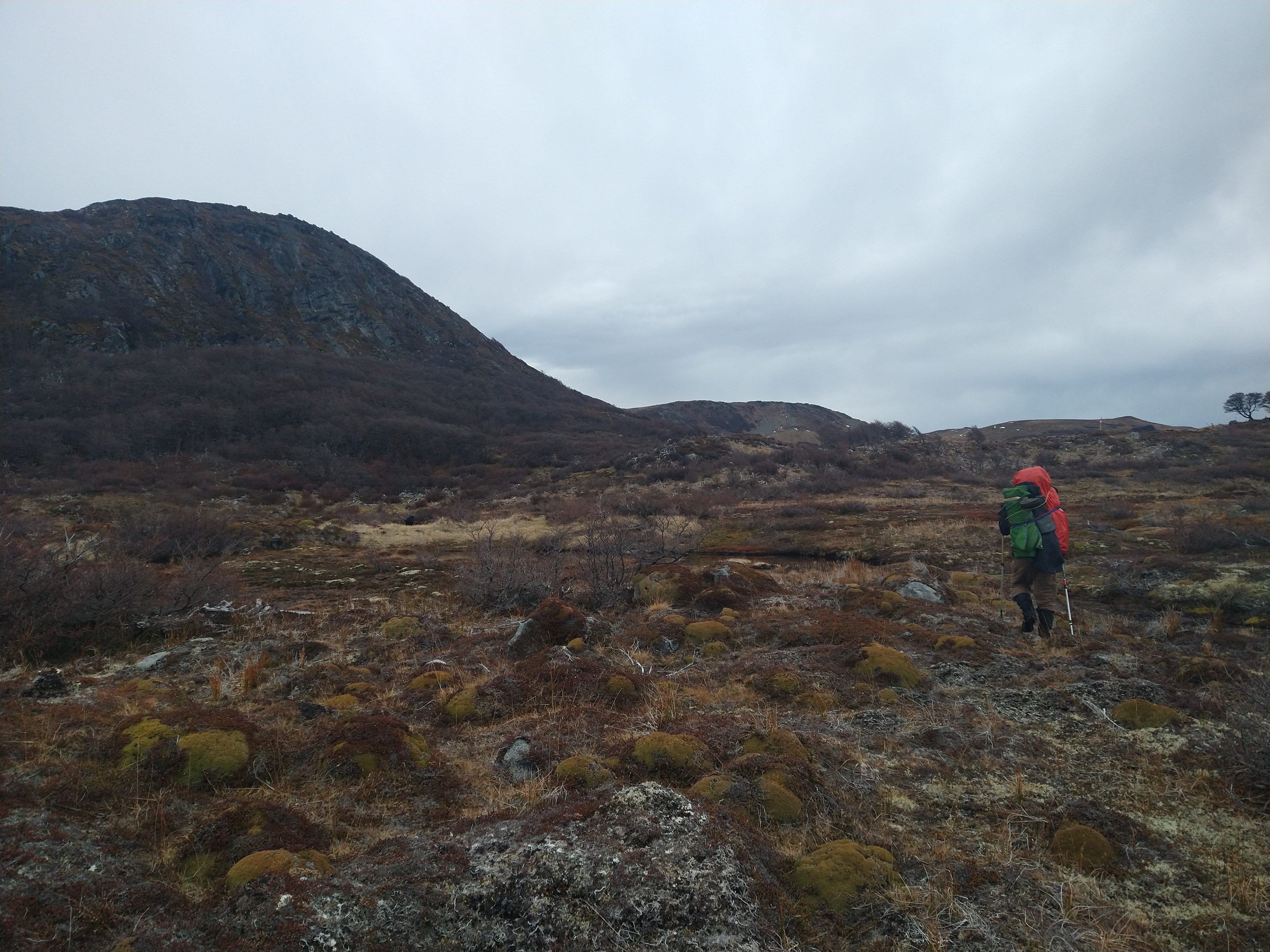 We woke up to some light blowing snow the next morning, a storm was moving in from the southern Pacific. We were relieved to see the dog must have returned home since he wasn’t curled up by the tent like the night before. We quickly broke down camp and started to move, it was cold. We made our way a bit higher up through more turba. I decided to bring waders after our Lake Windhold adventure, and since my hiking boots were losing more structure with every kilometer we walked and were now full of holes. My feet were happy and dry in the waders, but I struggled making the high steps through the bog with the heavier pants tugging at my knees. I was also sweating profusely with the lack of breathability.