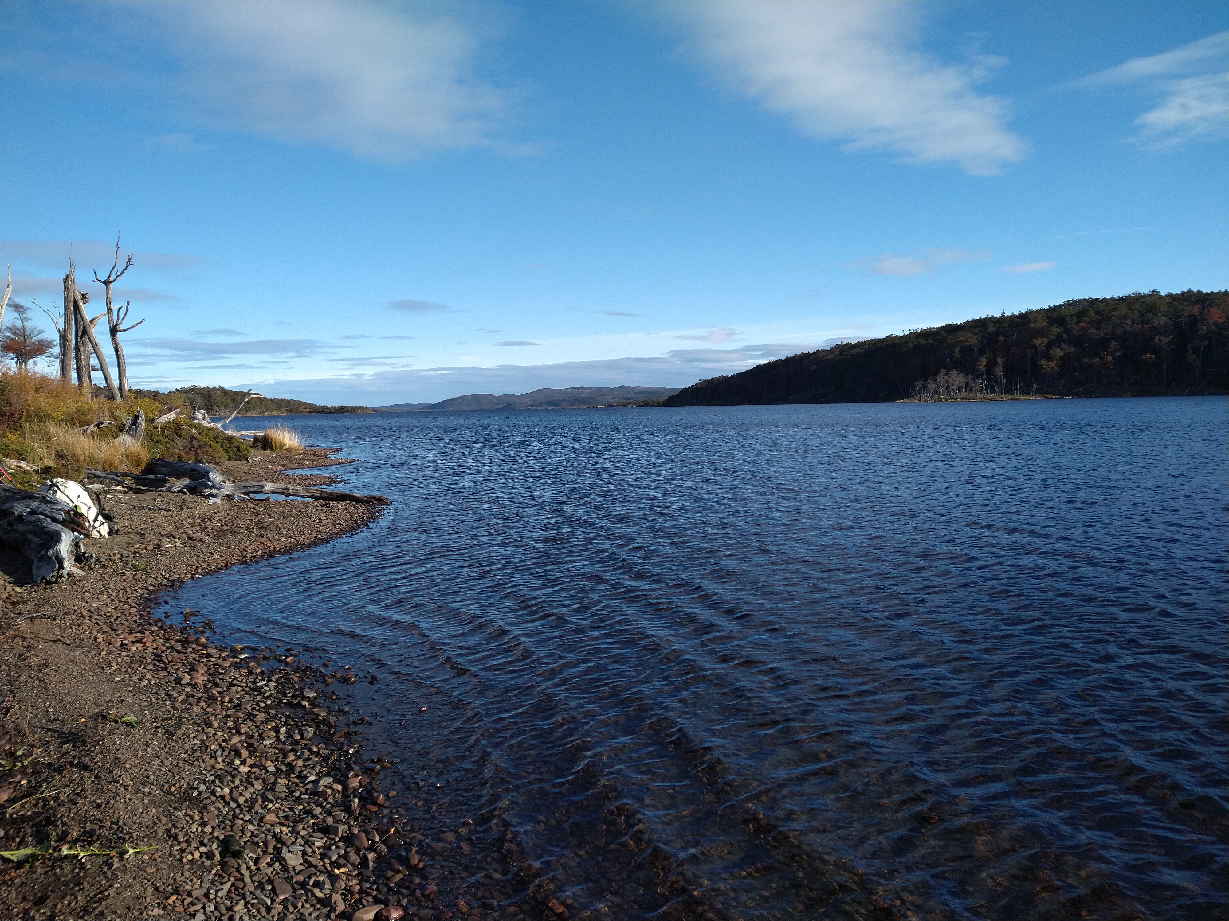 Eventually, we hit the shoreline. Alas, we could cruise the coastline. And it didn’t matter if there wasn’t a nice rocky beach to follow, we had waders/high boots so we could just walk in the lake! We set up the first camera at the Northern end of the lake. Ultimately, we decided that when we come back to retrieve the camera and collect the water sample, we would not do the multisport adventure loop involving the boat to Puerto Torro and bushwhack up and over the pass. Instead, we would just come in from the road on the North (where we planned to end this trek) and do an out and back instead. We set the camera at the northern most point of the lake for future Kelly and Nacho to have a bit of an easier time.