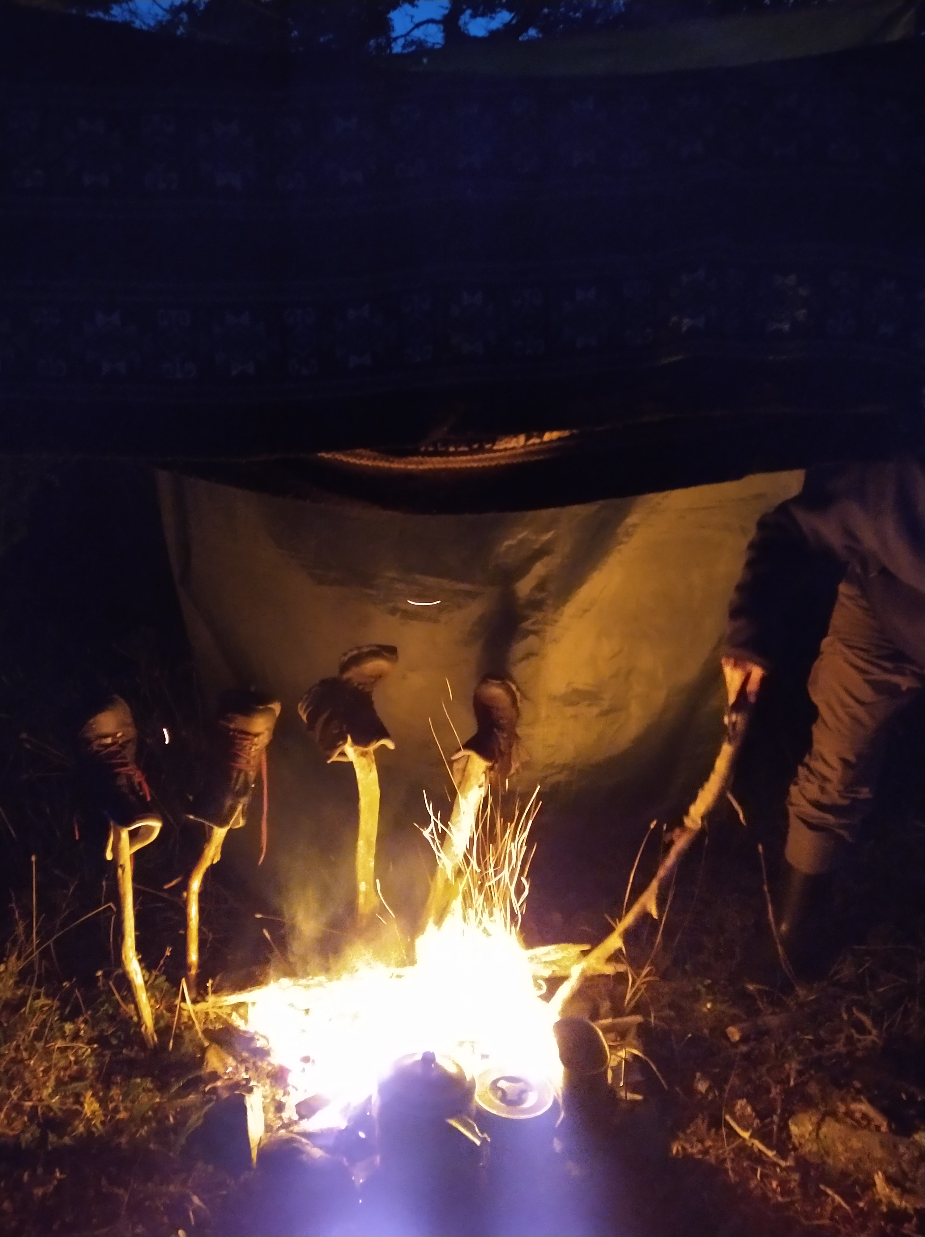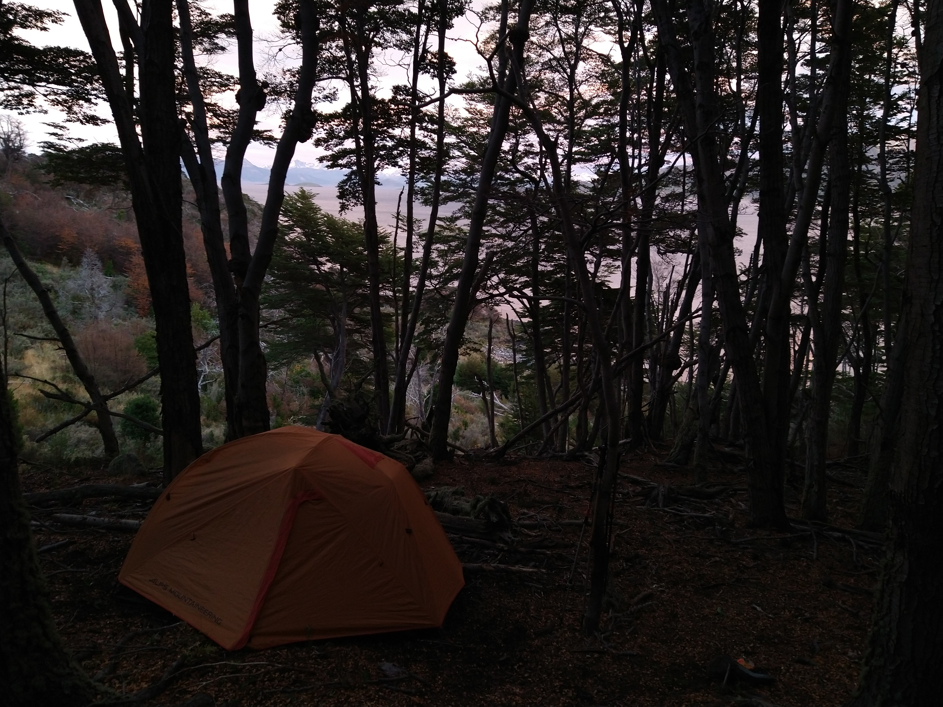 Once down at the lagoon, we found a place to make camp in a dense forest of short beech trees. Nacho built a fire while I set up camp and we feasted on our usual paste – instant potatoes, soy protein, and a soup mix. We tried to dry out what we could around the fire, but soon rain and wind pushed us into the tent.