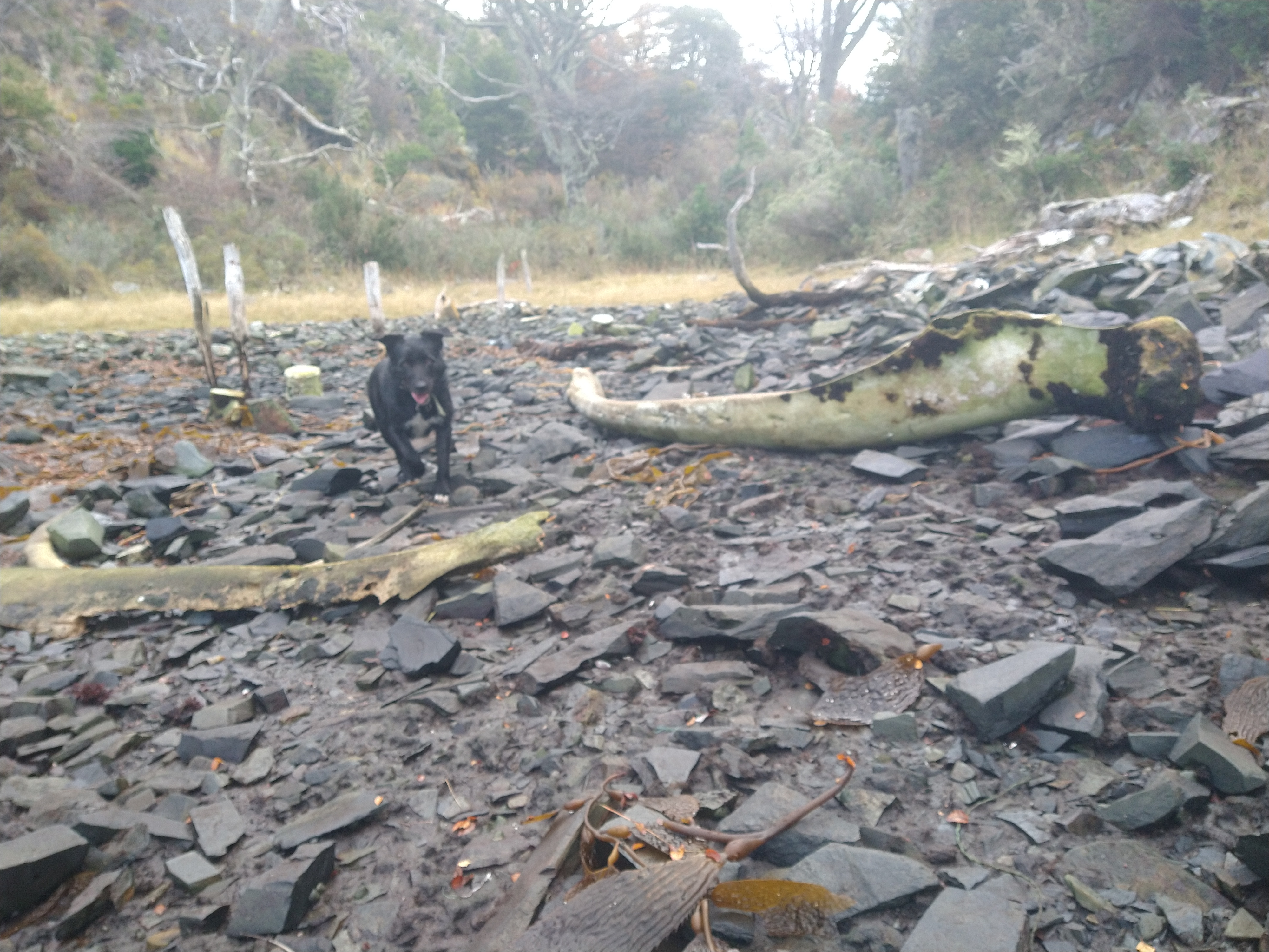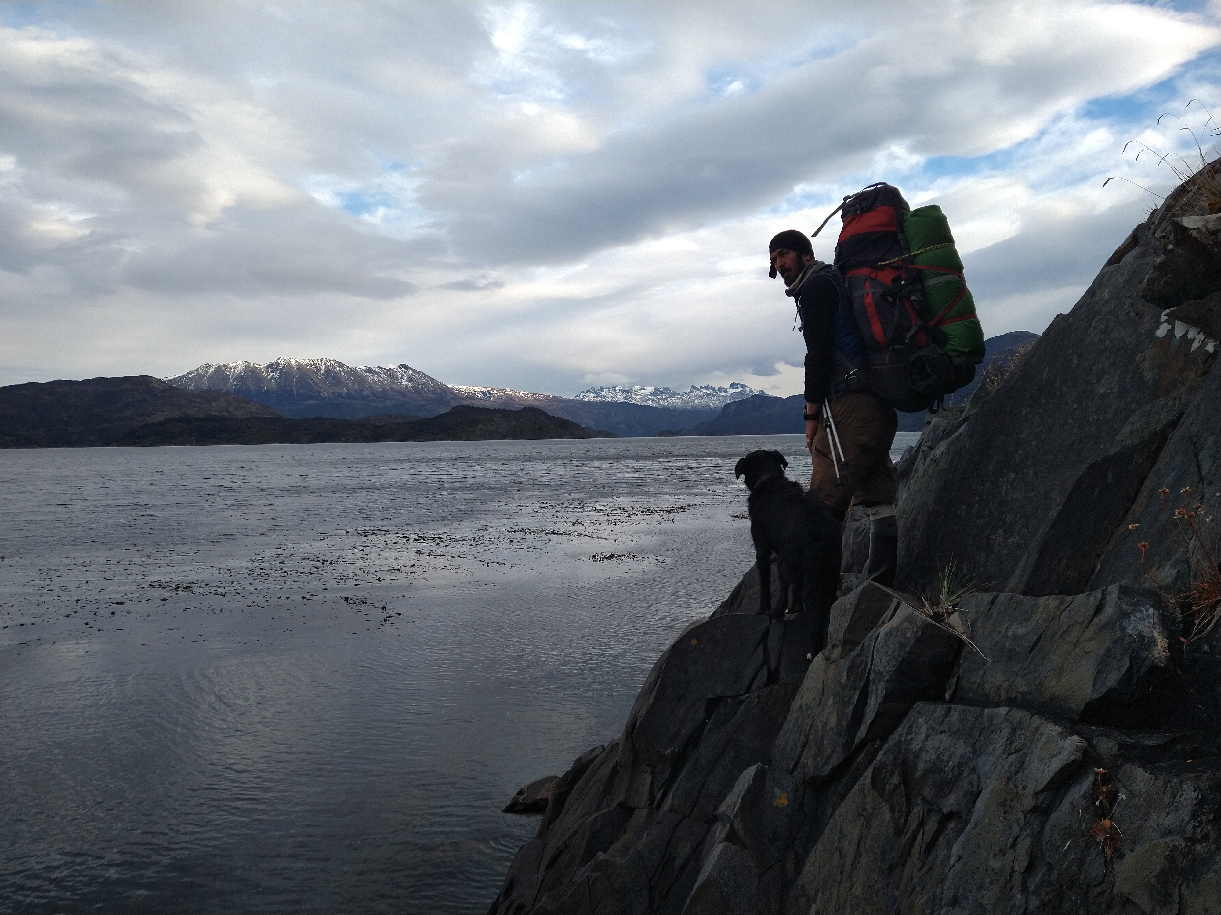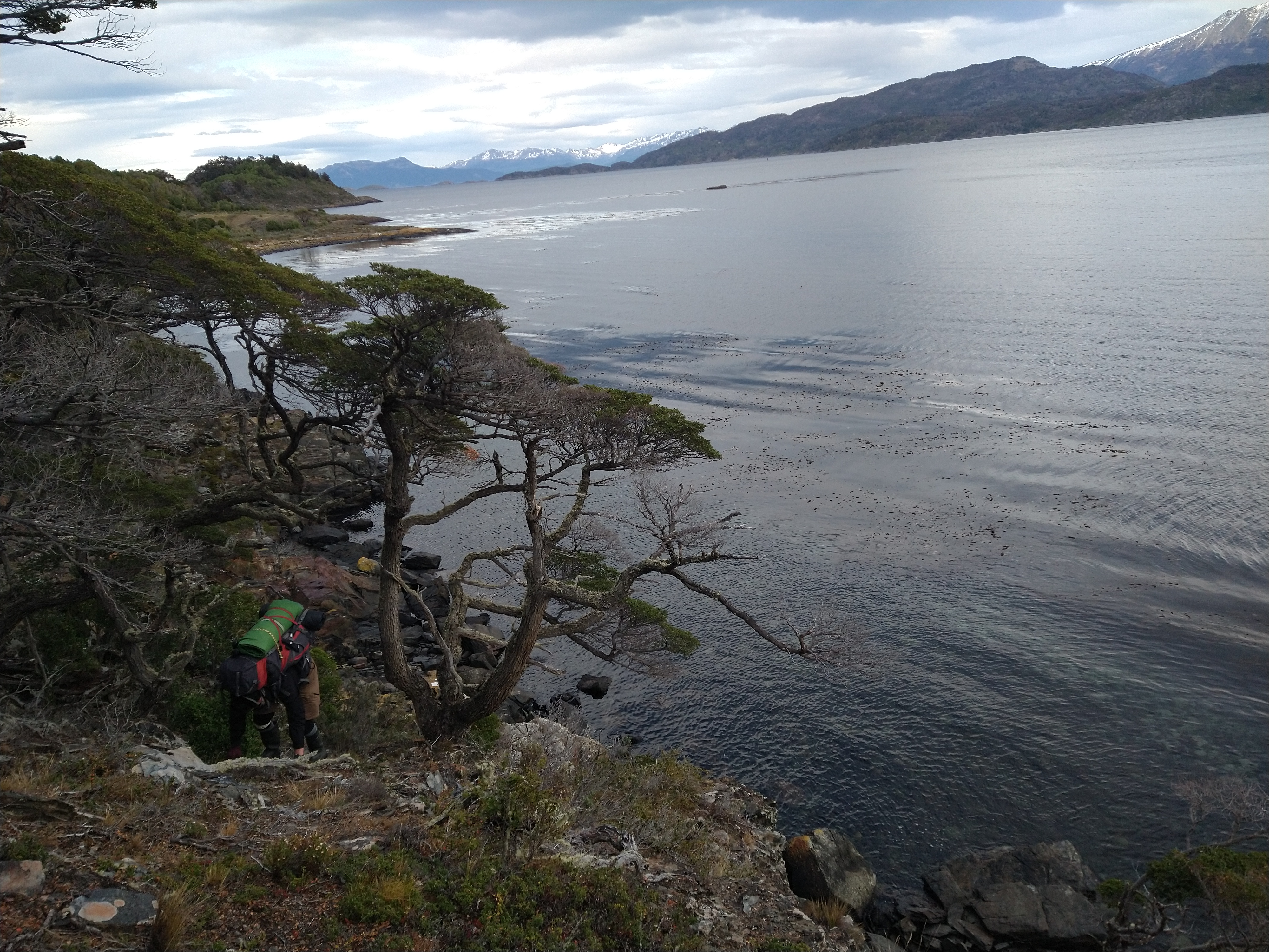 Over three days we skirted North to Puerto Inutil then due West to the coast. In the bay we found a plethora of jellyfish and some old whale bones washed ashore. I have no idea what kind of whale but it must’ve been huge! The vertebrae were bigger than my waste and ribs longer than I am tall. Sometimes we would scramble along the rocky shoreline, which seemed way better than stepping over fallen trees. Shadow turned out to be quite the climber and only needed help once on a downclimb. We were quite the adventure team.