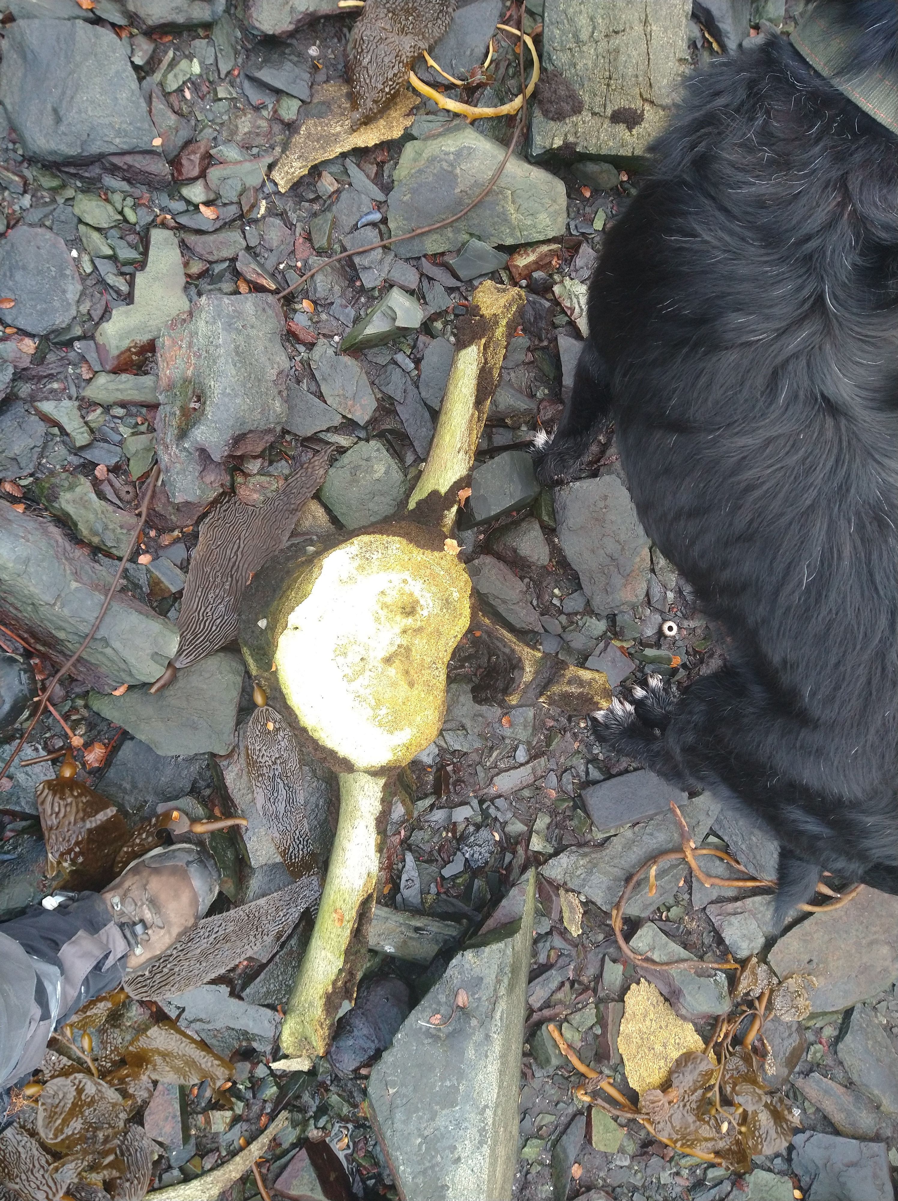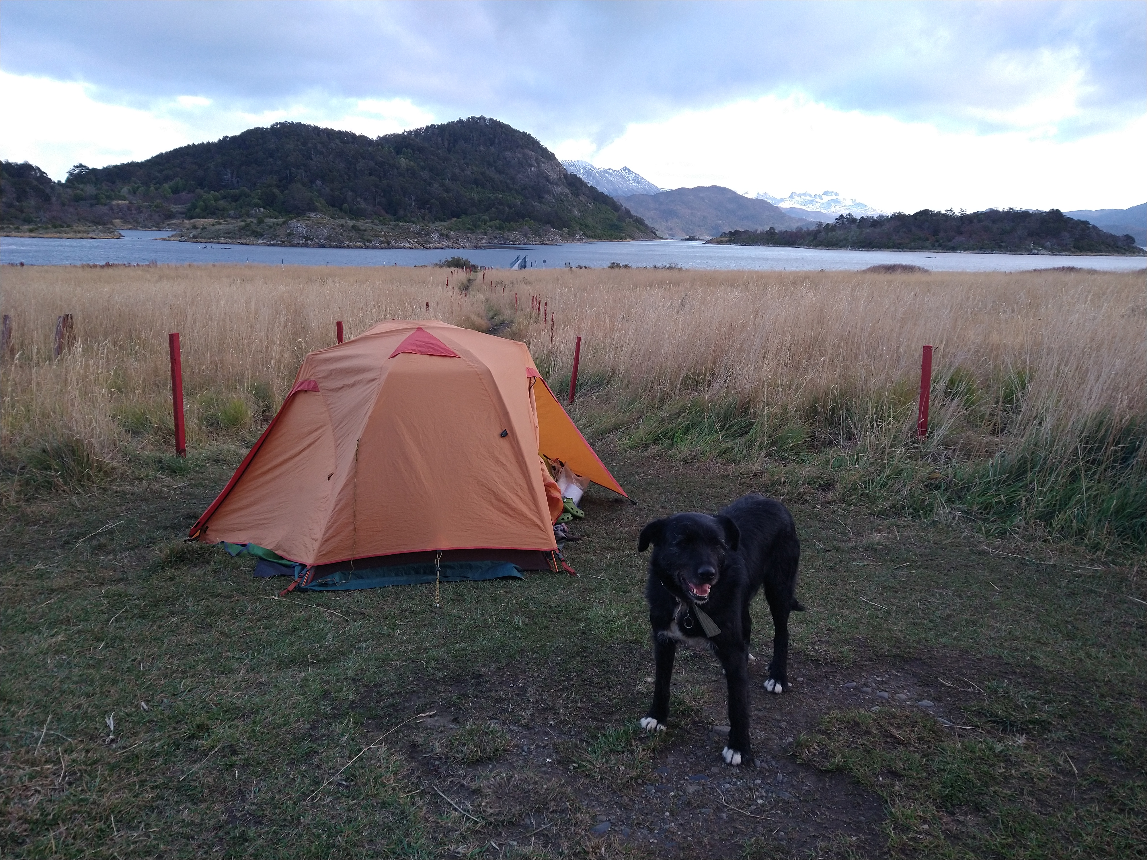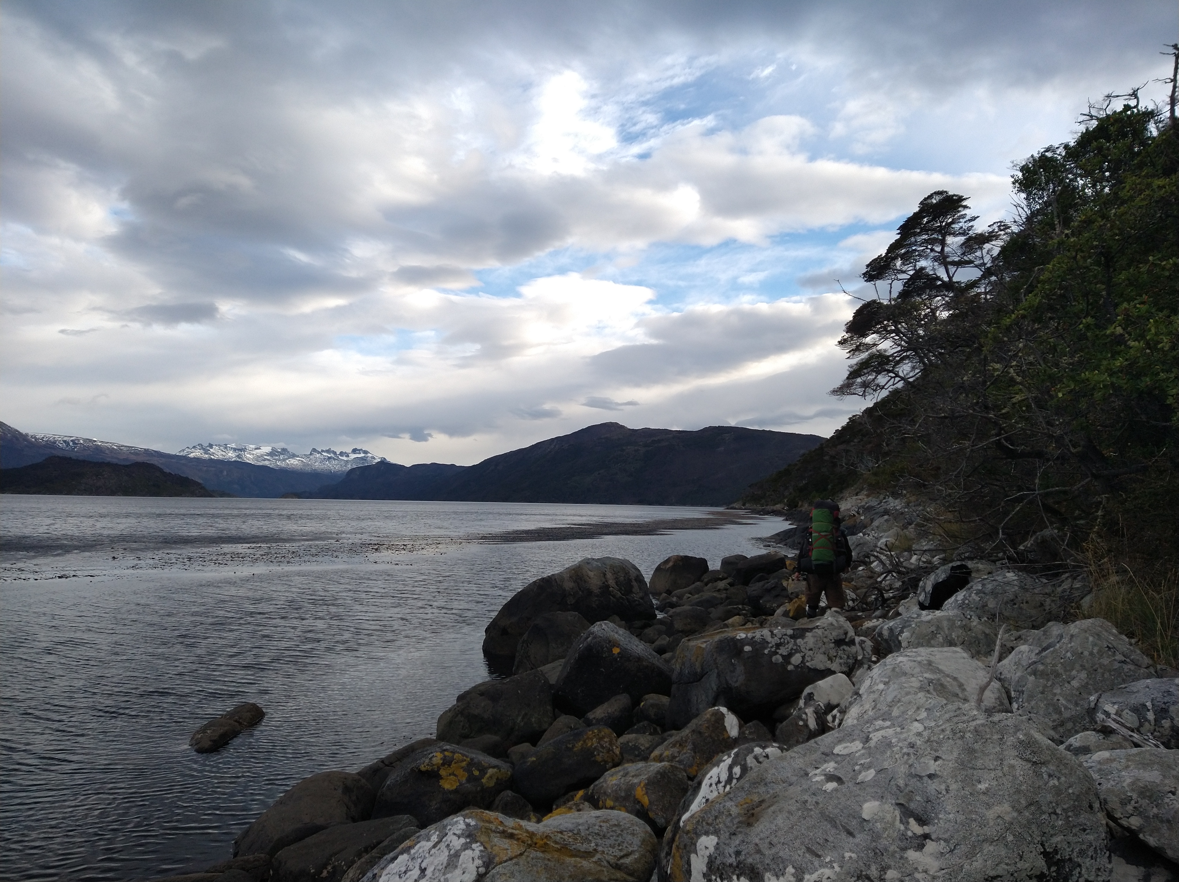 Over three days we skirted North to Puerto Inutil then due West to the coast. In the bay we found a plethora of jellyfish and some old whale bones washed ashore. I have no idea what kind of whale but it must’ve been huge! The vertebrae were bigger than my waste and ribs longer than I am tall. Sometimes we would scramble along the rocky shoreline, which seemed way better than stepping over fallen trees. Shadow turned out to be quite the climber and only needed help once on a downclimb. We were quite the adventure team.