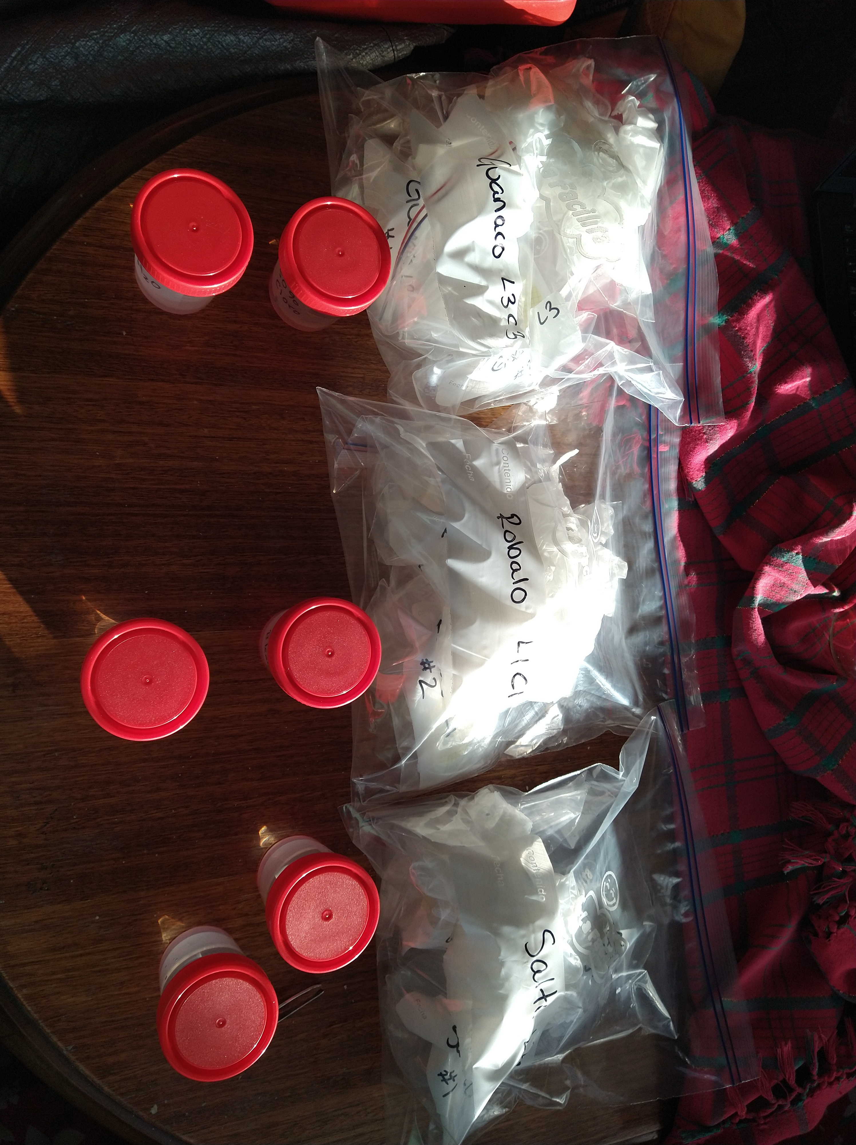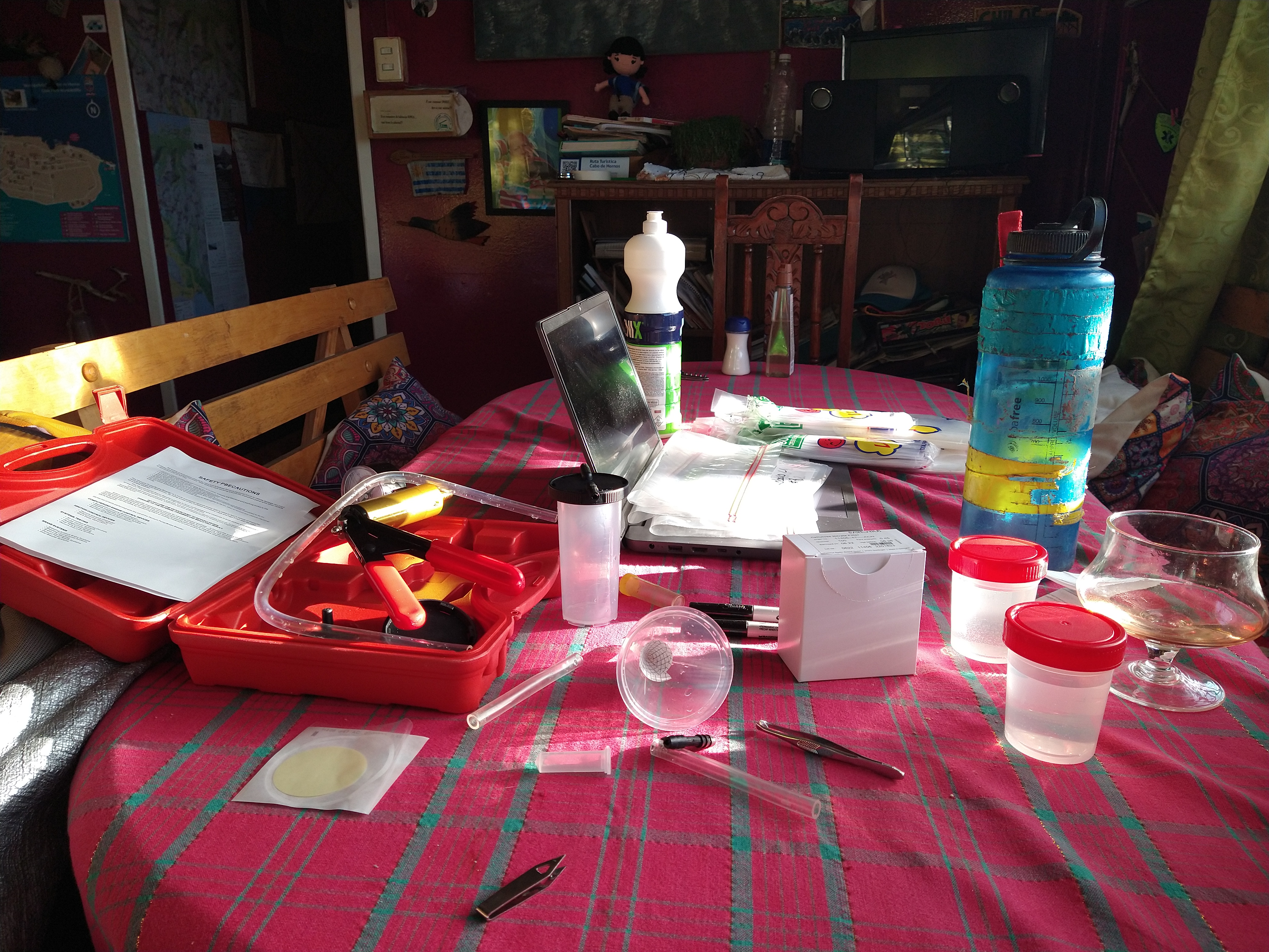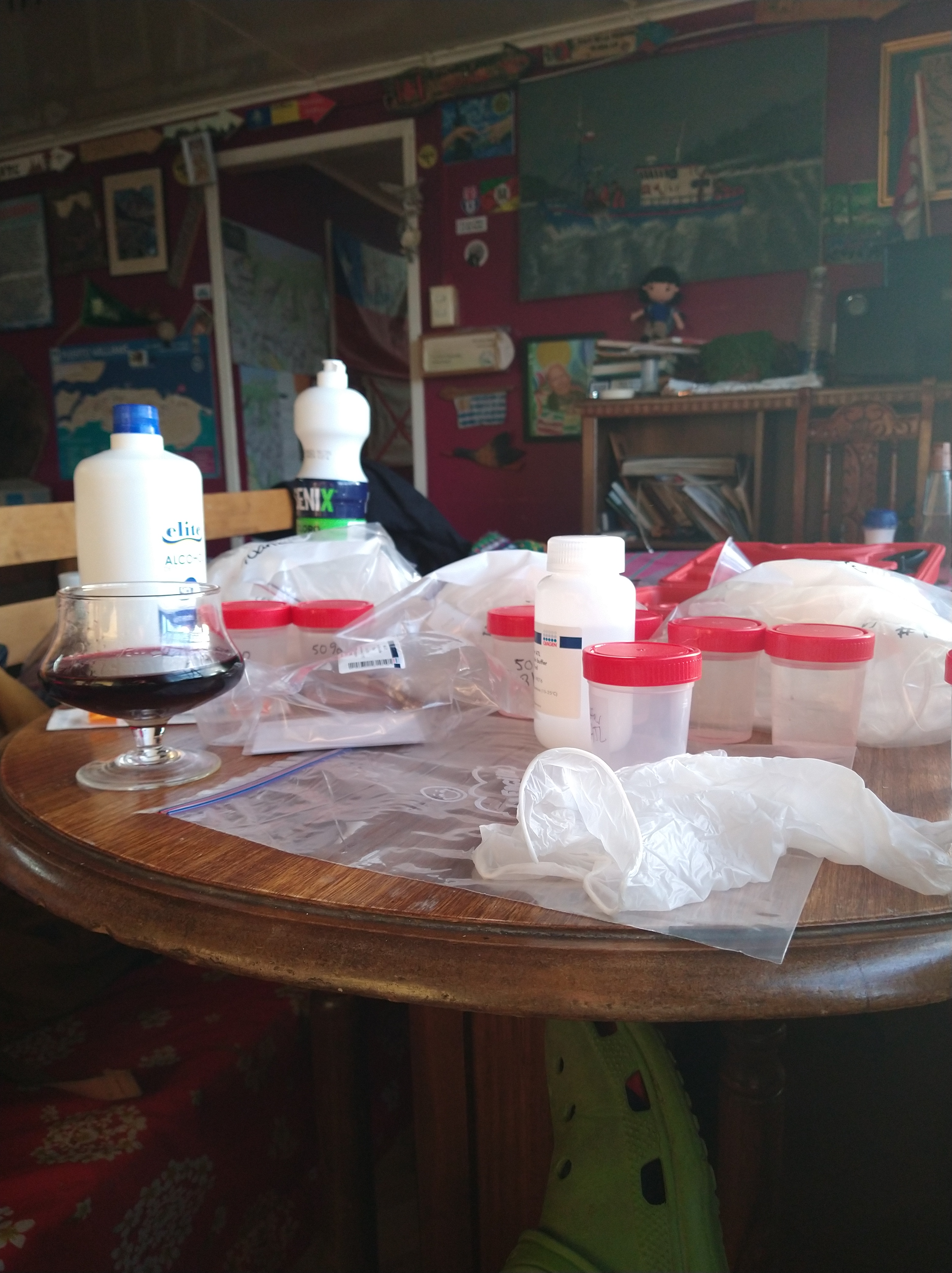 The trip with Navy to the other islands of the Cape Horn was quickly approaching, but we still had some time (and pressure) to start retrieving the cameras we had placed and collect water samples. We fine tuned our water pumping device and set up sampling kits on the kitchen table of the hostel. We would pump 3 liters of water (1 L per replicate, 3 replicates per site) at each lake or river site. The filters are made of cellulose nitrate and have 0.45 um pores for the water to pass through, but for cells to be collected. The fancy funnel filters cost more than the amount that the university could budget for this study so, like the pump, creativity was necessary. I could order sterile funnels and the filter papers separately for quite cheap. With the proper folding, the filters could be placed within the funnels and the funnels could be attached to the silicon hose that ran to the air tight water bottle, then to the brake pump. It worked beautifully, besides the fact that the filter paper was much more brittle than I assumed and usually broke into four triangular pieces that I would then fit into the funnel. After the liter of water was passed through the filter, the paper would be carefully folded with sterile tweezers and placed into a prepared tube (also done on the kitchen table) with a lysis buffer that preserves the DNA. When this buffer is cold, it forms a precipitate, so before adding 1 ml of buffer into each tube, it had to be heated to about 56C. A kitchen pot with some luke warm water sufficed. If there’s a will, there’s a way.