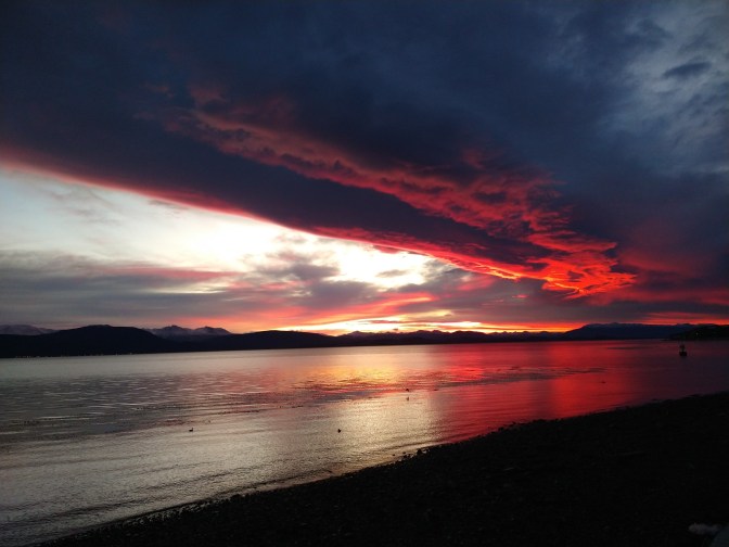The next morning, we broke camp in the cold and quickly hightailed it out of the shady forest. We found a good spot for the camera trap on our route North, and quickly set the camera and tuna lure after so much practice. It seemed quicker to use the waders/wellingtons along the coast again, and in no time we hit the northern shore of the lake to where the cow trails would lead us to Caleta Eugenia (the end of the road). We still had the usual beaver dams to navigate through, but to our surprise we breached the forest and saw the grassy slopes down to the Beagle Channel in no time. We made our way to the road, dropped our packs, and collapsed on the shore. This one was a toughy. From the schedule we took a photo of on the door of the hostel, the bus would be arriving around 4:30 PM, so we had a couple of hours to enjoy the sun and eat the last of our snacks.