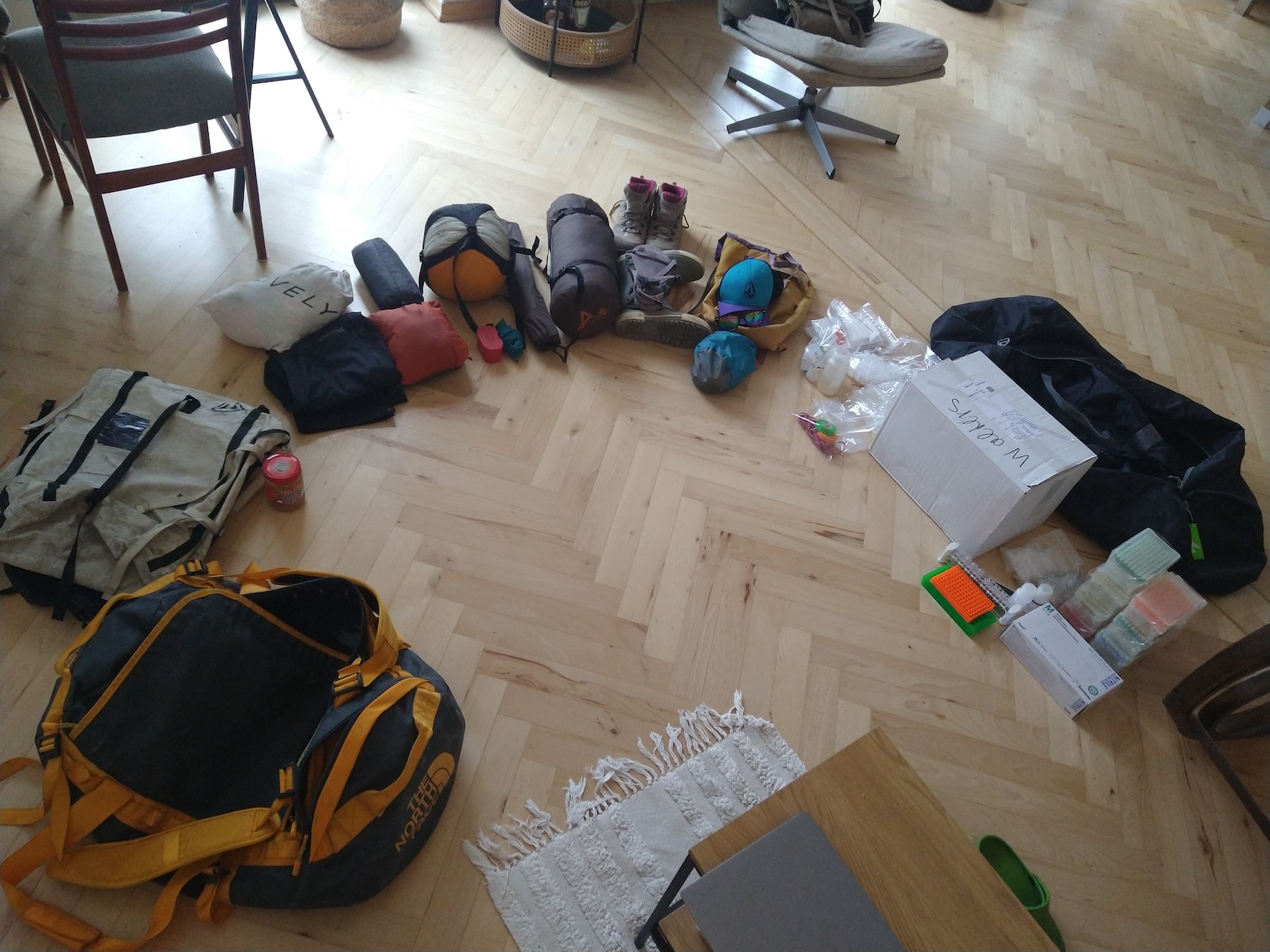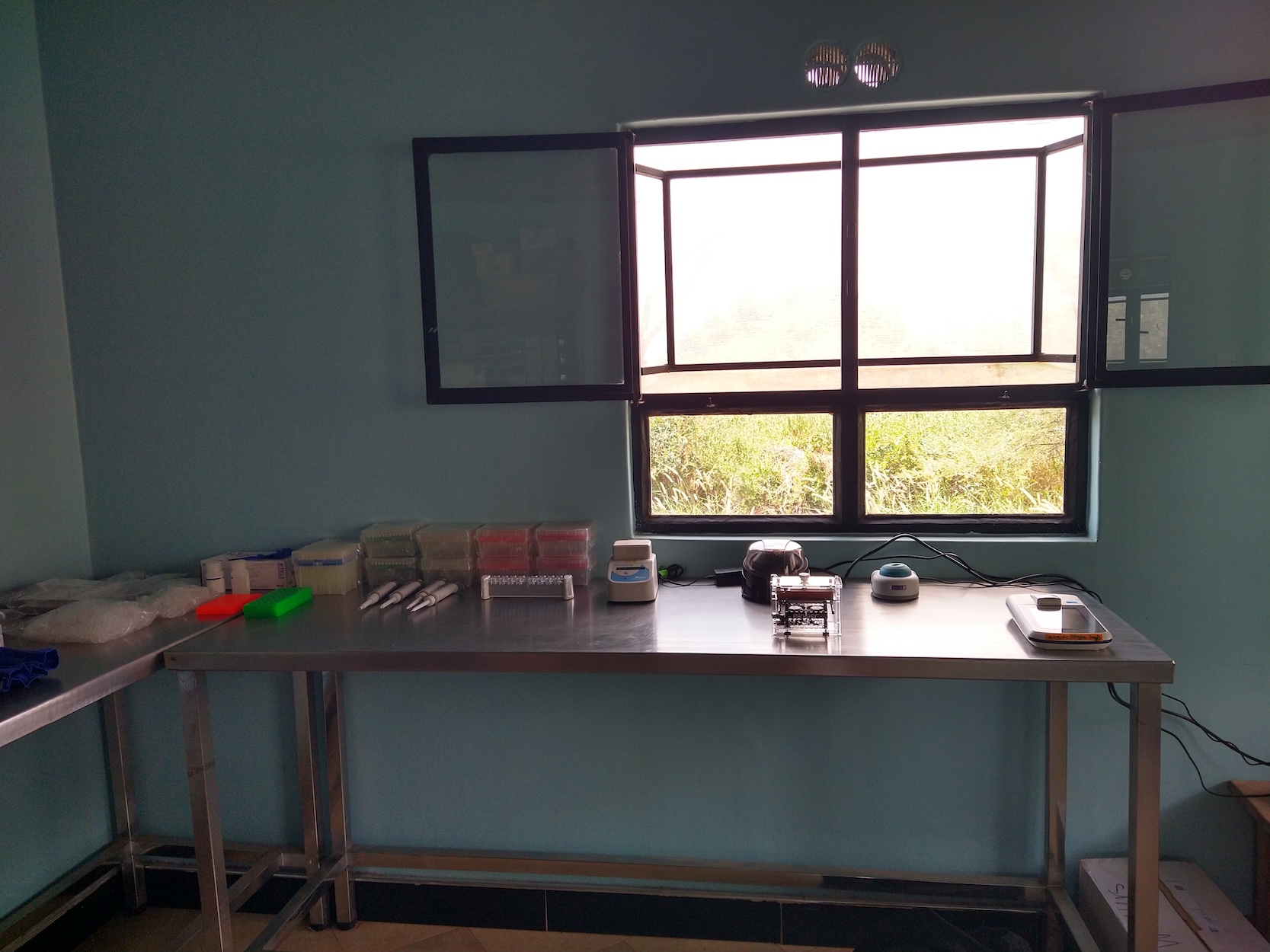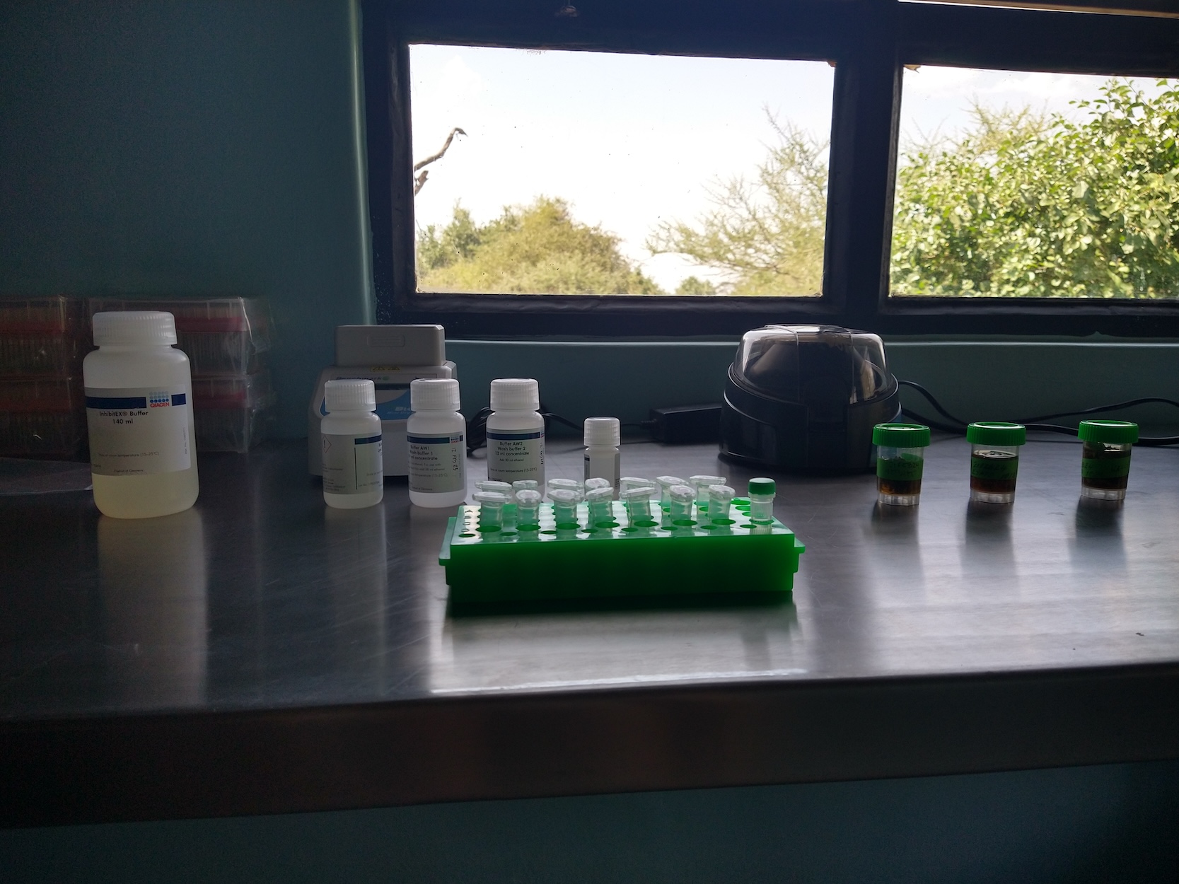The flight from Germany to Kenya is about 9 hours. I would be bringing in chemical reagents (on ice) that I would need to run this protocol. These buffers/solutions are not necessarily restricted, however with customs it’s always a game of chance on who you get to search your bag. A cooler full of frozen tubes labeled with science jargon may not be what the TSA agent wants to find. While packing, I placed a styrofoam cooler with the ice packs and frozen tubes in my bag, with supplies like tubes/tips/gloves around it. Then I added my field clothes around that to sort of pad everything. I’d also be bringing a separate duffel bag full of trekking supplies since I planned to meet up with a friend from South Africa after field work to trek on Mount Kenya. Finally, I’d bring a small daypack with my work laptop, the MinIon sequencer (mini USB DNA sequencer that makes this all possible), and other electronics I’d need.