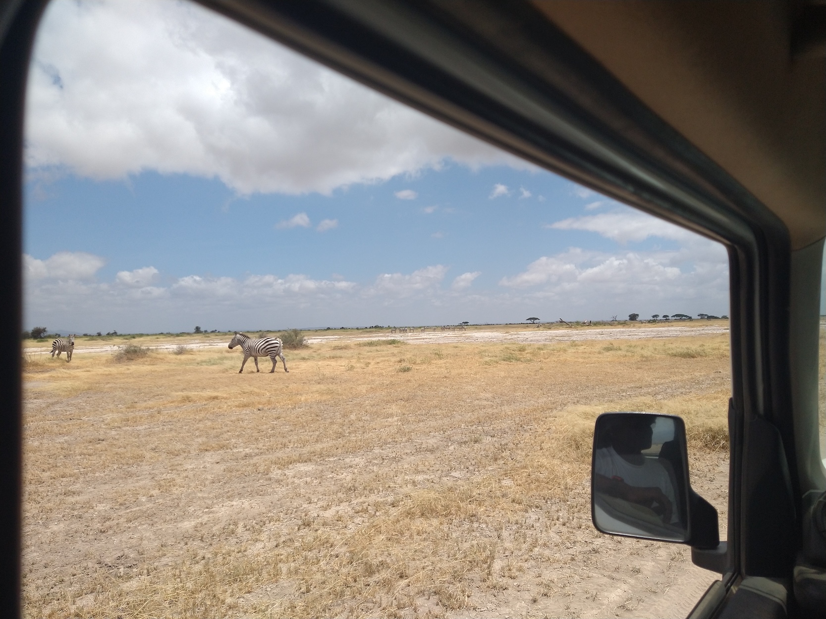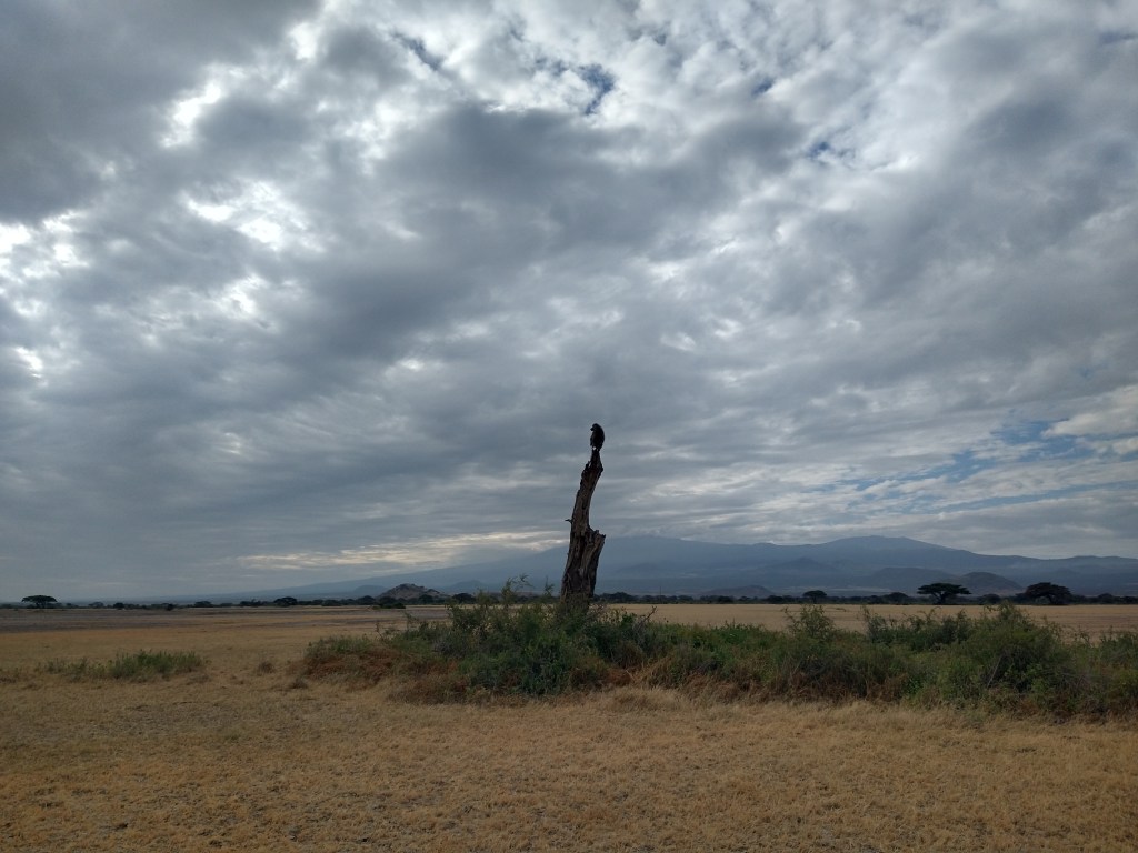 When the plane started up it jerked forward with power, almost like holding back a horse before giving him his head for a full gallop. We queued in a line, lots of flights were flying out in the mornings. Eventually it was our turn and the plane galloped ahead and launched in to the sky. It was cool to see how the pilots used the controls and what altitude we were reaching. We flew low across the plains, then up into the clouds. As we made our way Southwest, Mount Kilimanjaro appeared ahead. Still slightly snowcapped, but I later learned much of the glacier melted and was perhaps why the Amboseli valley was so flooded this year. It felt like as soon as we reached altitude we were on our way back down to our first stop to drop off some people for a safari. I had assumed this would be an airstrip but as the ground was quickly approaching, I finally noticed a dirt track we’d be landing on, how wild! Half the group got off the plane to load in to a safari truck, then we turned around and took off from the bumpy track again.