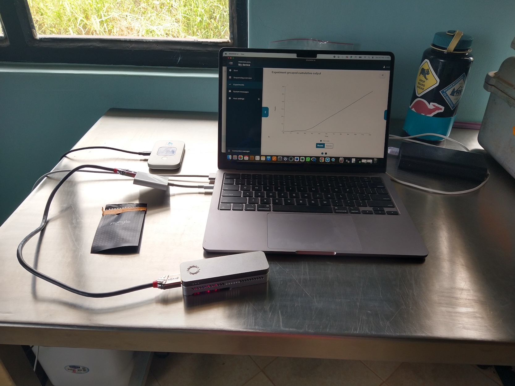 After lunch it was time for lab work and I would hide away from the strong sun in the little lab doing my experiments. It was still quite warm inside, I tried not to get any sweat into my reactions. Over those afternoons I extracted DNA from the fecal samples using a kit I brought down from Germany and some basic lab equipment like a mini centrifuge and heating block that were already there. Then, once I had the DNA, I would amplify it (make copies of regions I wanted) using a thermocycler in which the program ran off my phone, over Bluetooth! For the polymerase chain reaction to occur and for DNA to amplify this process needs to be repeated 1) the DNA needs to be heated up to 95C to denature it (separating the double strands) 2) cooled to a temperature ~55C where a primer (a short single stranded DNA fragment that is designed to bind to the start of your target DNA fragment) adheres to the DNA strand and 3) brought up to a temperature ~72C for an enzyme called taq polymerase to add bases on to the primer and complete the complementary strand of DNA. These cycles are repeated multiple times (~35 cycles) to generate many copies of DNA. The fact that there is a tiny machine that I could do this on, and run it off my phone, is amazing! Now that I had tons of copies of regions of the baboon DNA, I could sequence them and find the areas of mismatch to tell individuals apart as well as their relatedness. That’s where the little USB powered sequencer came in and, after a day of preparing the copies of DNA generated from 30 indivudal baboon samples, I was sequencing on my laptop, offline (not connected to internet) and generating gigabytes of sequencing data. The run was 24 hours long and with the wifi connection on site I could send the sequencing data to my colleague back in Germany to analyze. Wild! The analysis is still being developed, so it’s not quite complete yet. But my hope is that once the bioinformatic pipeline is established I can learn it and run it on my laptop on site… but I am not a bio-informaticist so it will have to really be fool proof before we can get to that point.